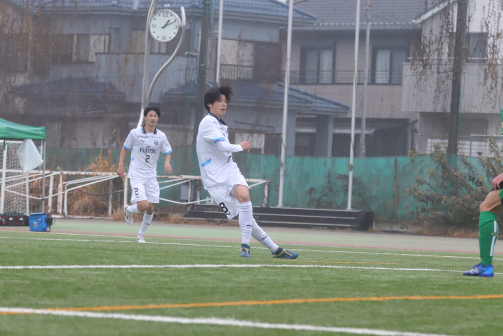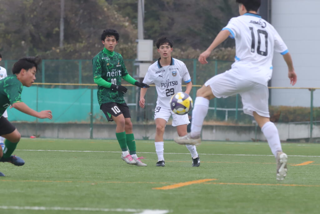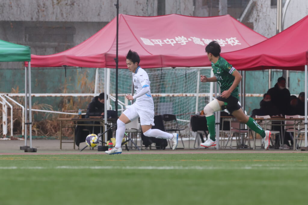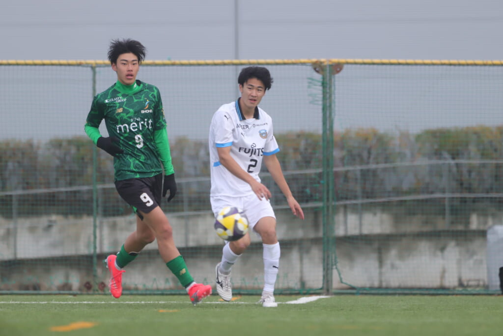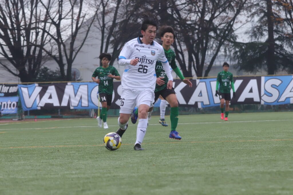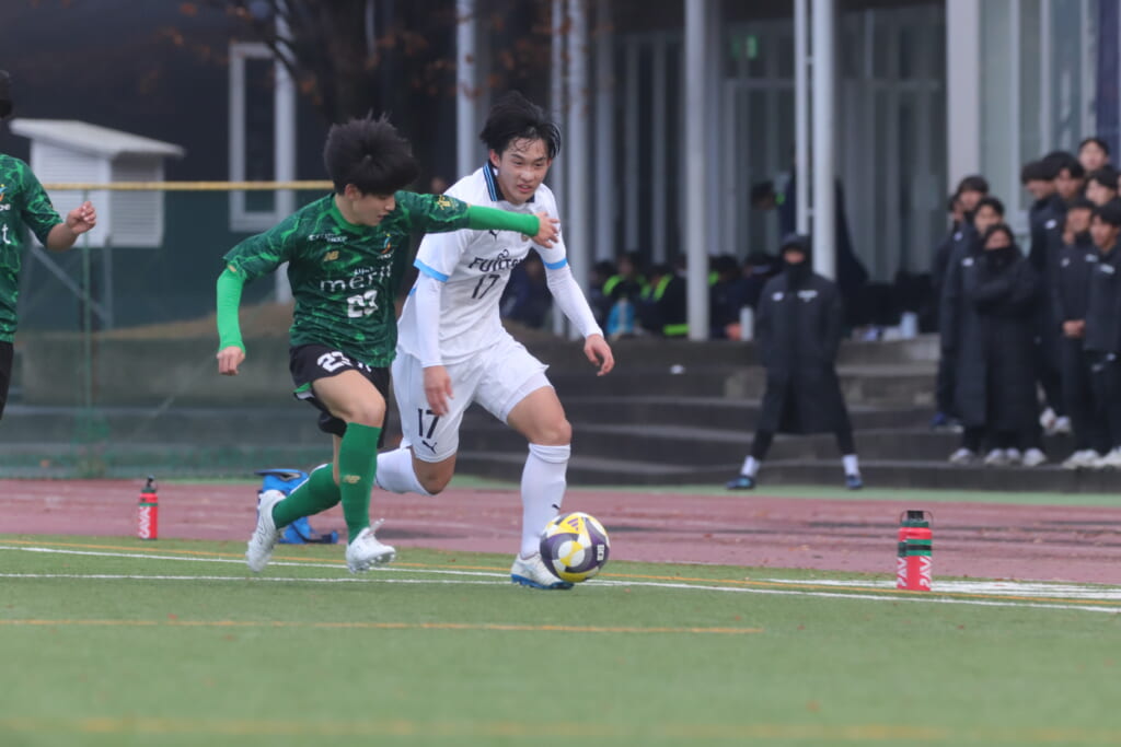 フロンターレの左コーナーキックとなり、それをしのいだ昌平高校は、古川が前に持ち込んでいきますが、フロンターレは関、さらに小川尋斗がカバー。