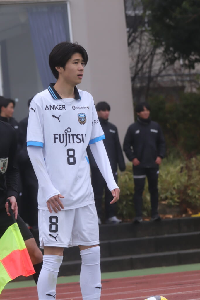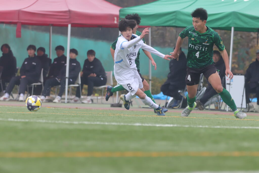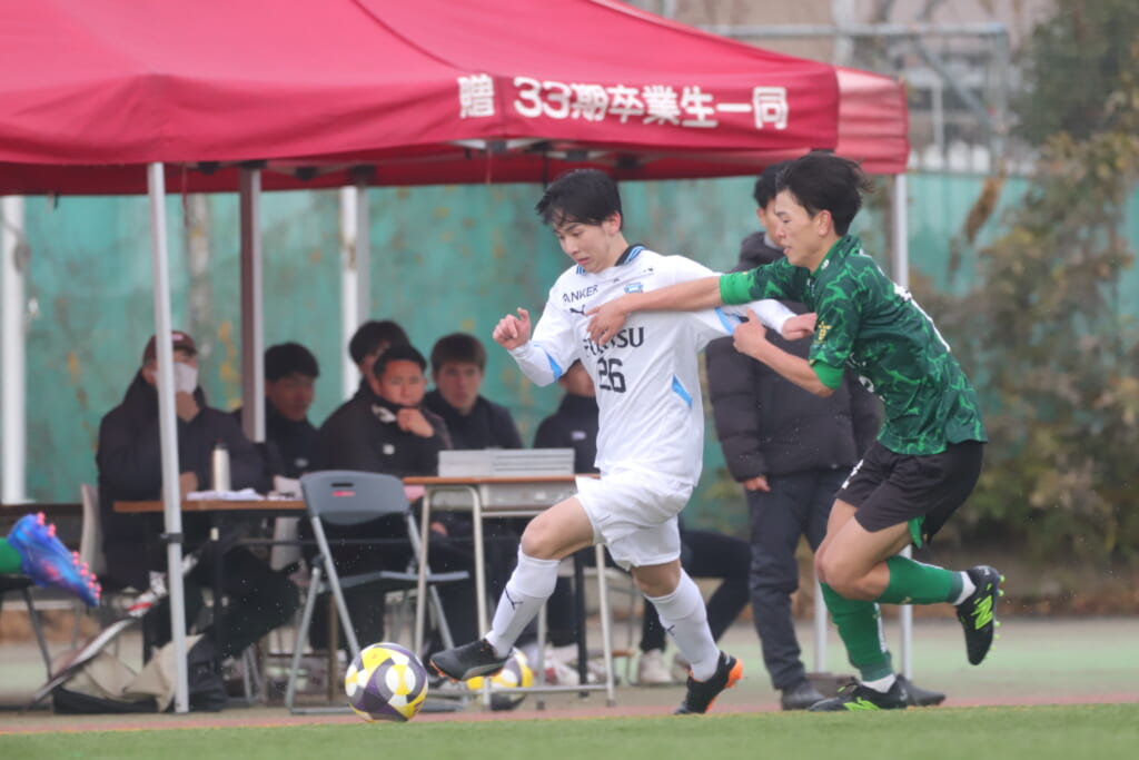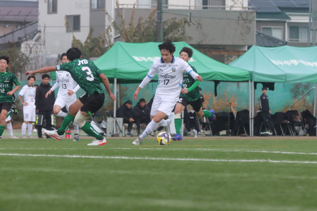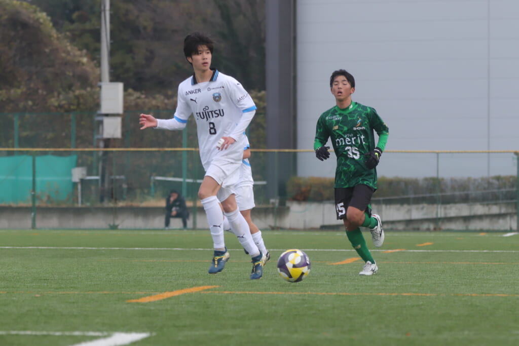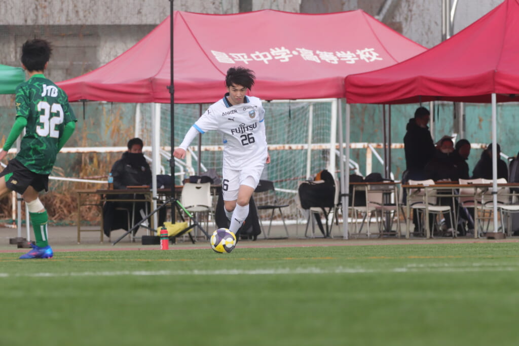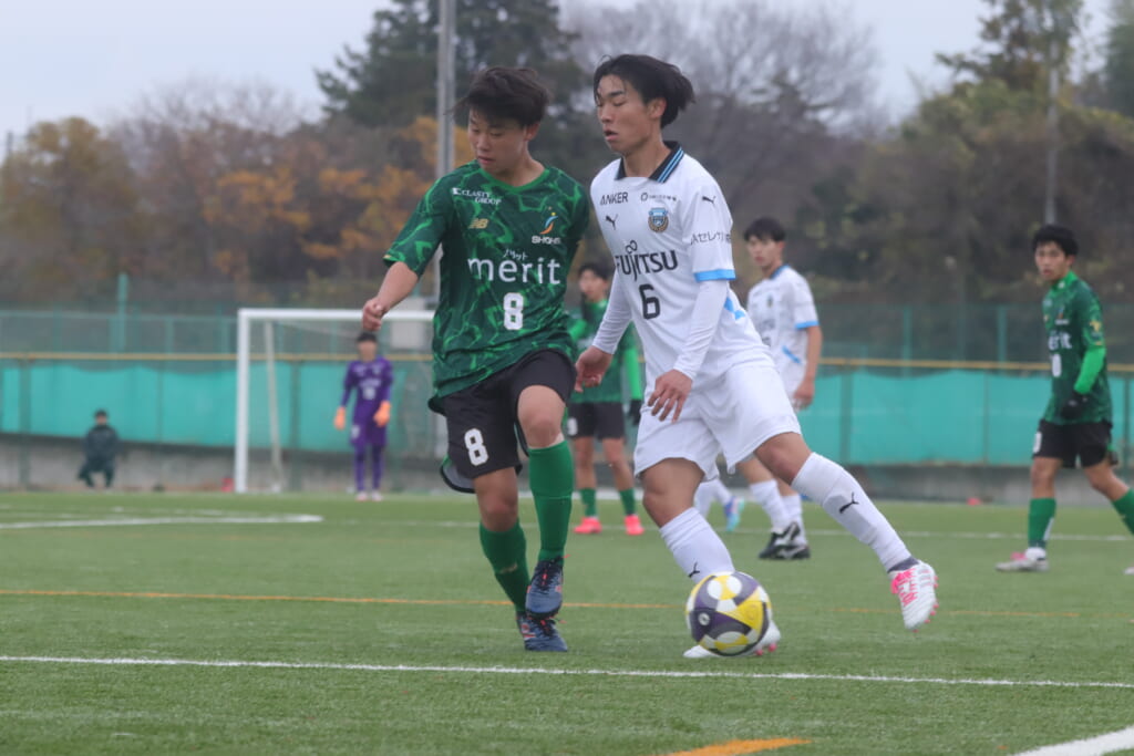 フロンターレの左コーナーキックとなり、それをしのいだ昌平高校は、古川が前に持ち込んでいきますが、フロンターレは関、さらに小川尋斗がカバー。