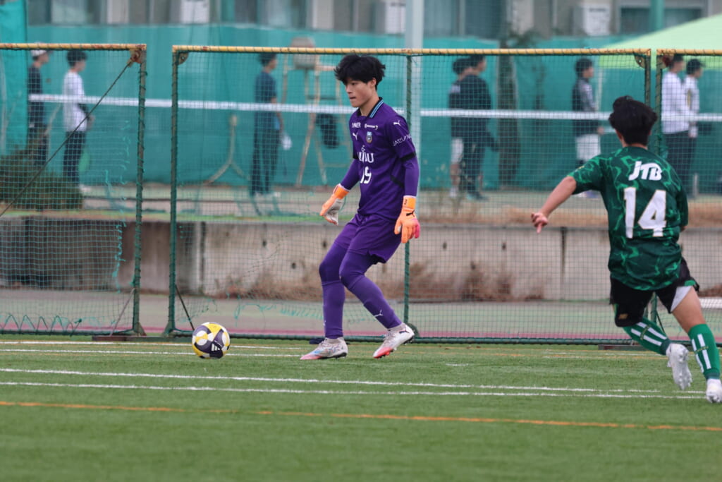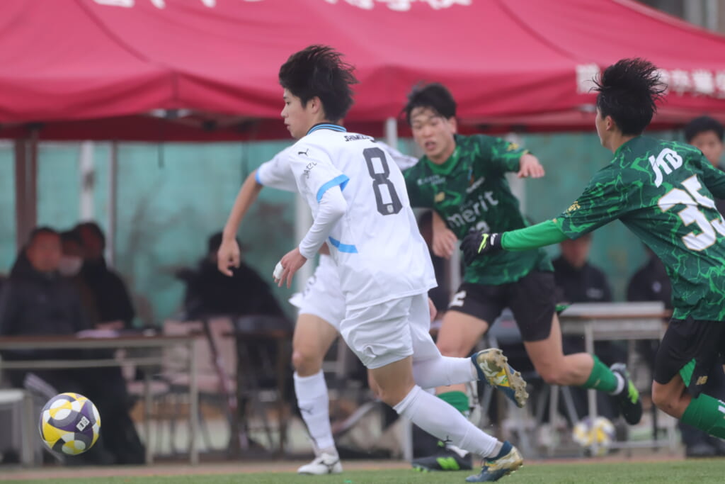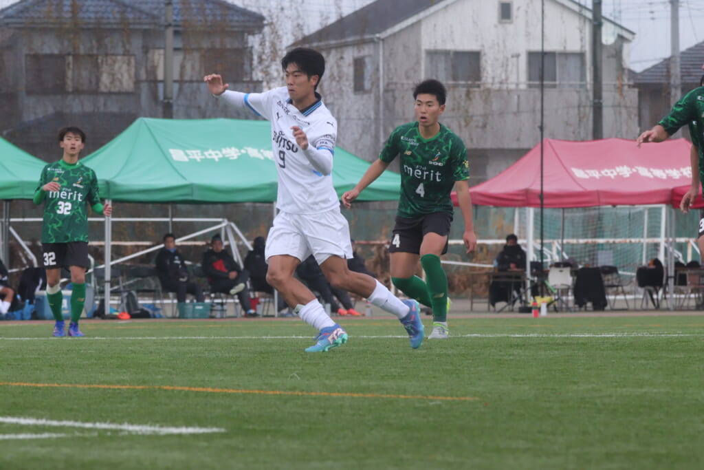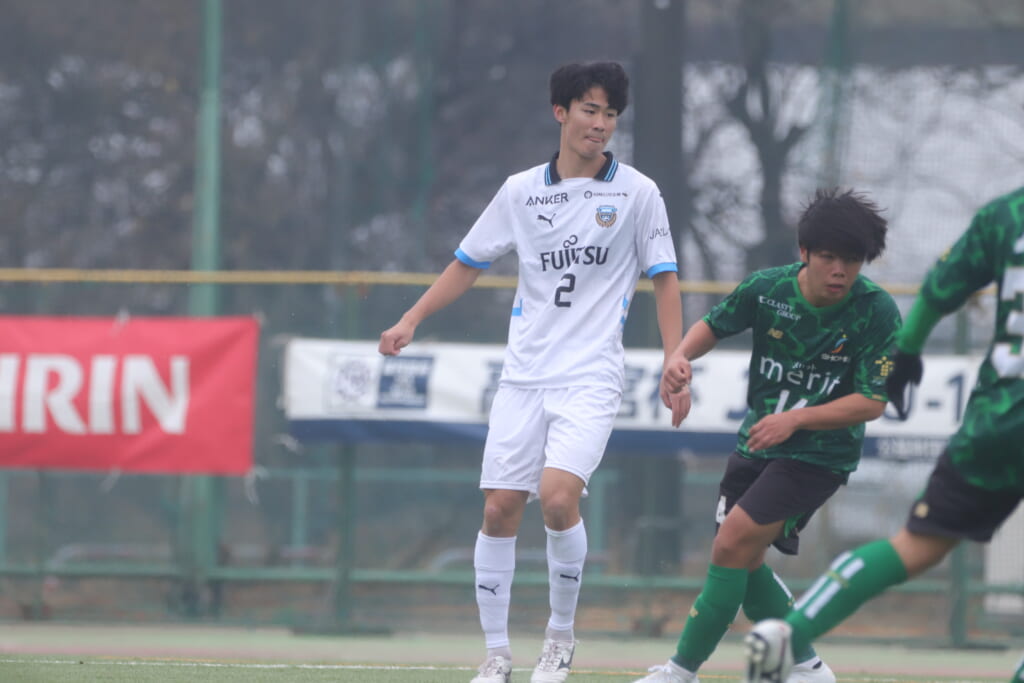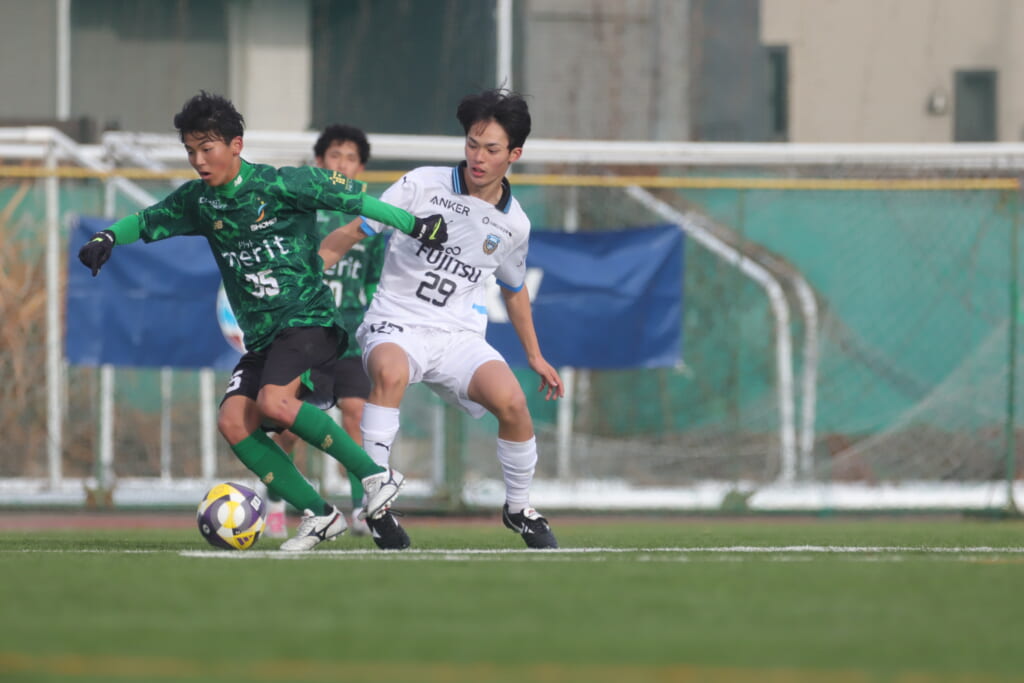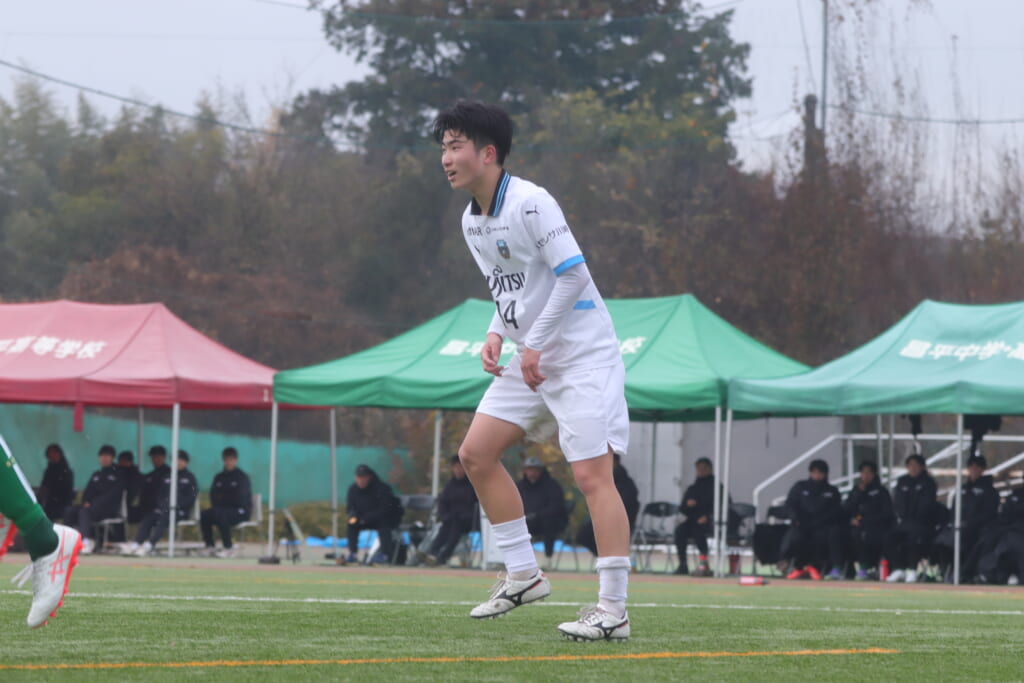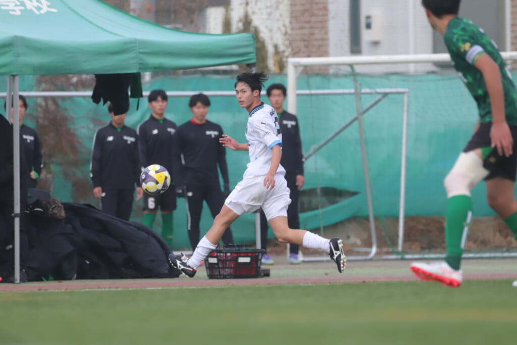 フロンターレの左コーナーキックとなり、それをしのいだ昌平高校は、古川が前に持ち込んでいきますが、フロンターレは関、さらに小川尋斗がカバー。
