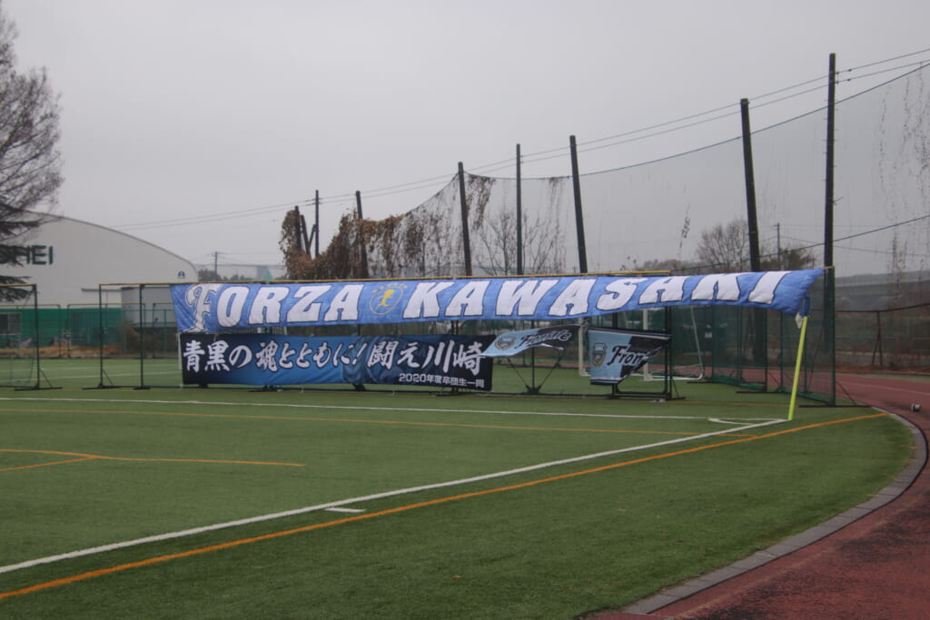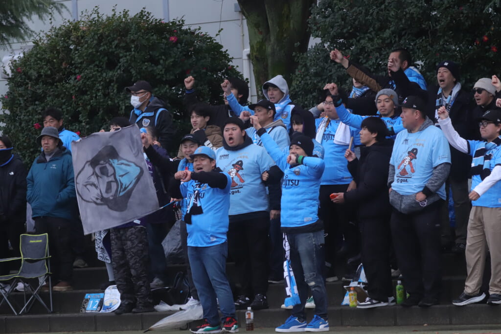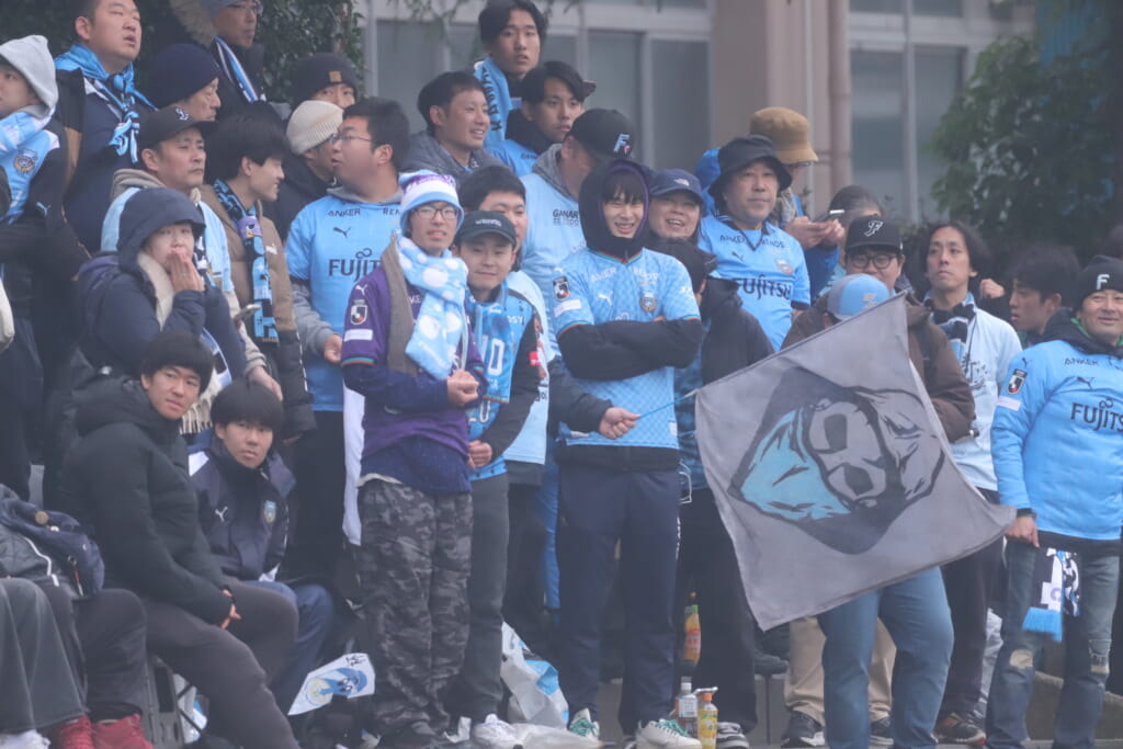 フロンターレサイドのゴール裏には、多くの青い幕が張られ、それぞれにチャントを歌い、選手たちの名前を呼ぶ。
