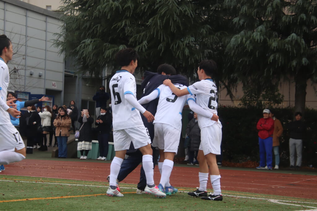 全員で勝ち越しのゴールの喜びを分かち合います。