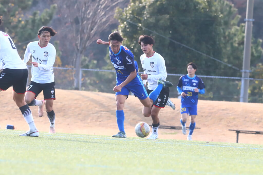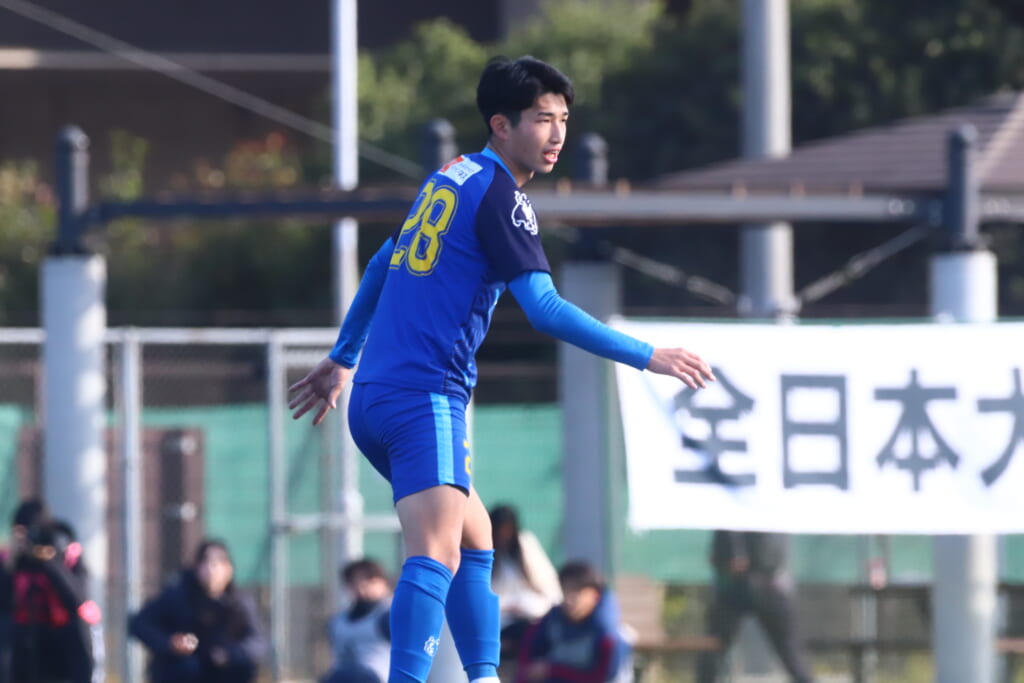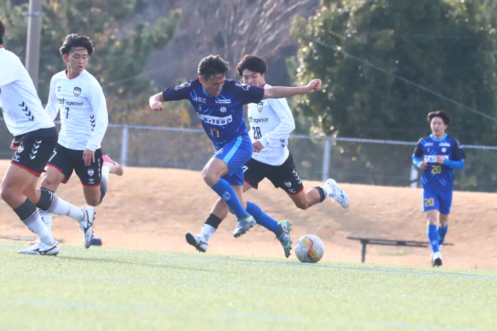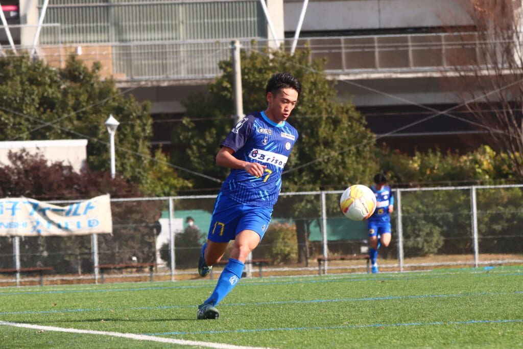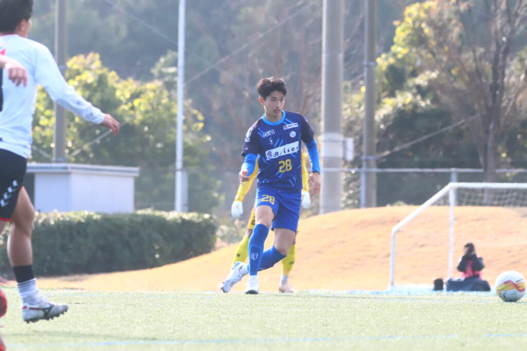 しかし、27分には京都産業大、小野のフィードを皿良がおさめ右サイドへ展開。滝口がクロスを入れると正面でうまくおさめ、シュートを打ったのは福永。