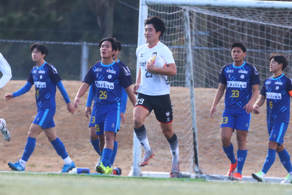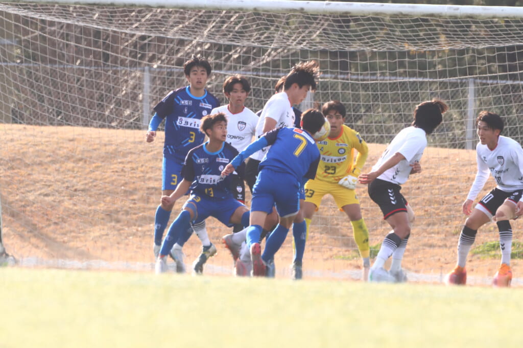 京都産業大がゴールに迫る時間が続きますが、桐蔭横浜大の体を張った守りが上回っていきます。