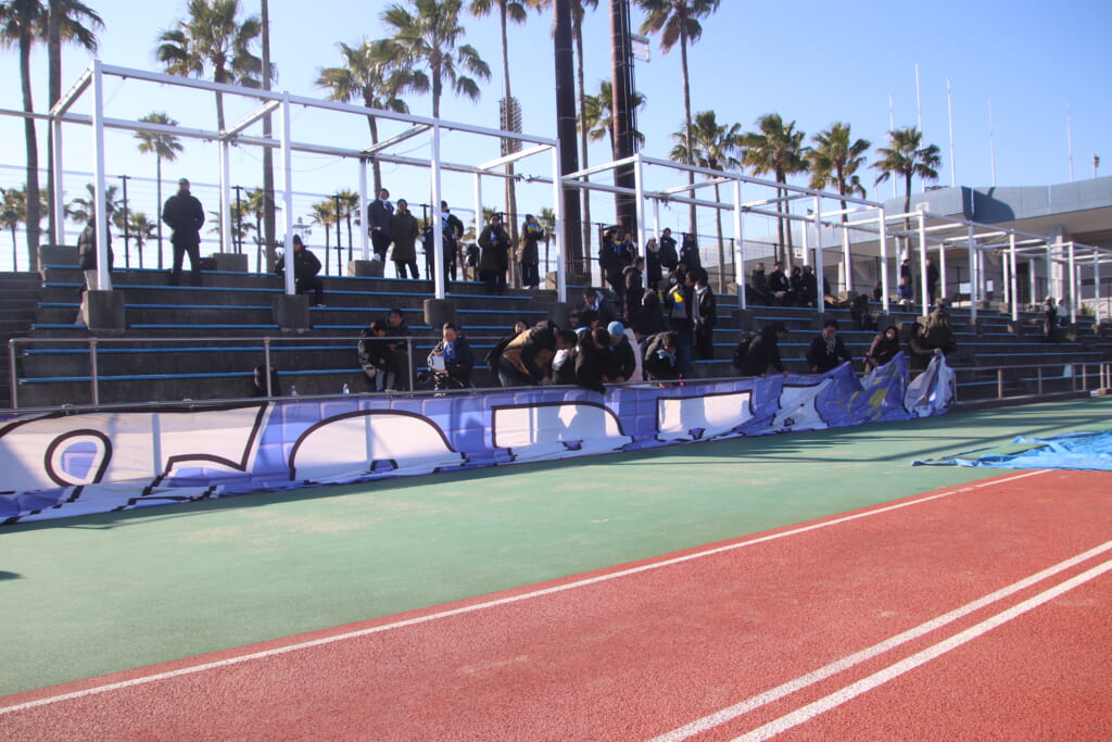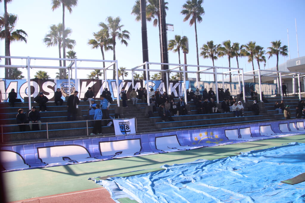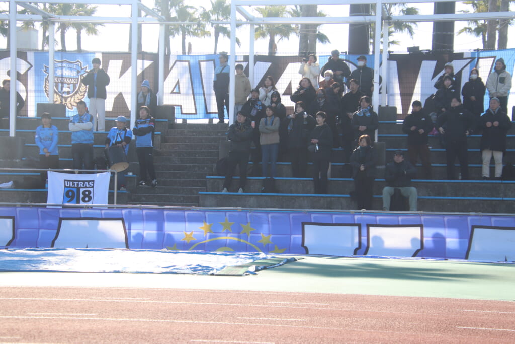 選手の家族らに加え、フロンターレのサポーターも集まり、多くの幕を掲出。フロンターレの家族やサポーター、レジスタFCの家族らもそれぞれがチャントを歌い、選手たちの名前を呼ぶ。