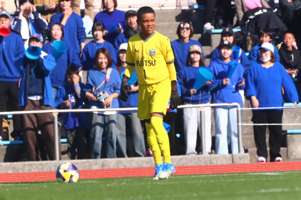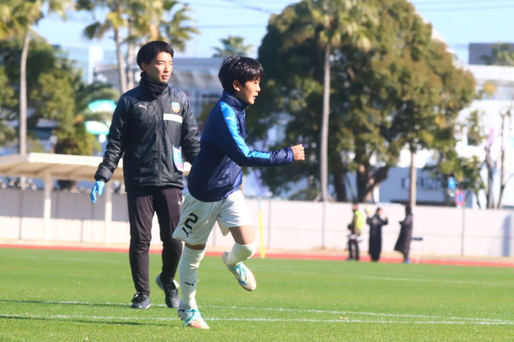 立ち上がり、フロンターレは成瀬から右サイドへ展開。そこからレジスタFCのエリア前に斜めに速いボールを入れていきますが、レジスタ、熊井がクリア。