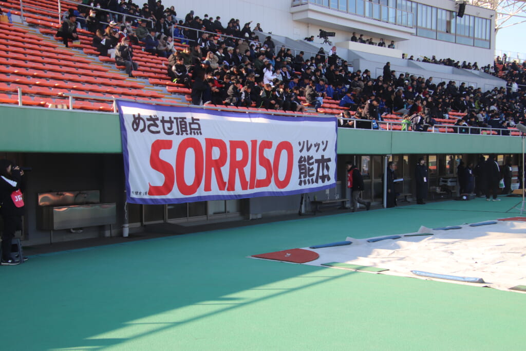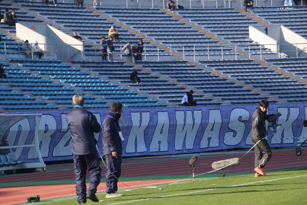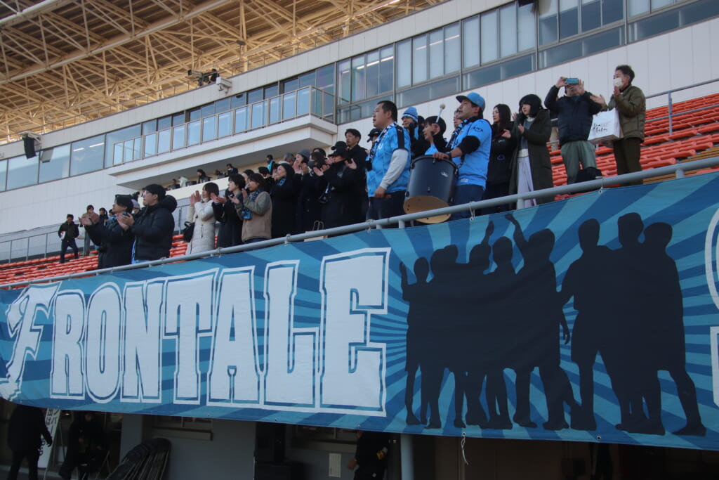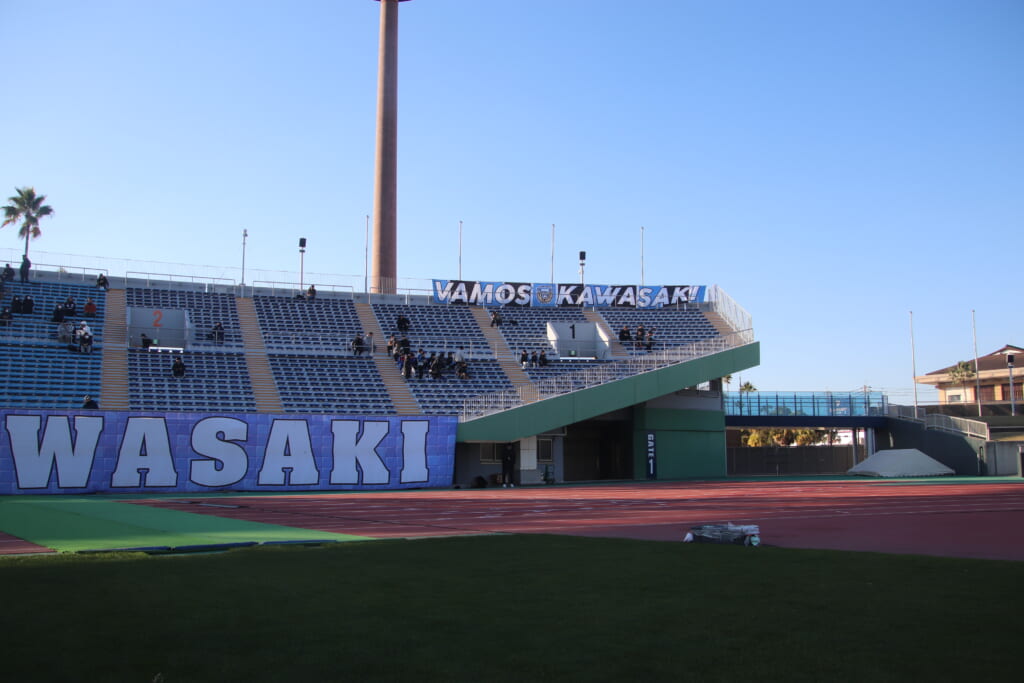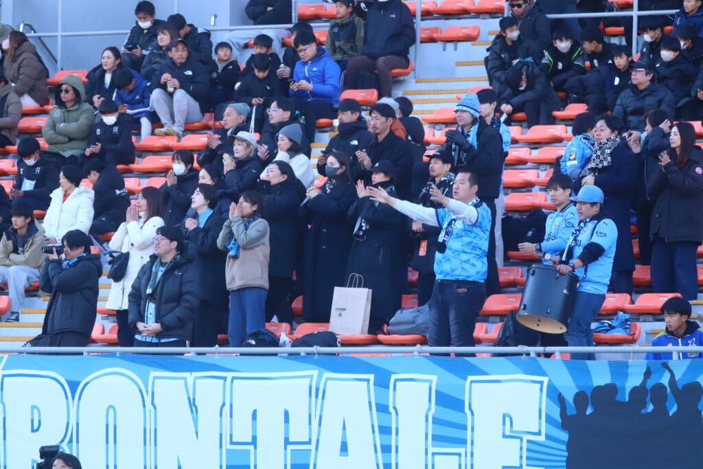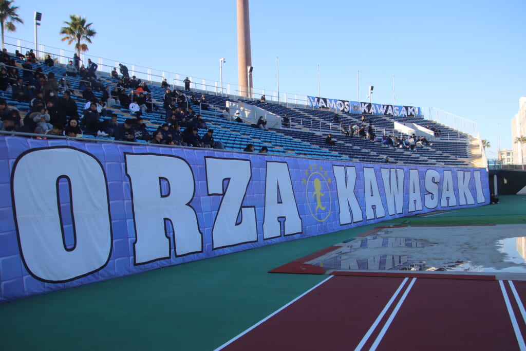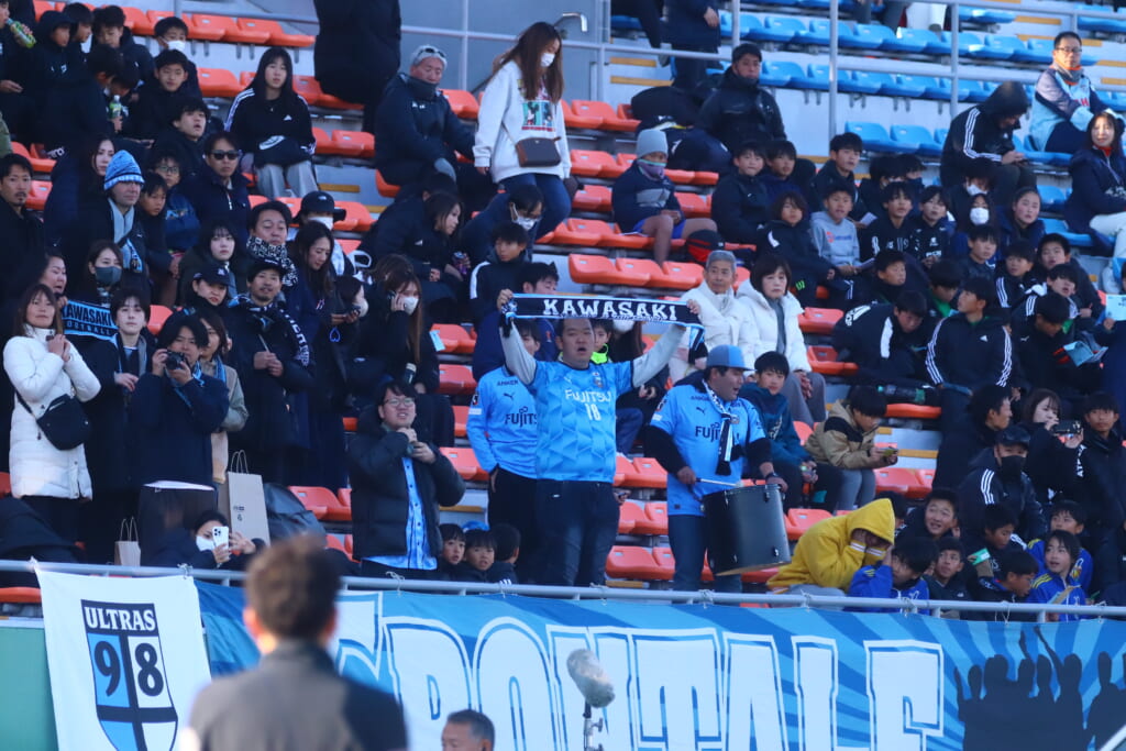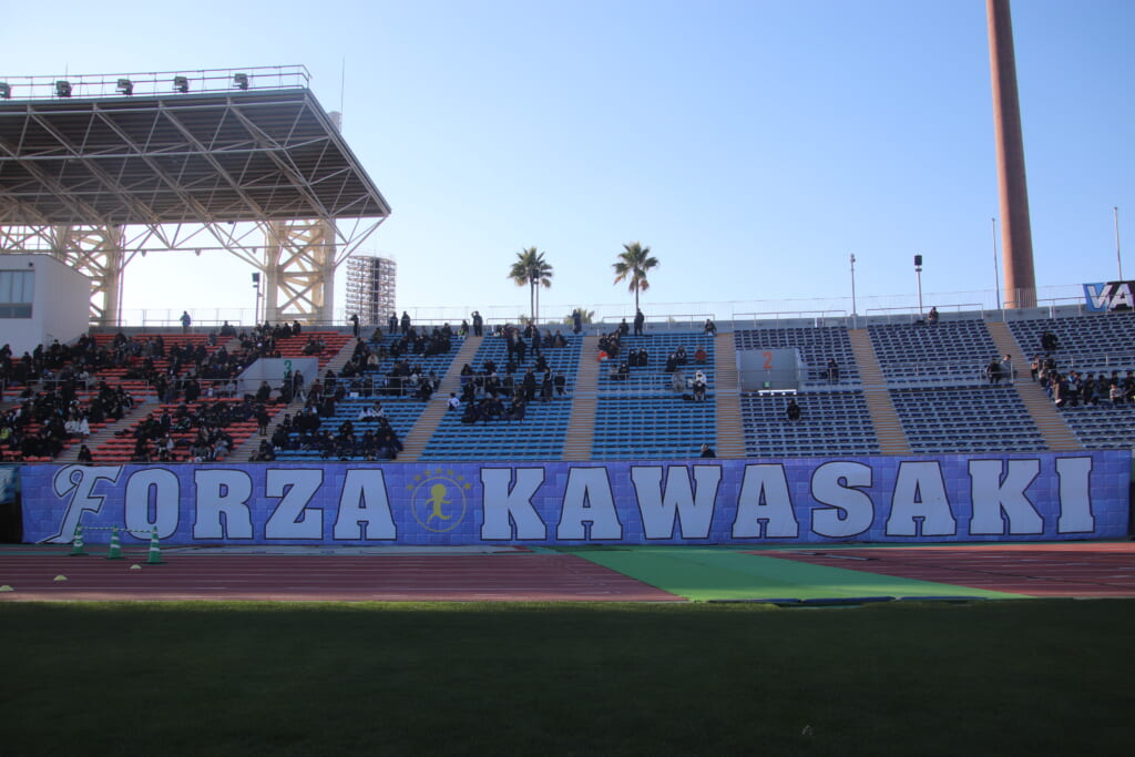 青空が広がった好天の白波スタジアム。両チームの選手の家族らに加え、フロンターレのサポーターも集まり、フロンターレもソレッソもそれぞれに幕を出し、チャントやコールなどで声援を送る。素晴らしい雰囲気の中、キックオフの時を迎えました。