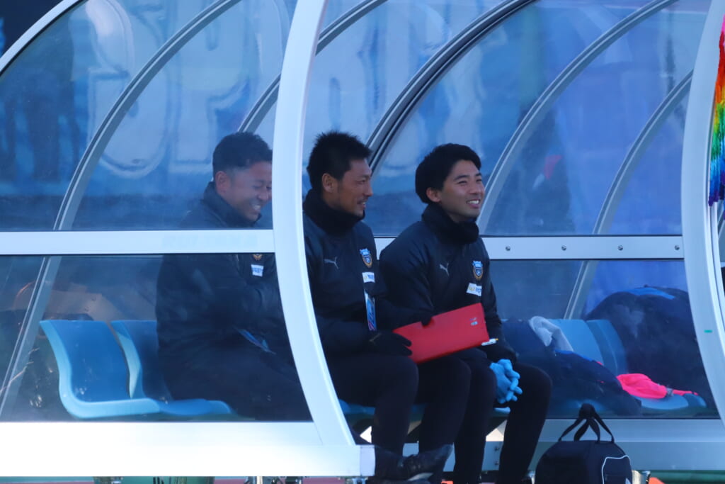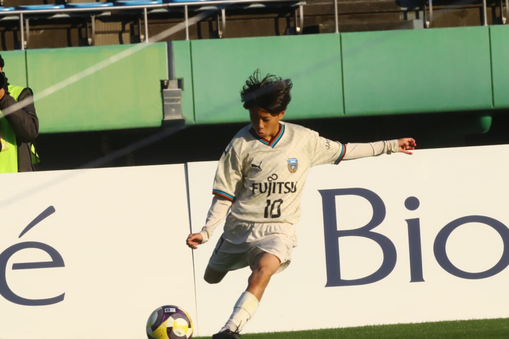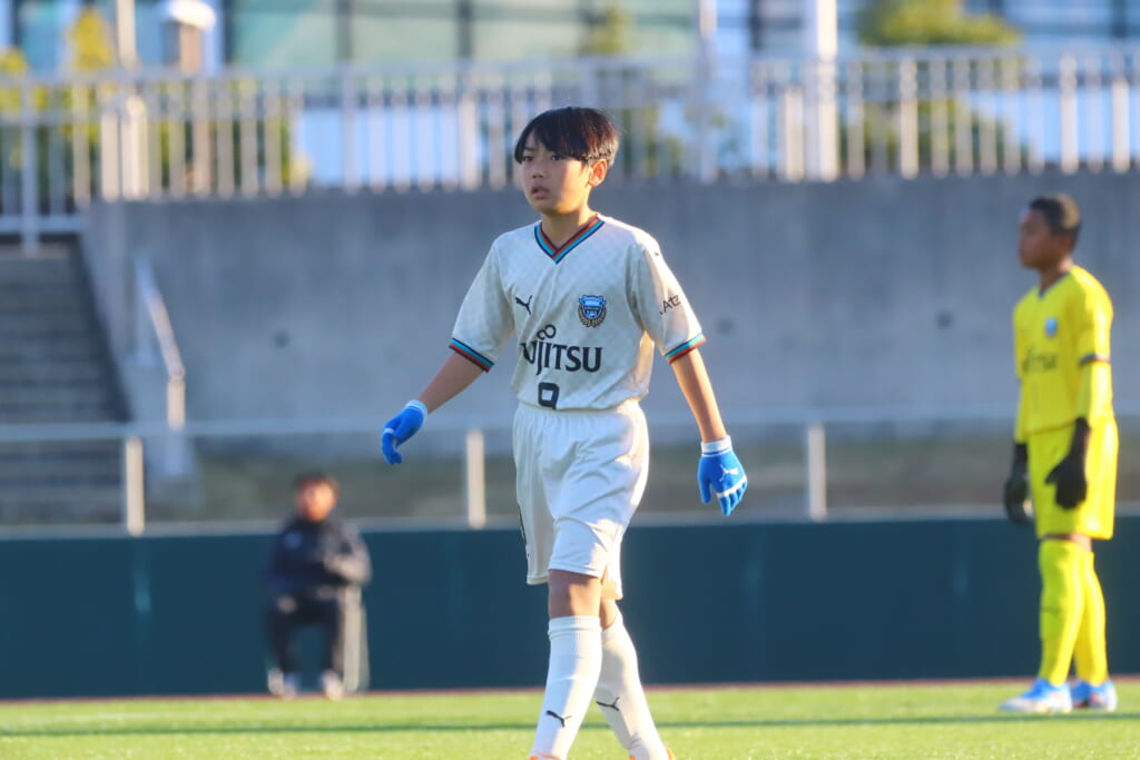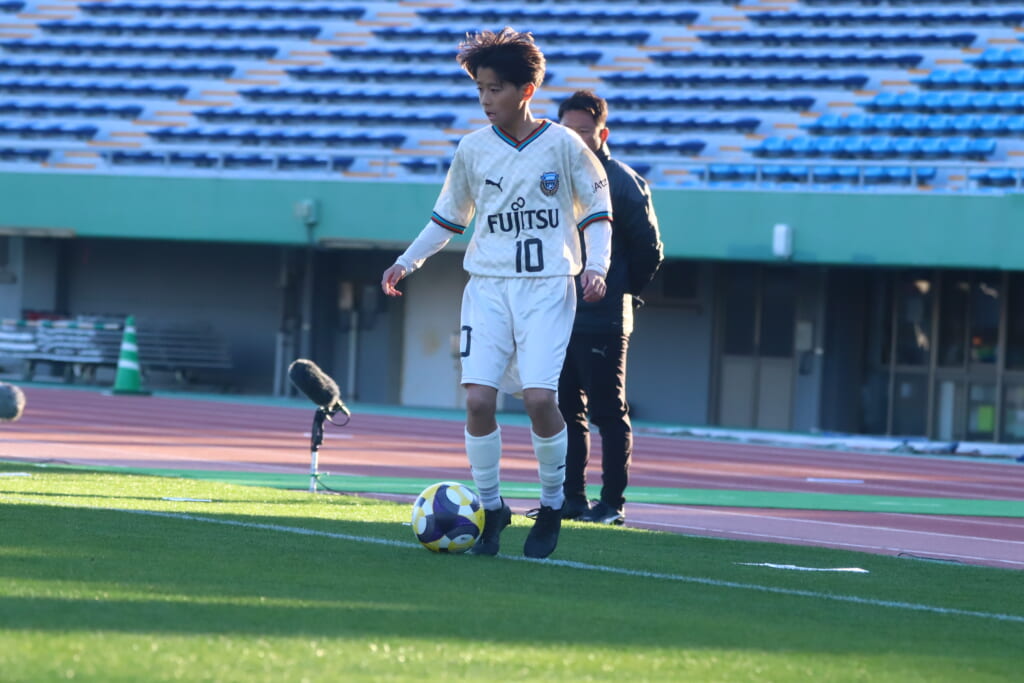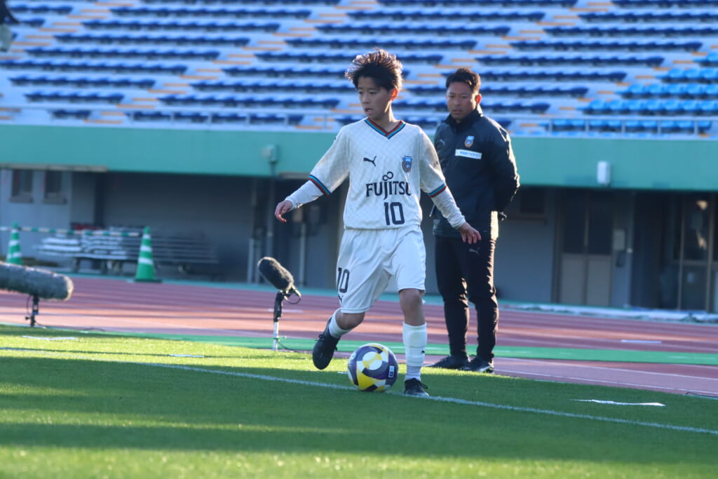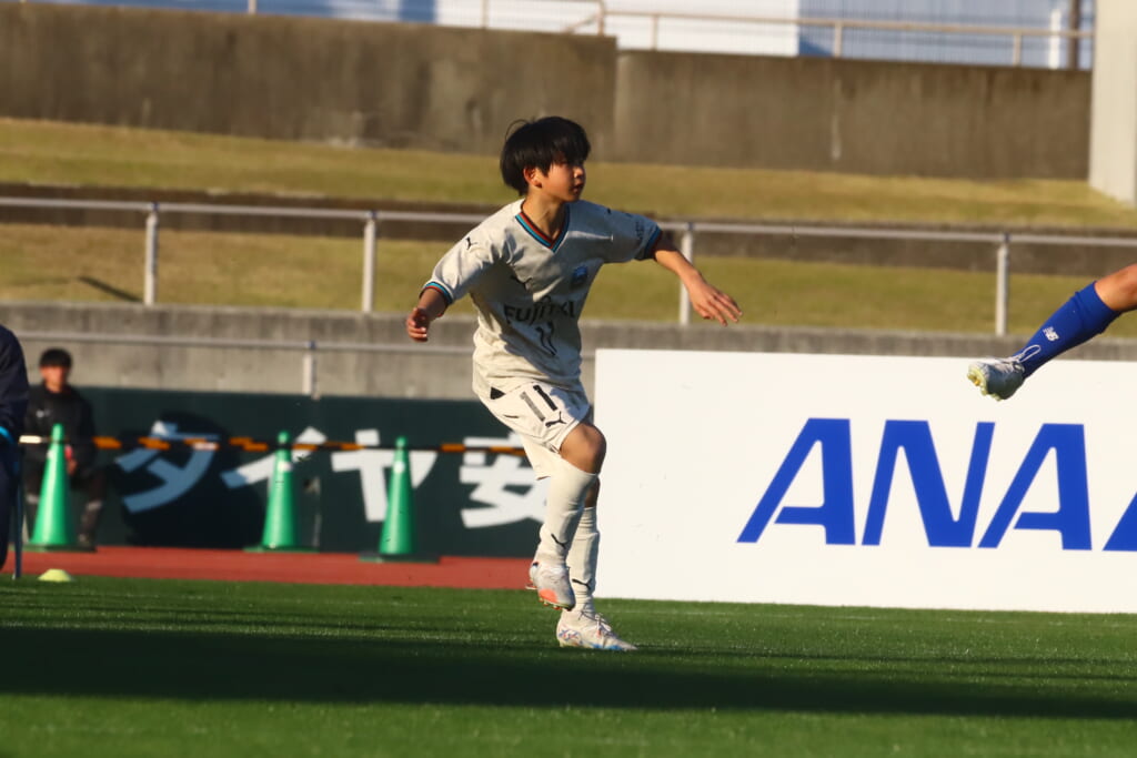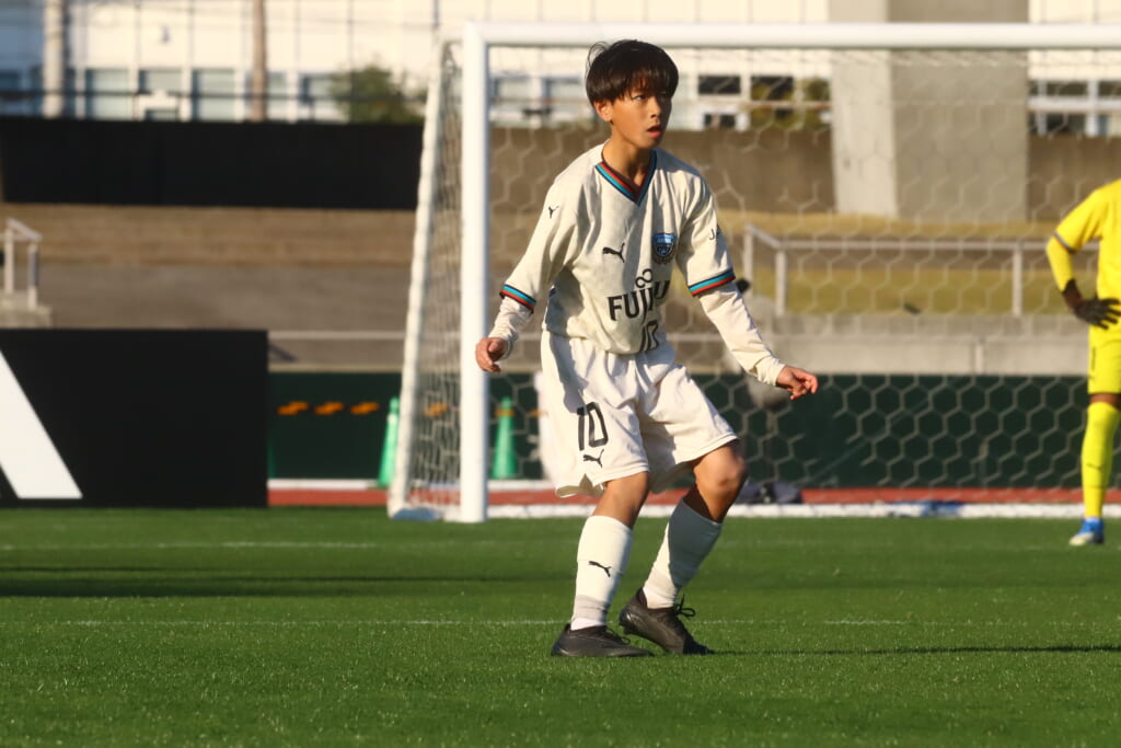 フロンターレの先発は、GK1チケ立野オケチュク、最終ラインは3山村兜馬、キャプテンの5下地勇人、中央に10新堀葵、13戸部心暖、右に11桑原大河、左に6岡西春樹、前線には崔雲沧。