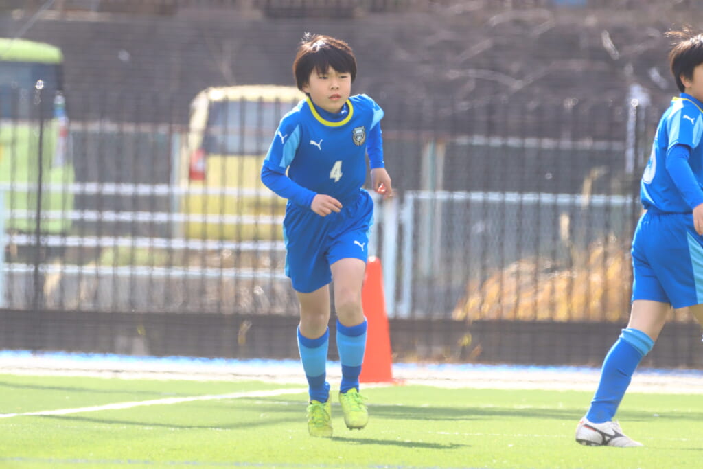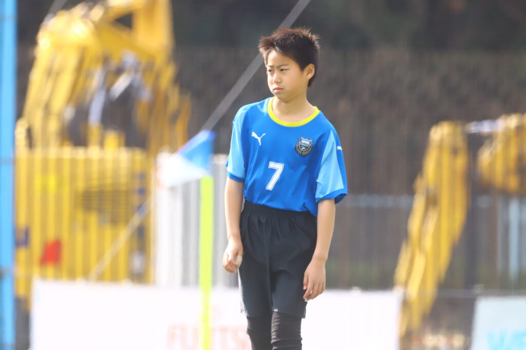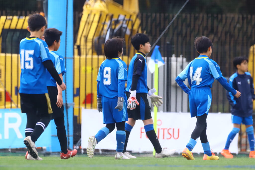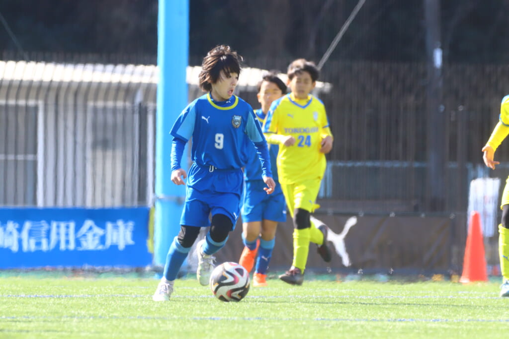 1本目、フロンターレは、GKは新6年の梅木理生、最終ラインは右から5武田煌、7片岡陽雅、新たに加入の新5年で4番をつけた上村蓮、中央に9福原暖太、右に11浅野玲偉、左に8菊地晴臣、前線には10ケーサーニコ。
