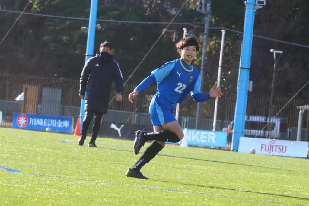 1本目、フロンターレは、GK19吉澤優人、最終ラインは右から20藤木乃以、26成瀬文哉、22田中真祐斗、中央に14宮本櫂、右に15芳賀廣人、左に27島田凌迅、前線には18崔雲沧。