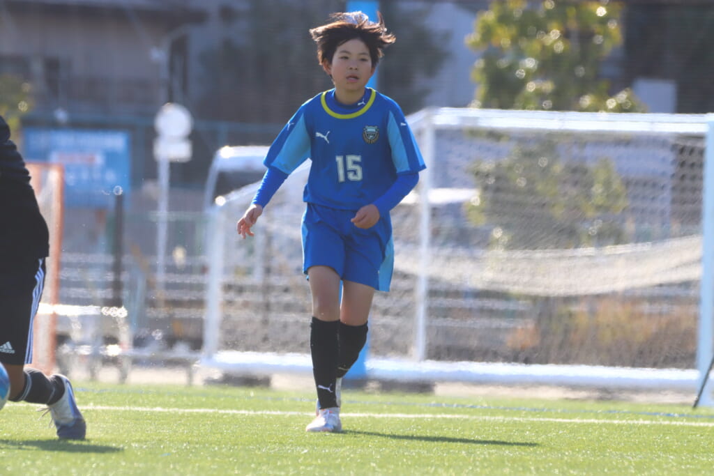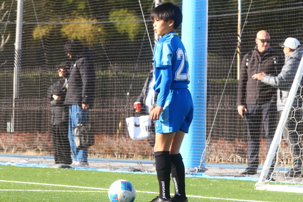 5本目、フロンターレはGK梅木理生、最終ラインは右から25長野優斗、22田中真祐斗、15芳賀廣人、中央に23髙桑湊人、右に14宮本櫂、左に24田口理欧斗、前線には26成瀬文哉。