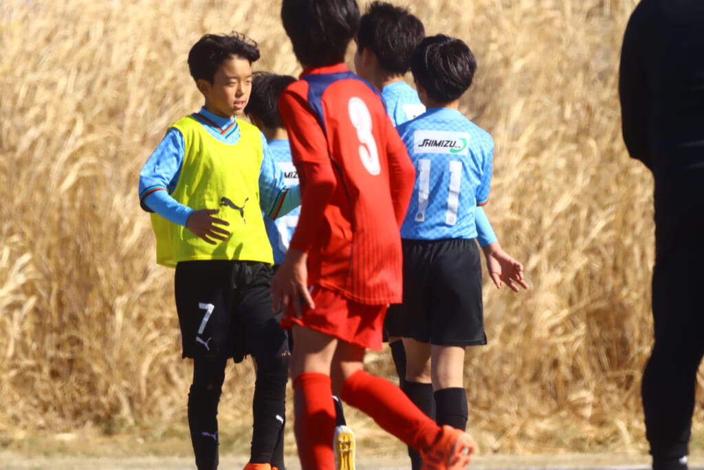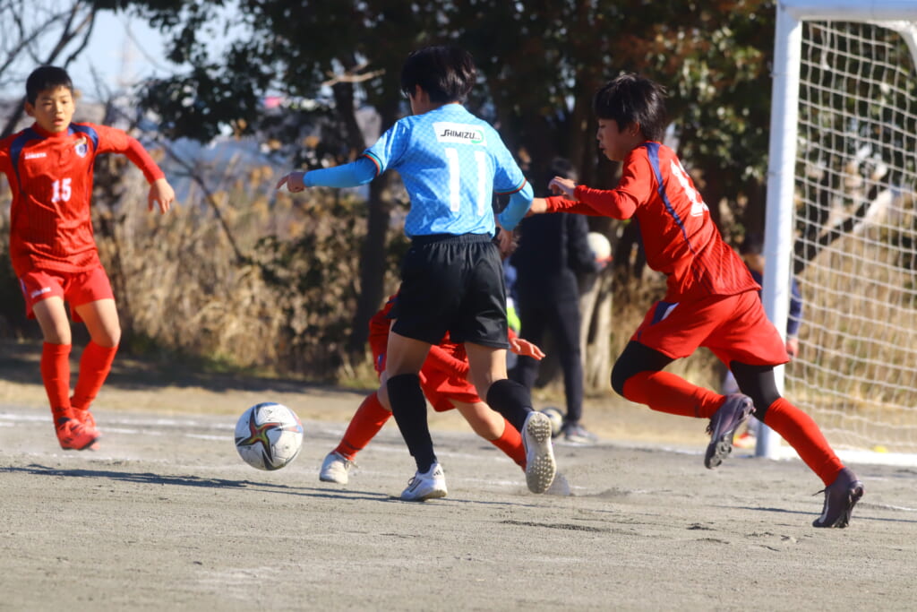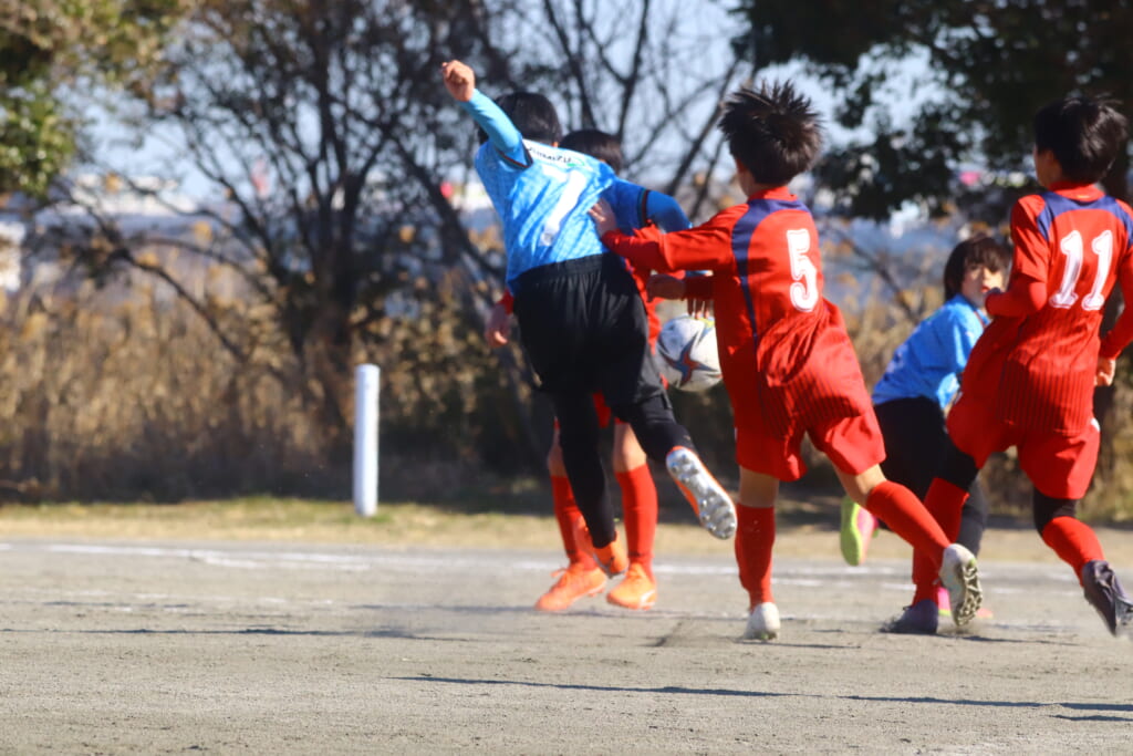 さらに橘SCは5が左サイドを仕掛け、そこから中央の7へ。7は縦パスを入れていきますが、ケーサーがカット。