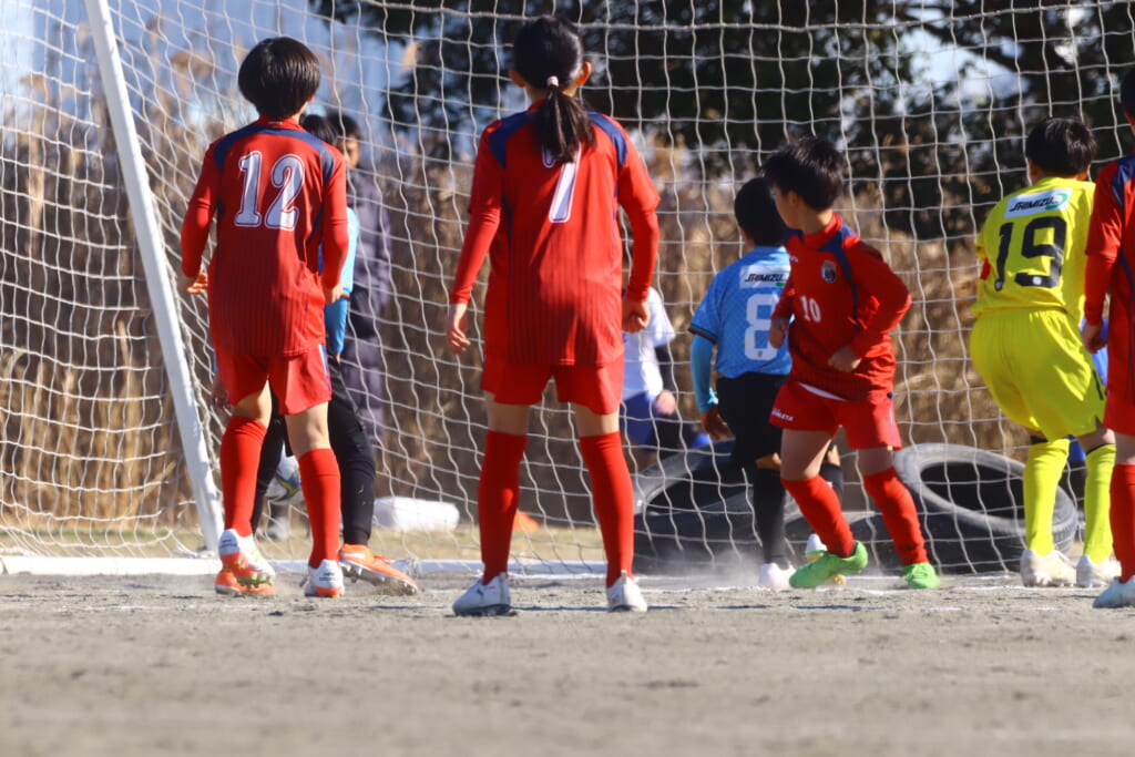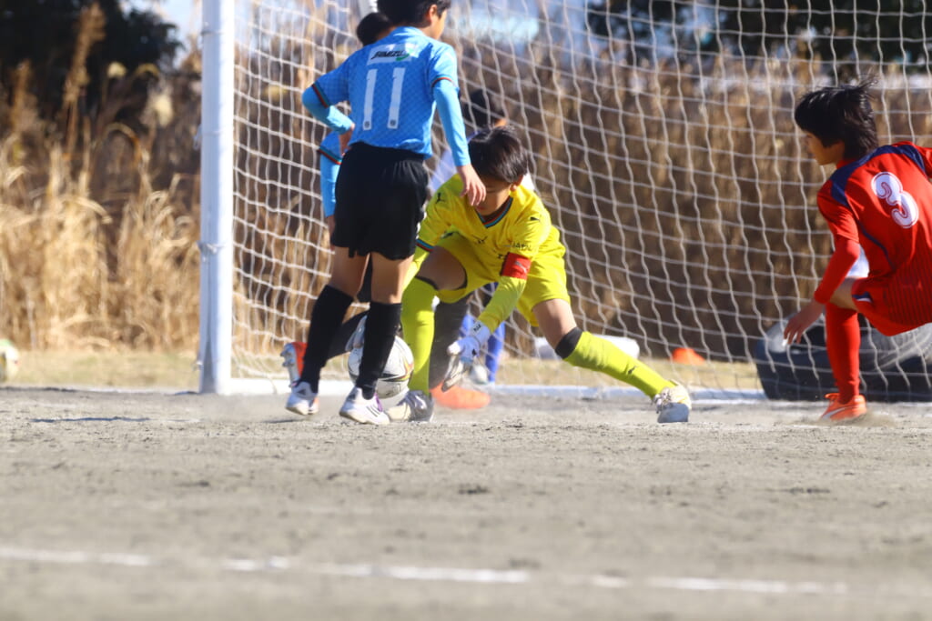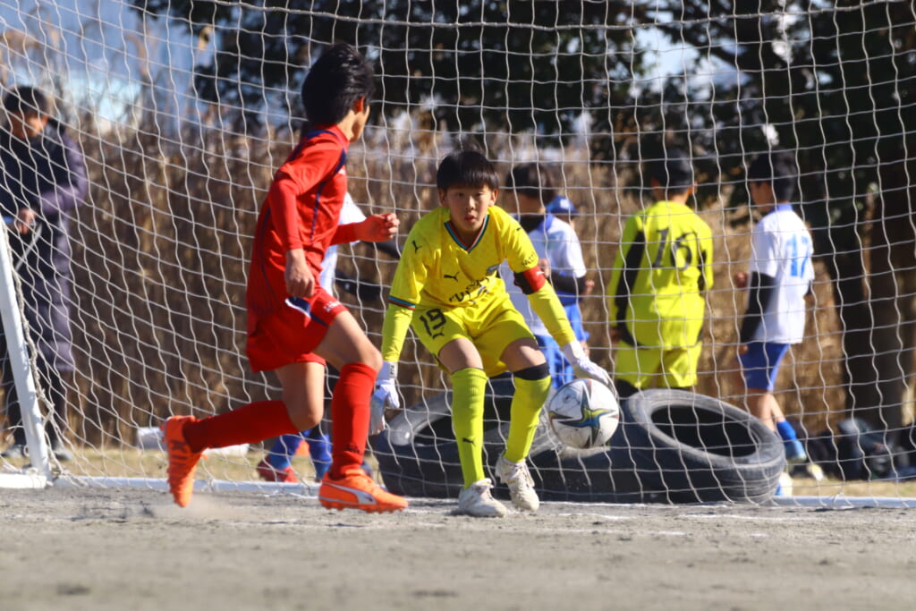 ボールはゴールの中へ。0-1。先制点は橘SCに入ります。
