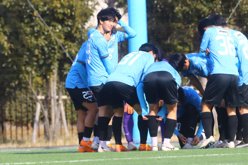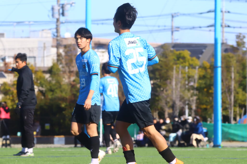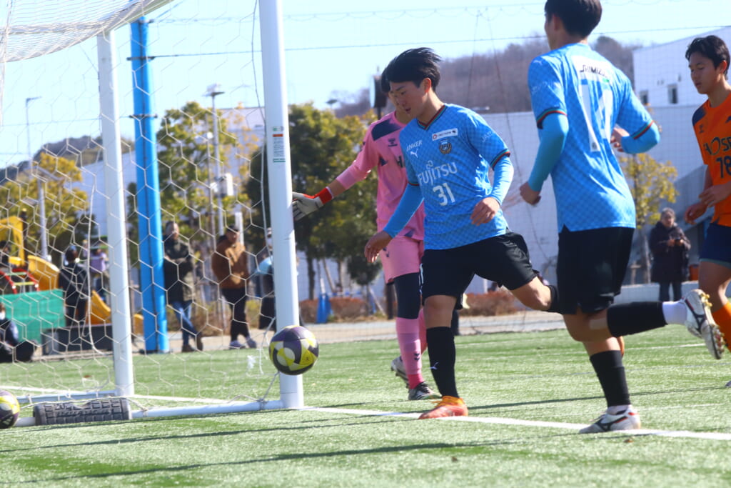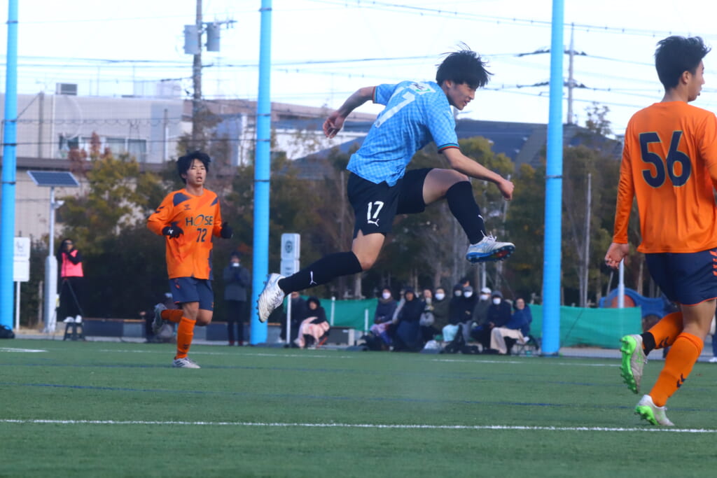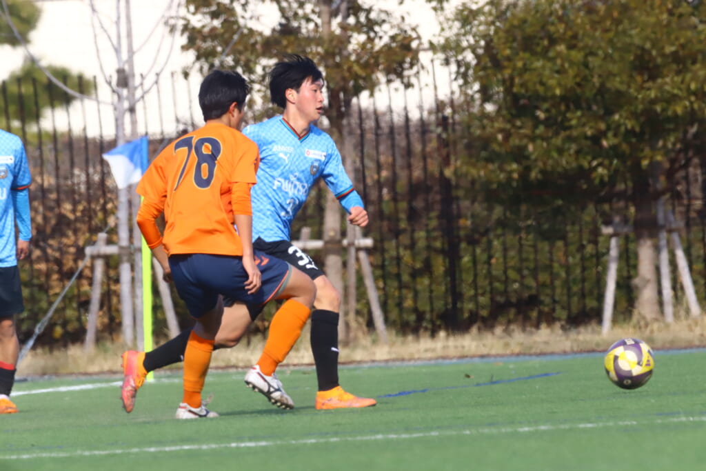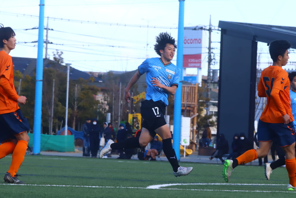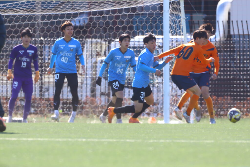 法政二高がブロックしたところ、セカンドボールを拾ったフロンターレは、山川から對馬とつながり、對馬の縦パスを中央で木下が受け、木下から受けた小川尋斗から左サイド、長崎へ。長崎は木下とのパス交換から高い位置へ持ち込み、左クロス。廣瀬がヘディングシュート。ここは法政二高の守りに遭い、最後はGK1がセーブ。