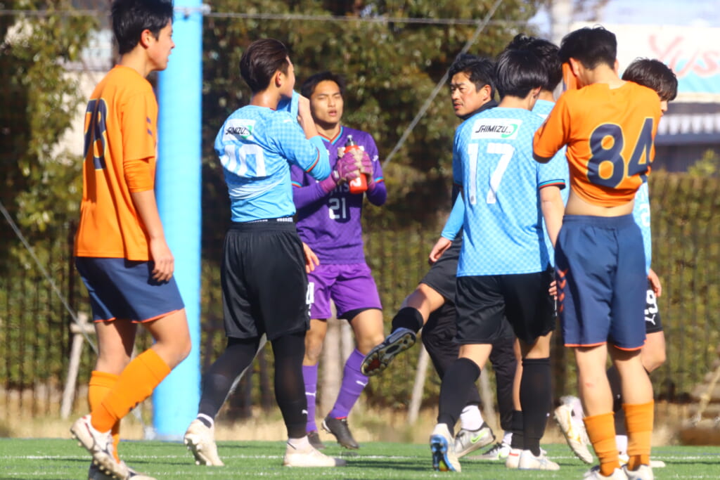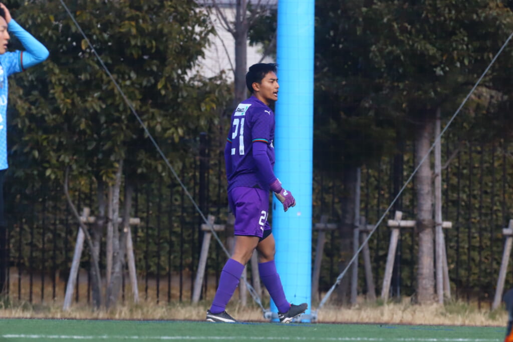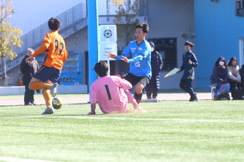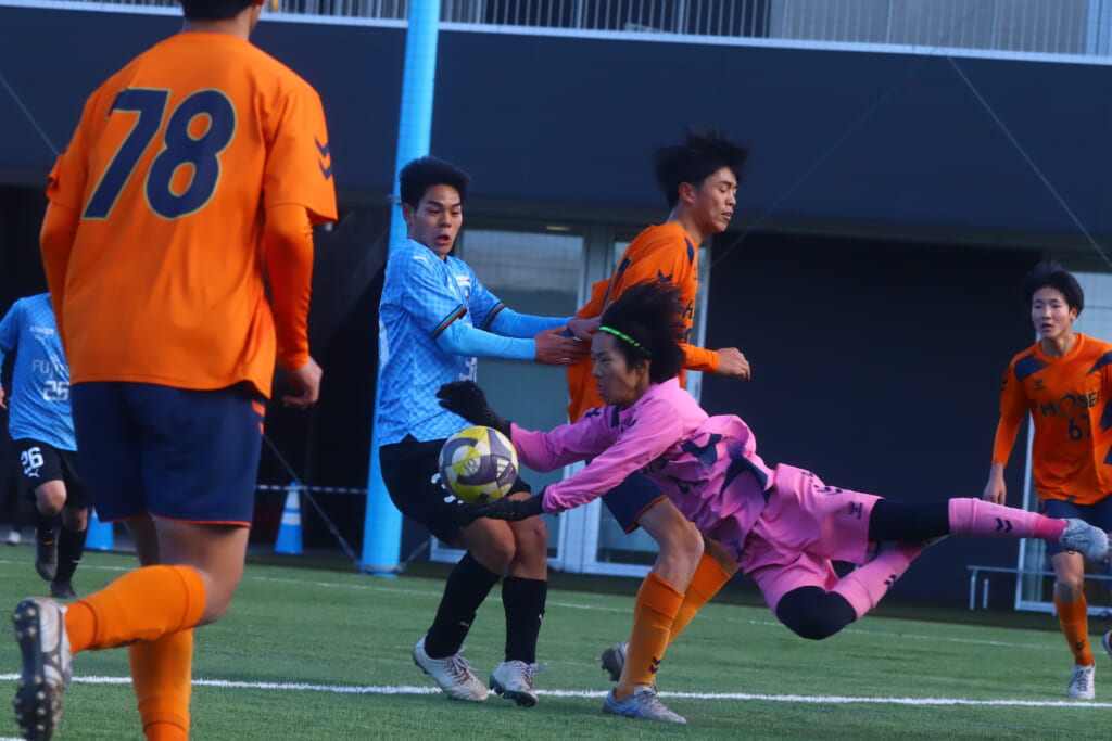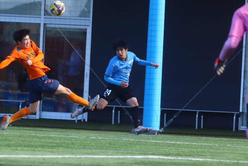 小川翔太の折り返しに、木下がエリア内へ飛び出しますが、法政二高のGK1がブロック。