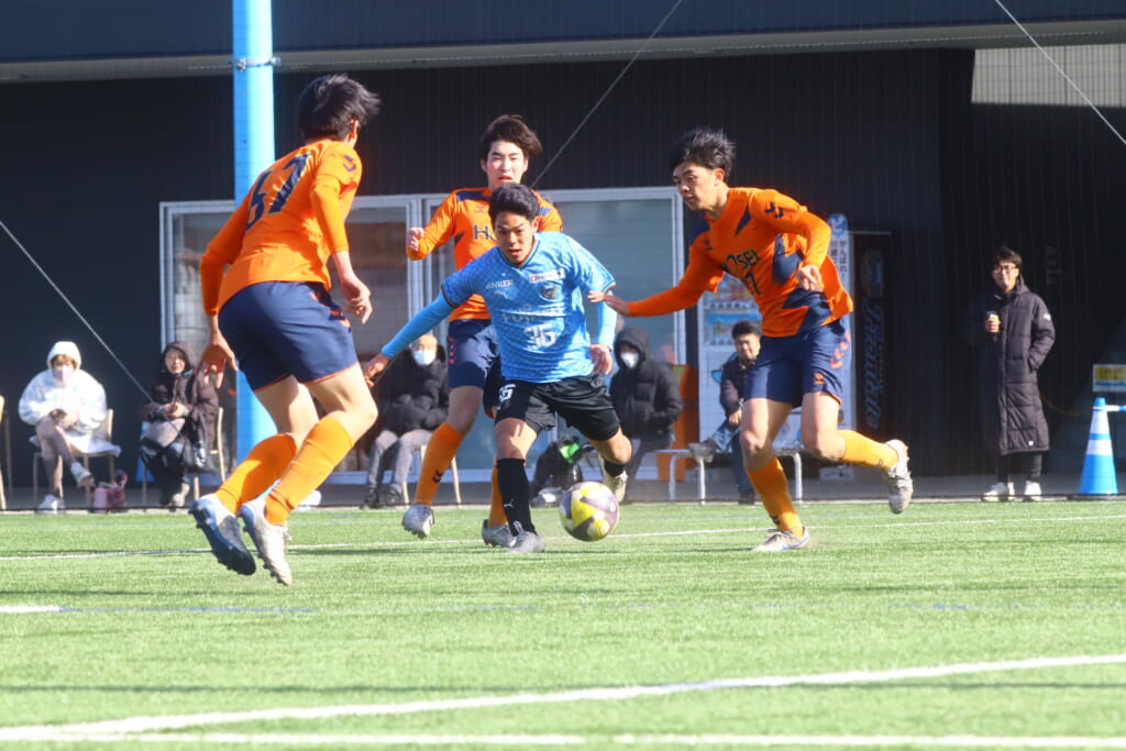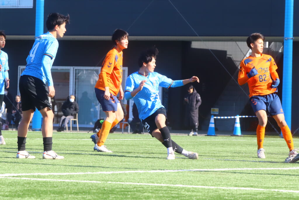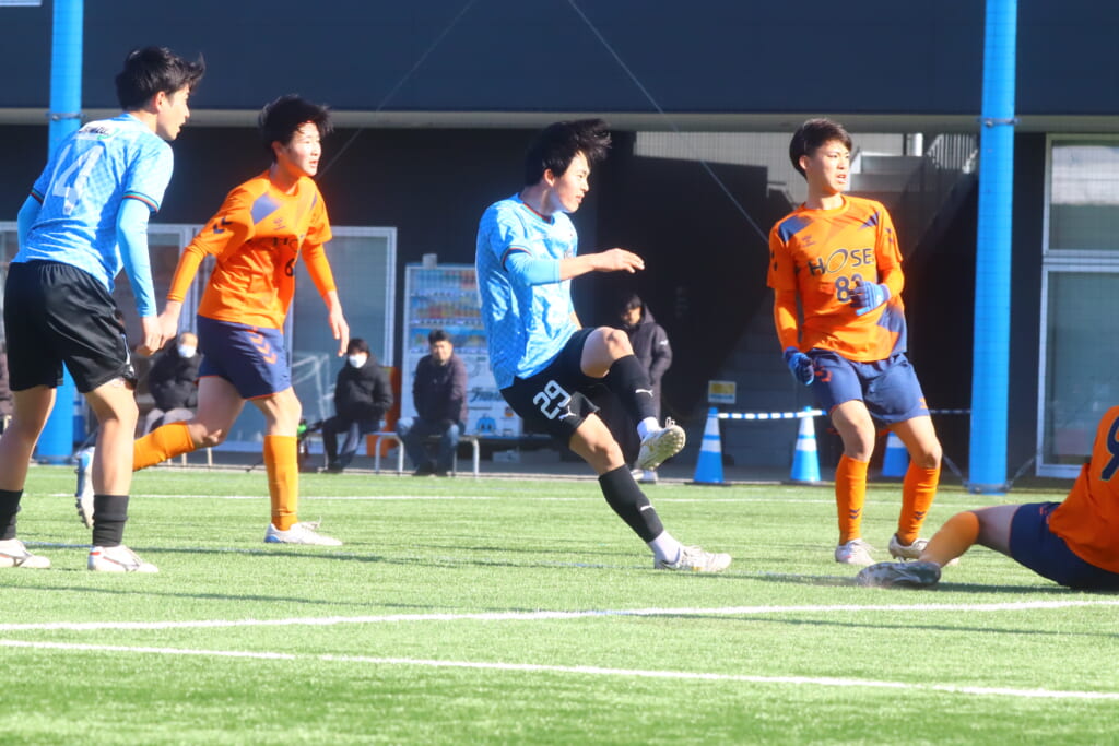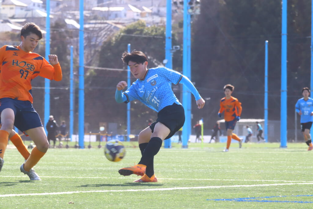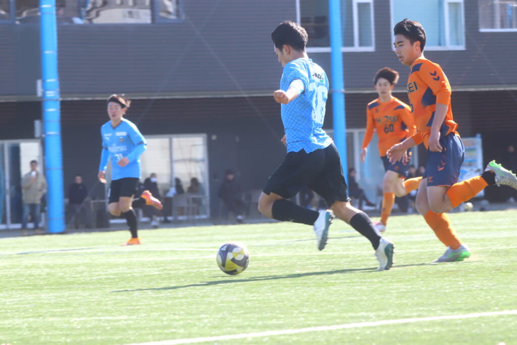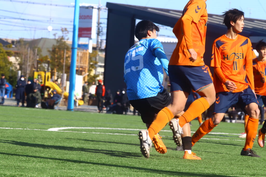 エリア正面やや左、うまく入り込んだ長崎がシュート。法政二高のブロックに遭い、ゴールとはなりませんでしたが、両SBがかかわり、チャンスをつくっていきます。