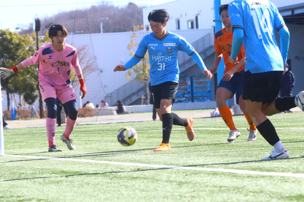 21分にはさらにフロンターレ、中央、木下から左サイド、長崎へ。長崎から小川尋斗、小川尋斗から中央間、木下につながり、木下からやや左で受けた小川尋斗は斜めに速いパス。これに抜け出したのは川村。川村はエリア左へ持ち込み、シュート。ボールはゴールの中へ。1-0。