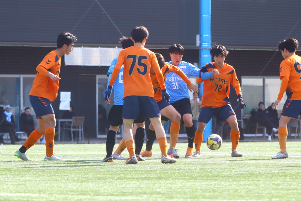 さらに法政二高が間にパスを入れ、そこから前に出時間をつくっていきますが、フロンターレは中央で小田や小川尋斗が寄せてマイボールに。