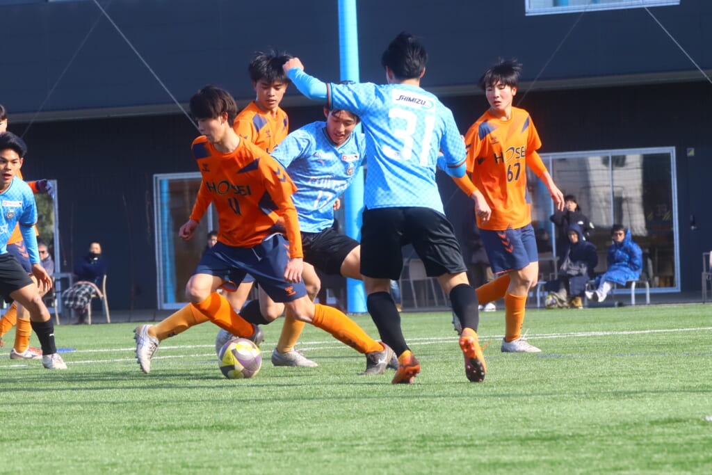 さらにセカンドボールを拾い、パス交換から小川尋斗の縦パスに、小田がエリア内へ。しかし、ここでも法政二高は人数をかけ、対応していきます。