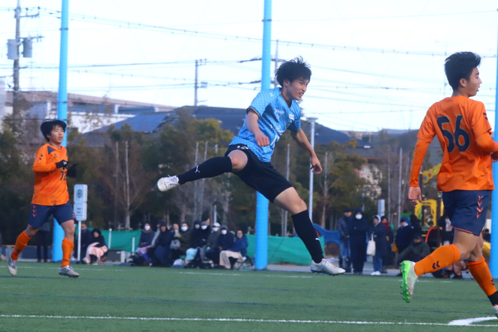 法政二高が体を張り、阻んだところ、セカンドボールを拾い、正面へ持ち込んだのは川村。シュートを打つとこれが決まり、1-0。