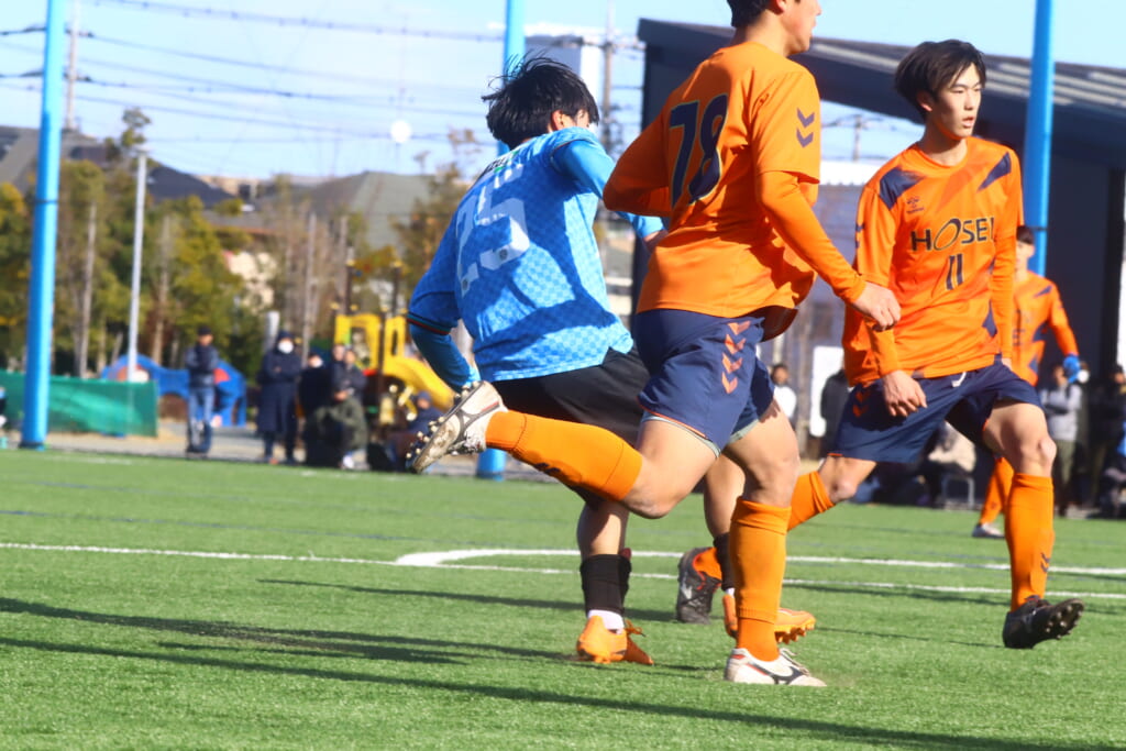 小川翔太がクロスを入れるとセカンドボールを拾った小田が正面へ持ち込んでいきますが、法政二高は体を張り、これに対応。