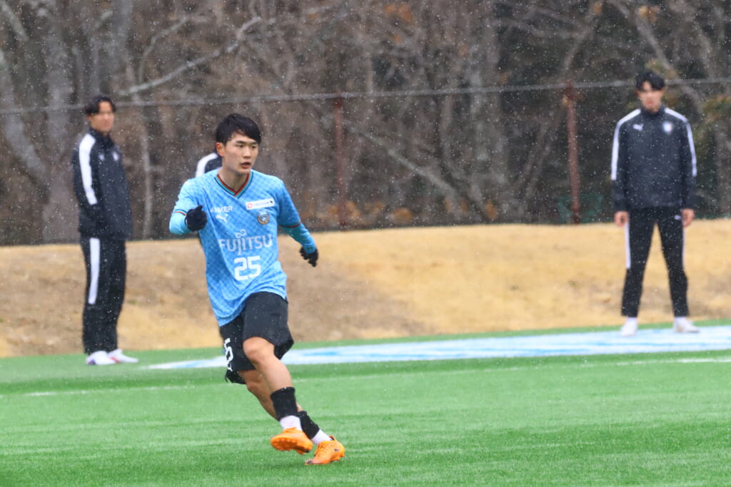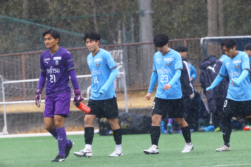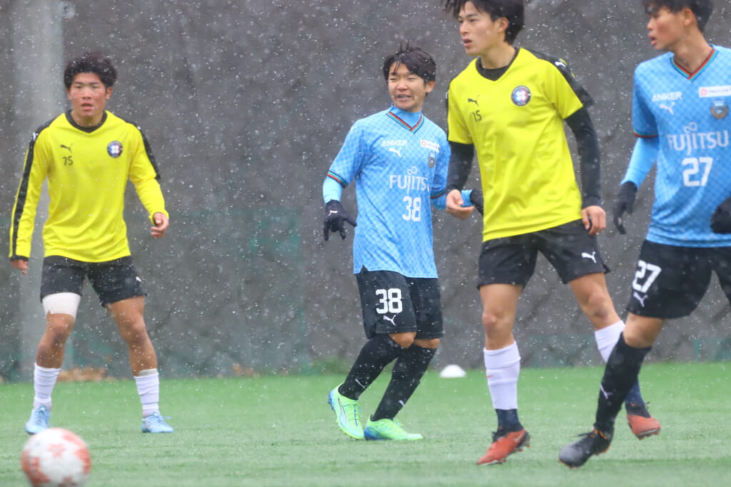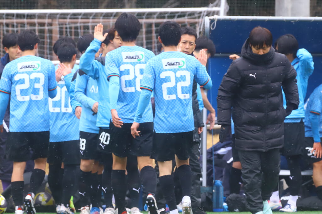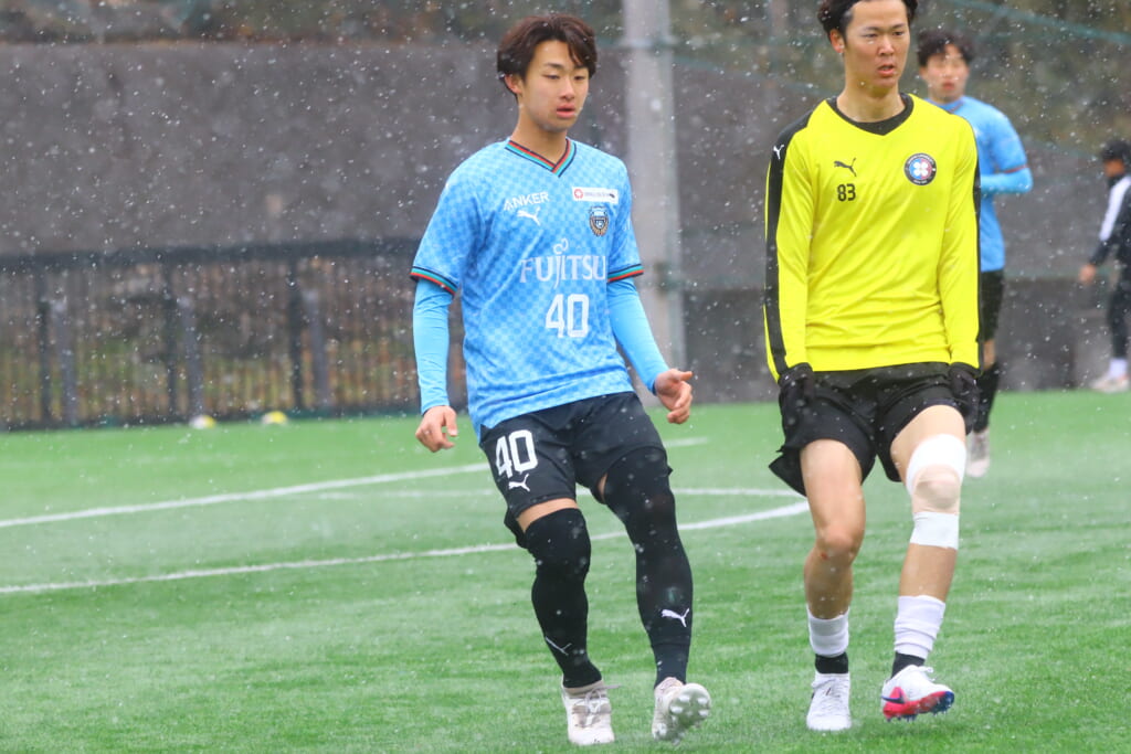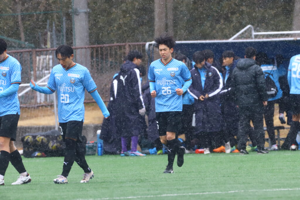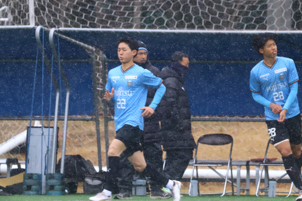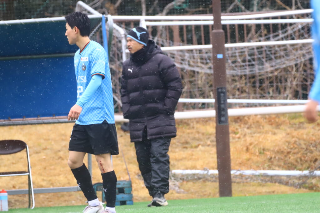 雪が降り続き、ピッチ脇に設けられた観客席の屋根の下にいても、風に乗り雪が舞い込んでくる産業能率大第二グラウンド。それでも、フロンターレの選手の家族らが傘を差し、コートなどに身を包んで見守るなか、練習試合は始まりました。