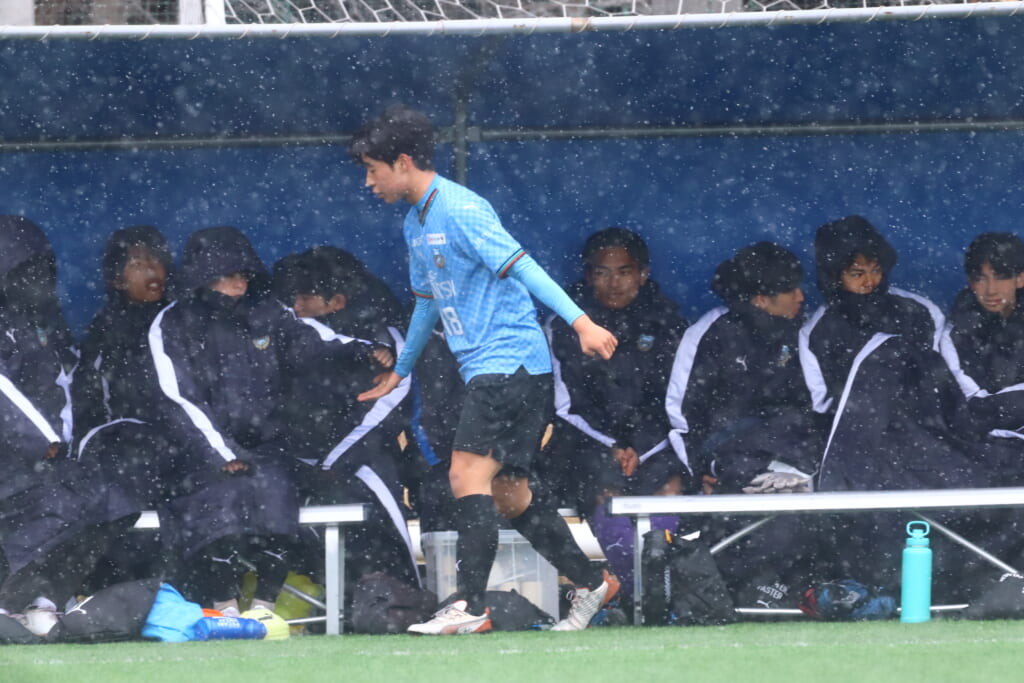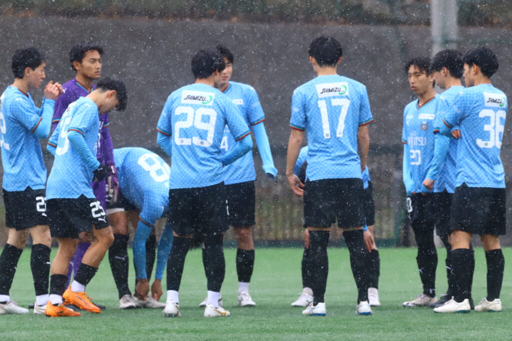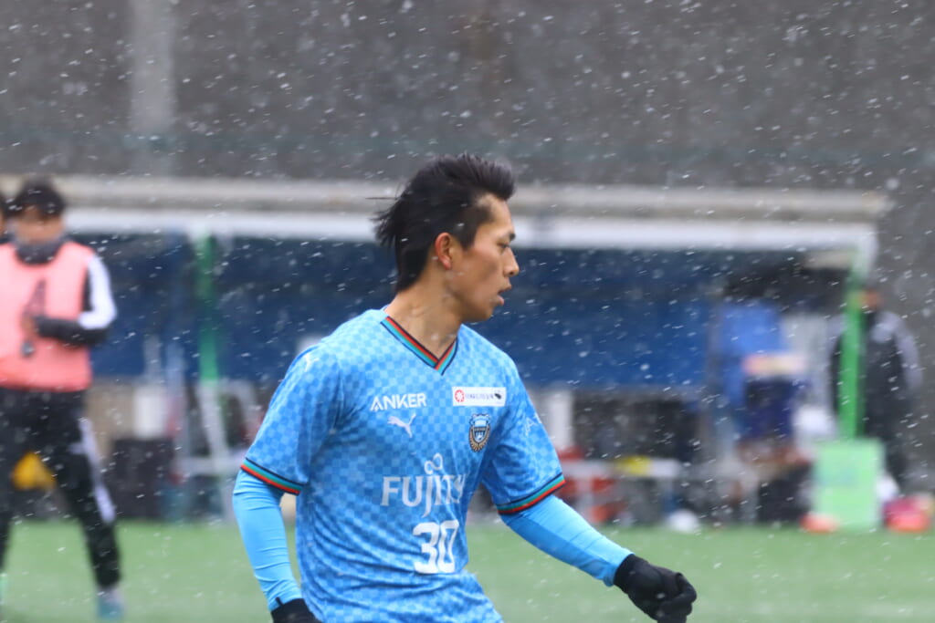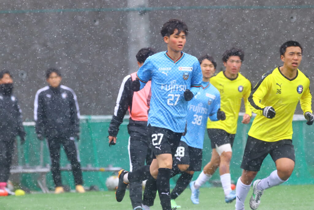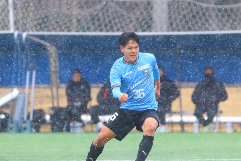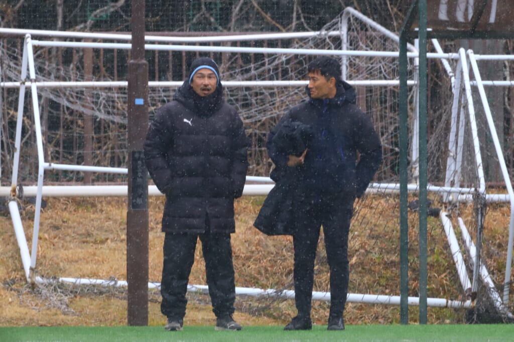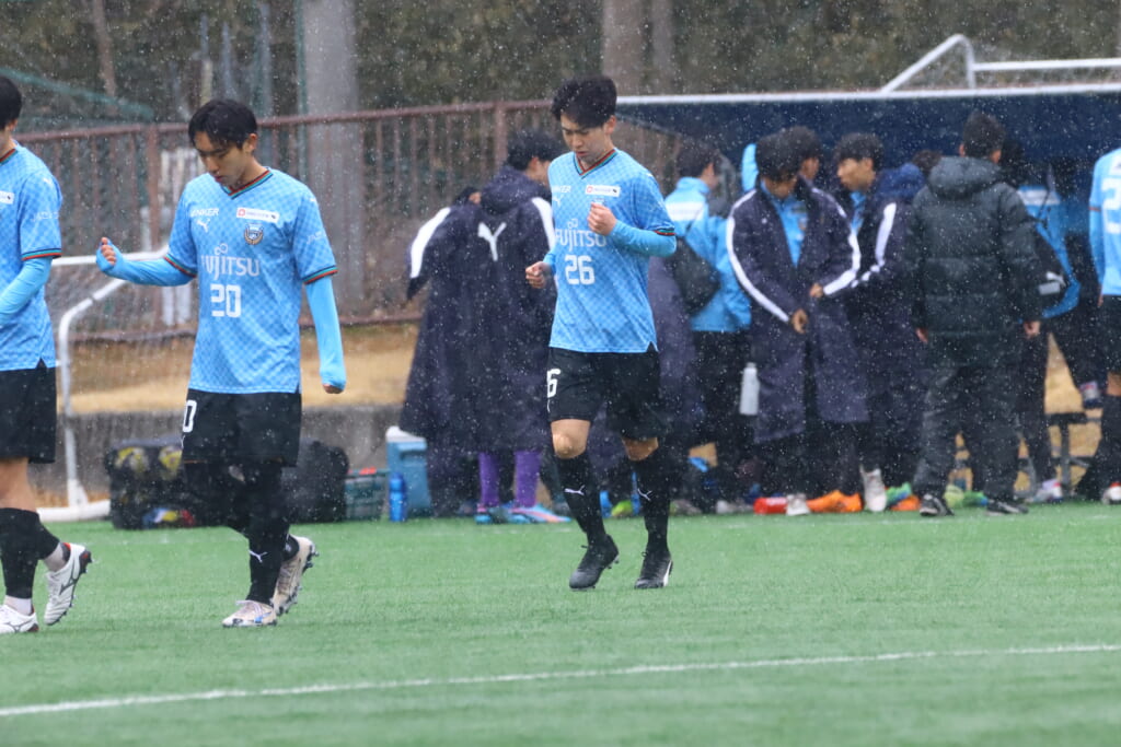 雪が降り続き、ピッチ脇に設けられた観客席の屋根の下にいても、風に乗り雪が舞い込んでくる産業能率大第二グラウンド。それでも、フロンターレの選手の家族らが傘を差し、コートなどに身を包んで見守るなか、練習試合は始まりました。