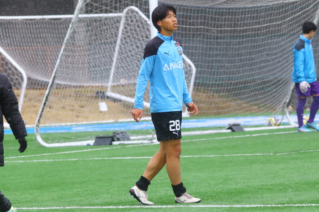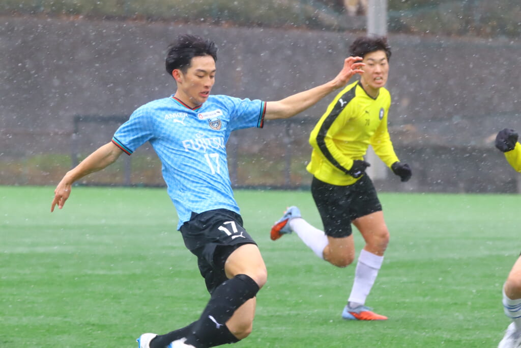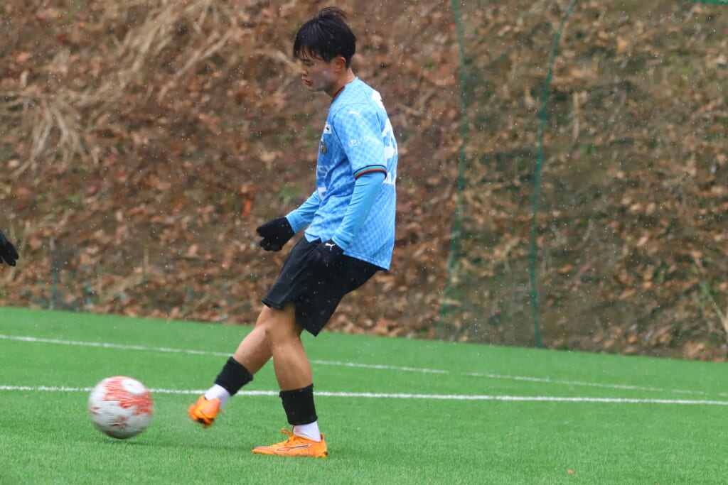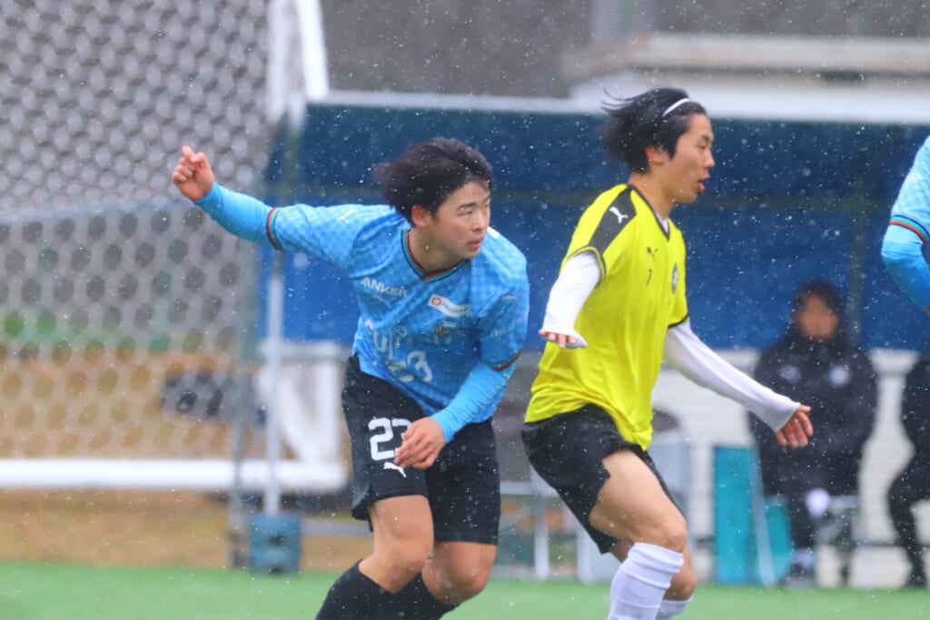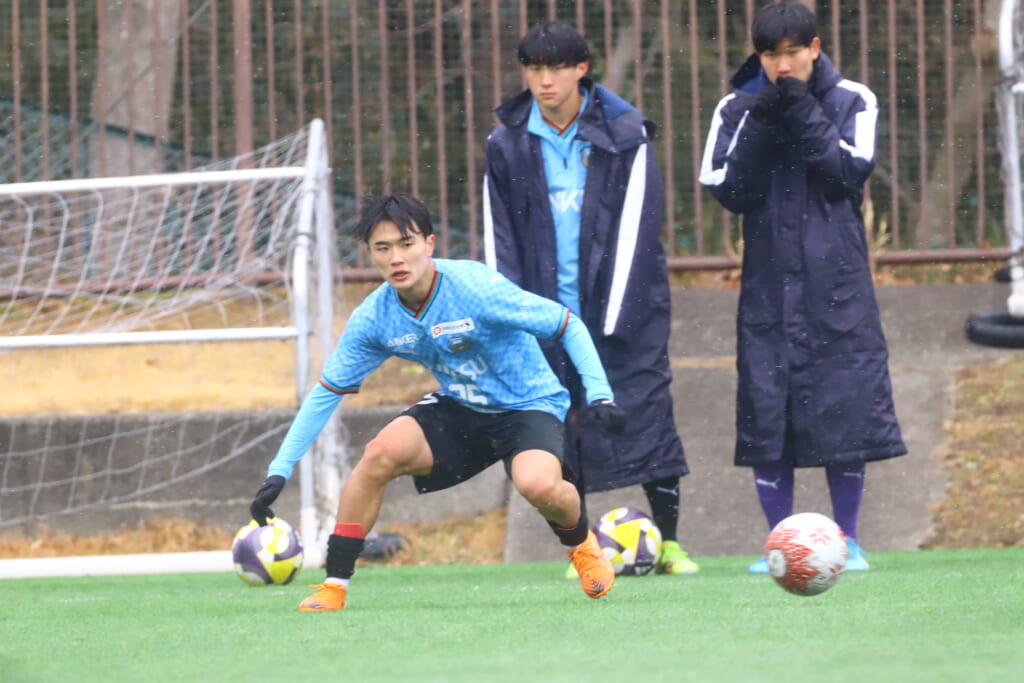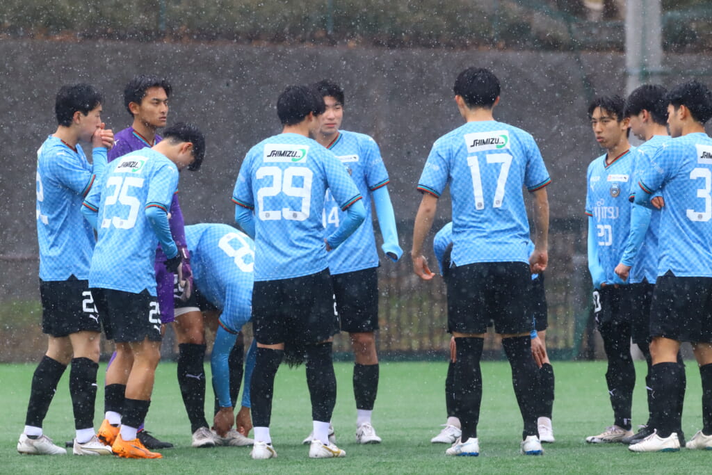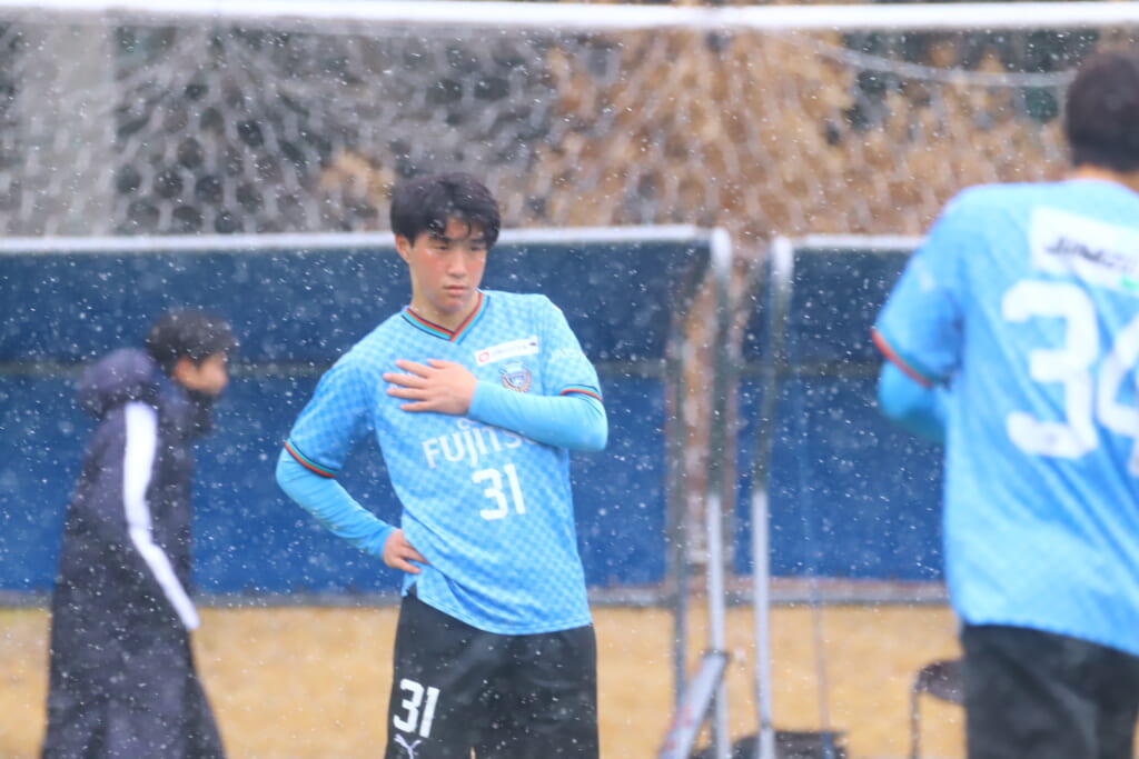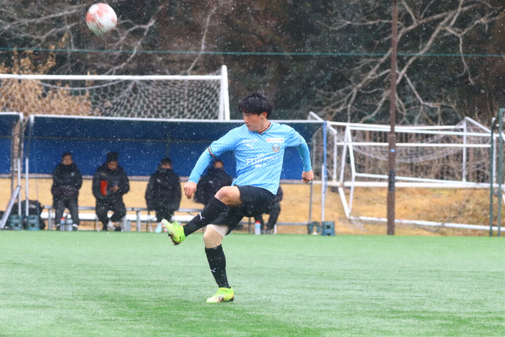 雪が降り続き、ピッチ脇に設けられた観客席の屋根の下にいても、風に乗り雪が舞い込んでくる産業能率大第二グラウンド。それでも、フロンターレの選手の家族らが傘を差し、コートなどに身を包んで見守るなか、練習試合は始まりました。
