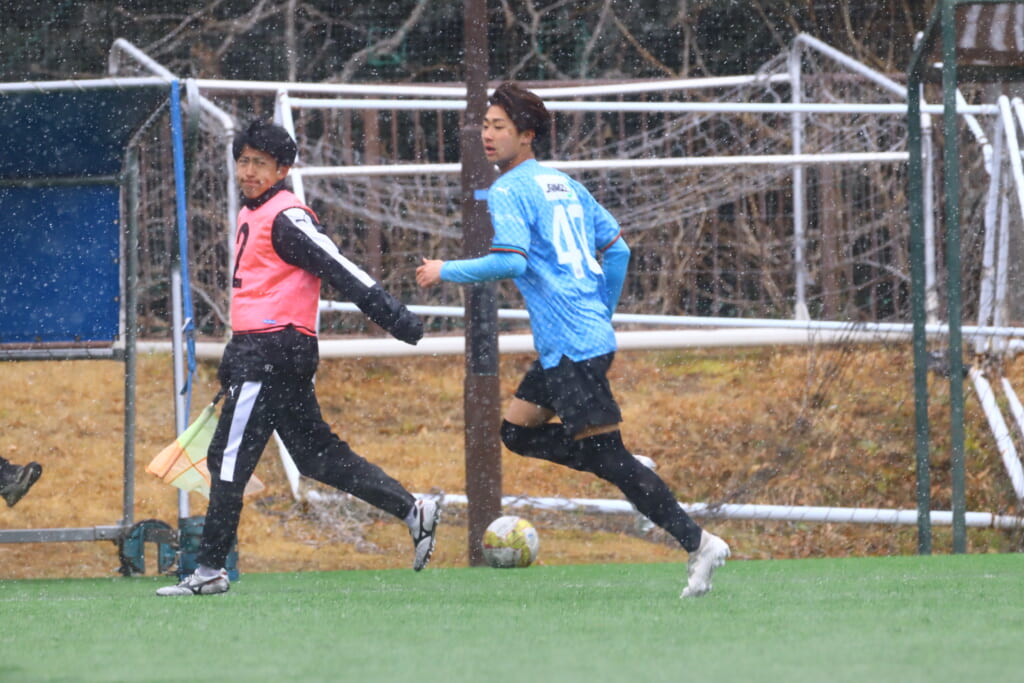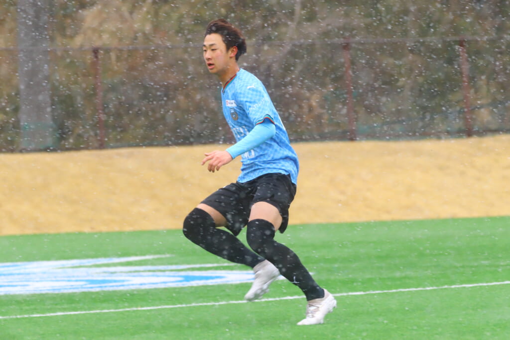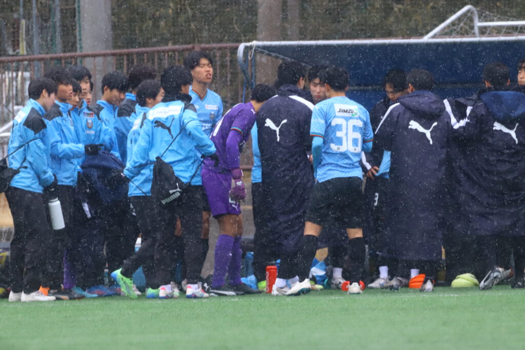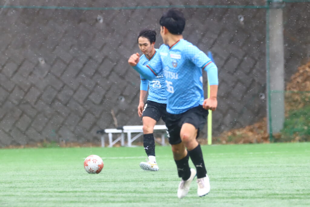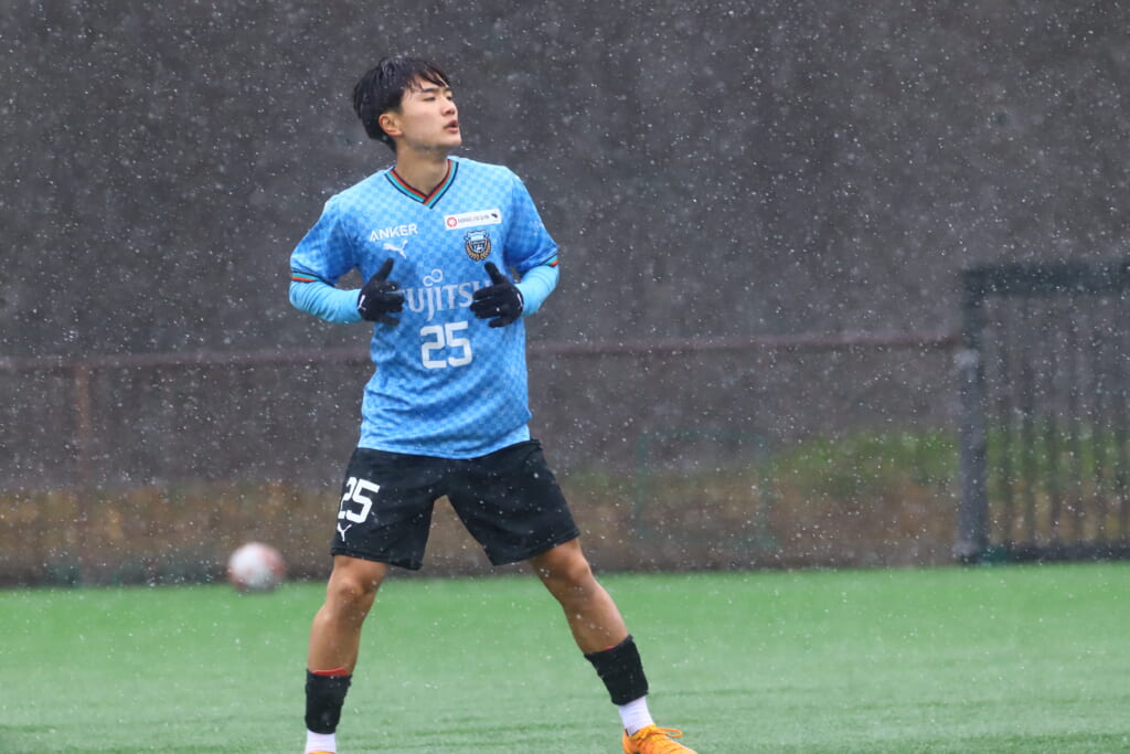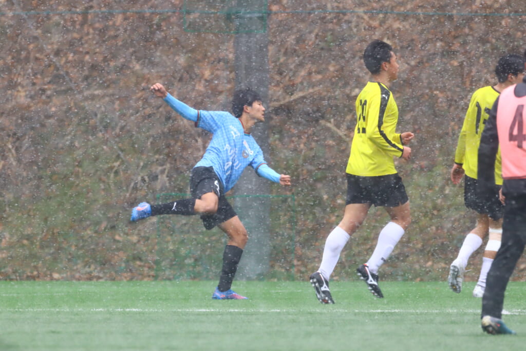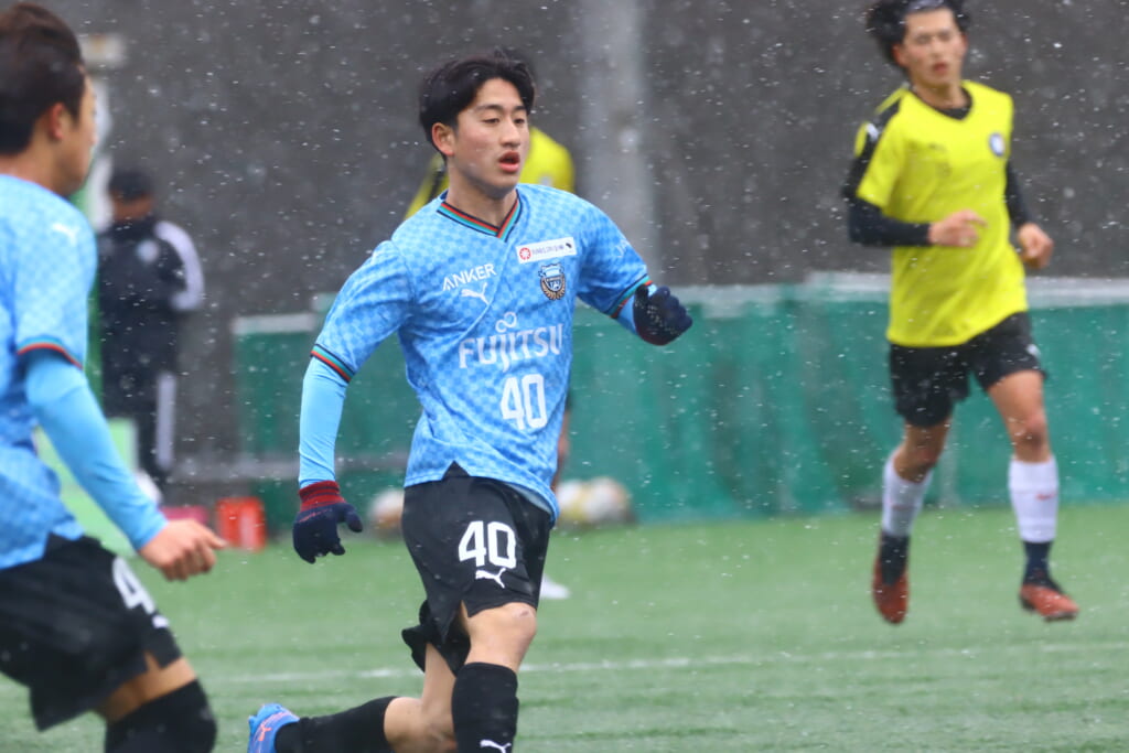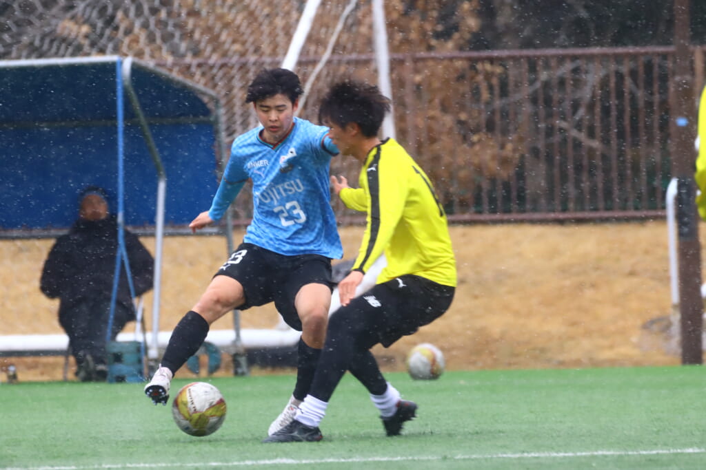雪が降り続き、ピッチ脇に設けられた観客席の屋根の下にいても、風に乗り雪が舞い込んでくる産業能率大第二グラウンド。それでも、フロンターレの選手の家族らが傘を差し、コートなどに身を包んで見守るなか、練習試合は始まりました。