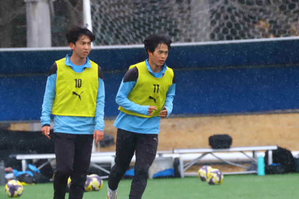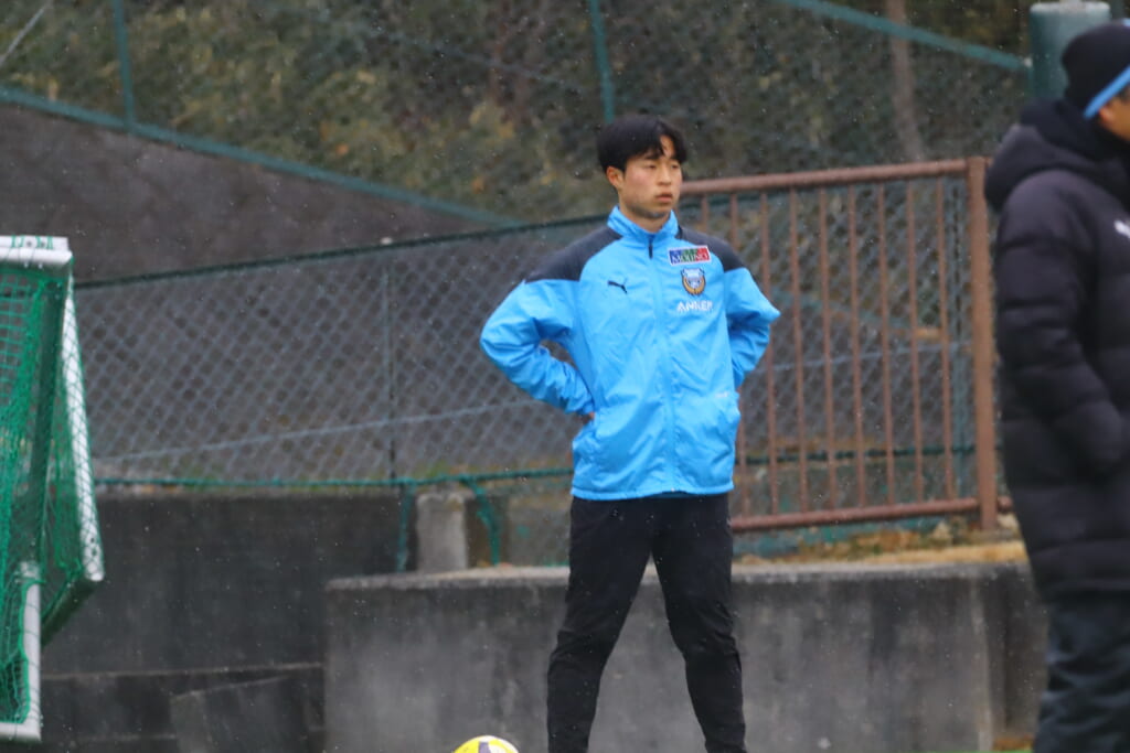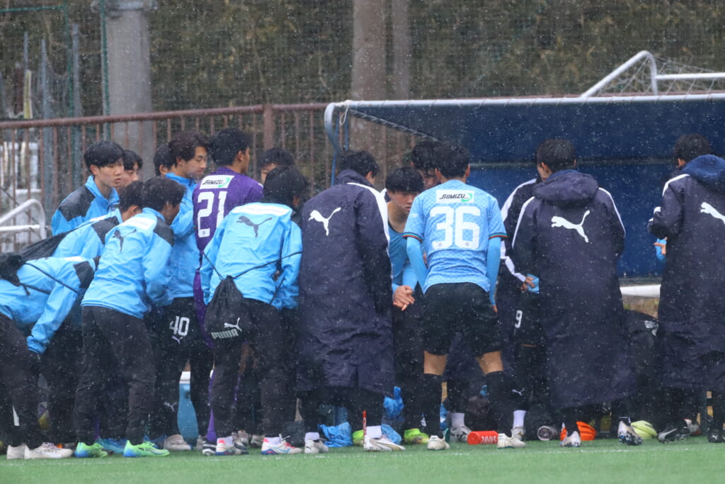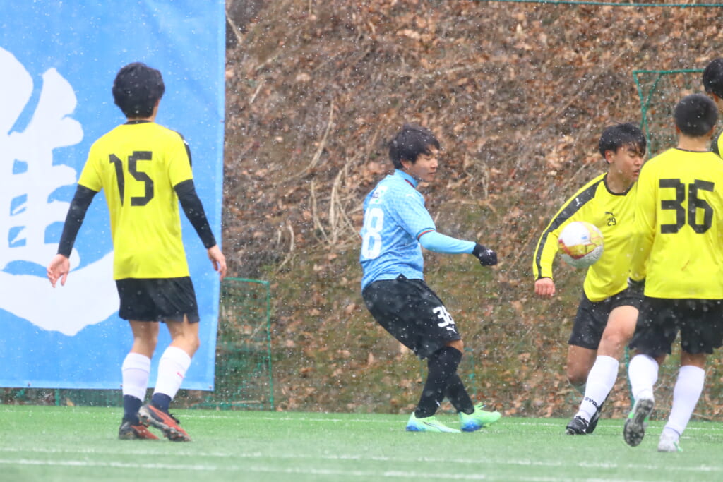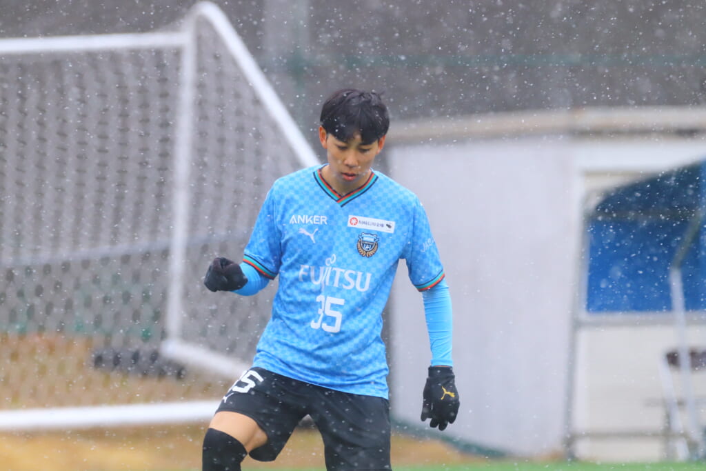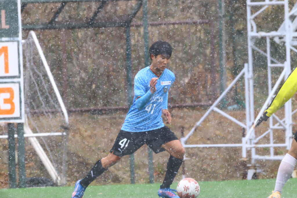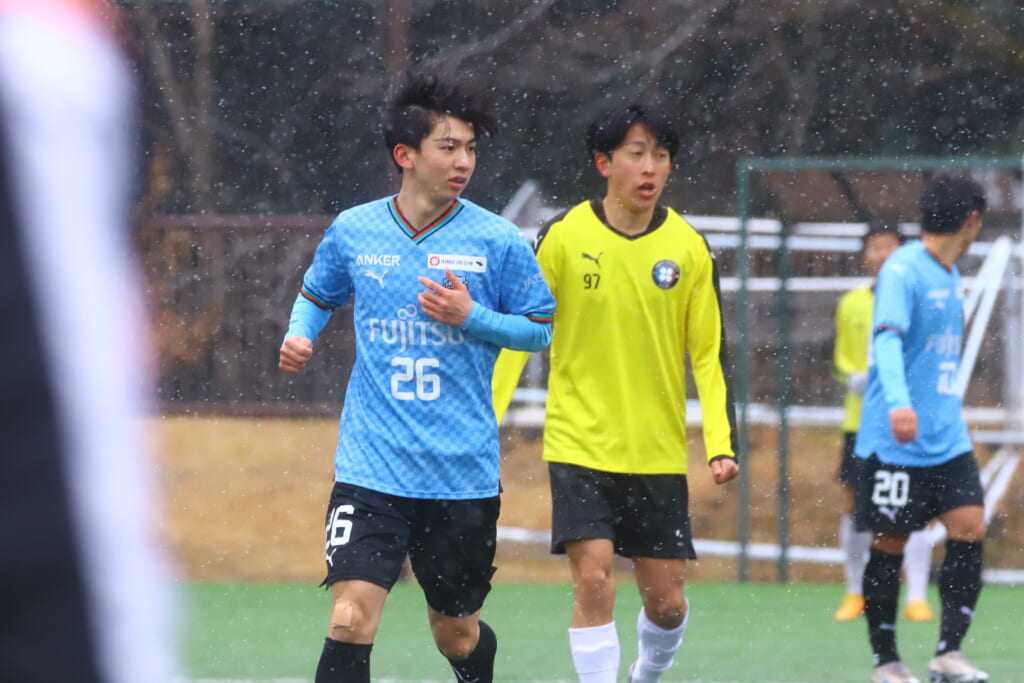 雪が降り続き、ピッチ脇に設けられた観客席の屋根の下にいても、風に乗り雪が舞い込んでくる産業能率大第二グラウンド。それでも、フロンターレの選手の家族らが傘を差し、コートなどに身を包んで見守るなか、練習試合は始まりました。