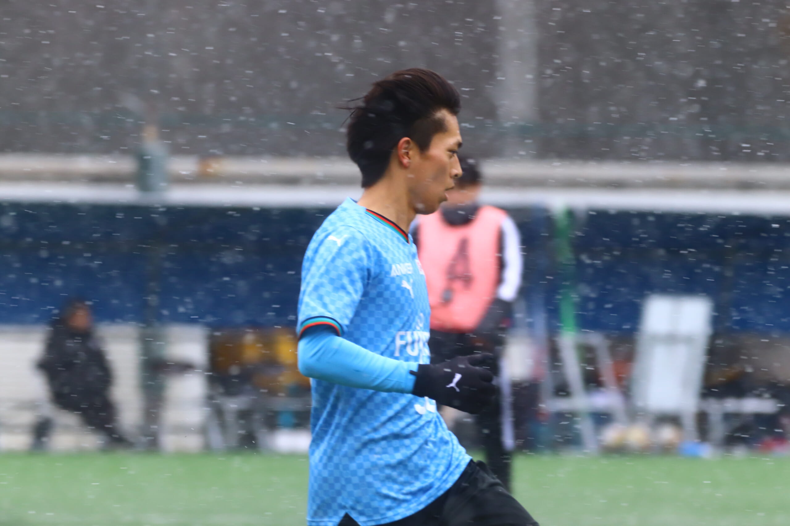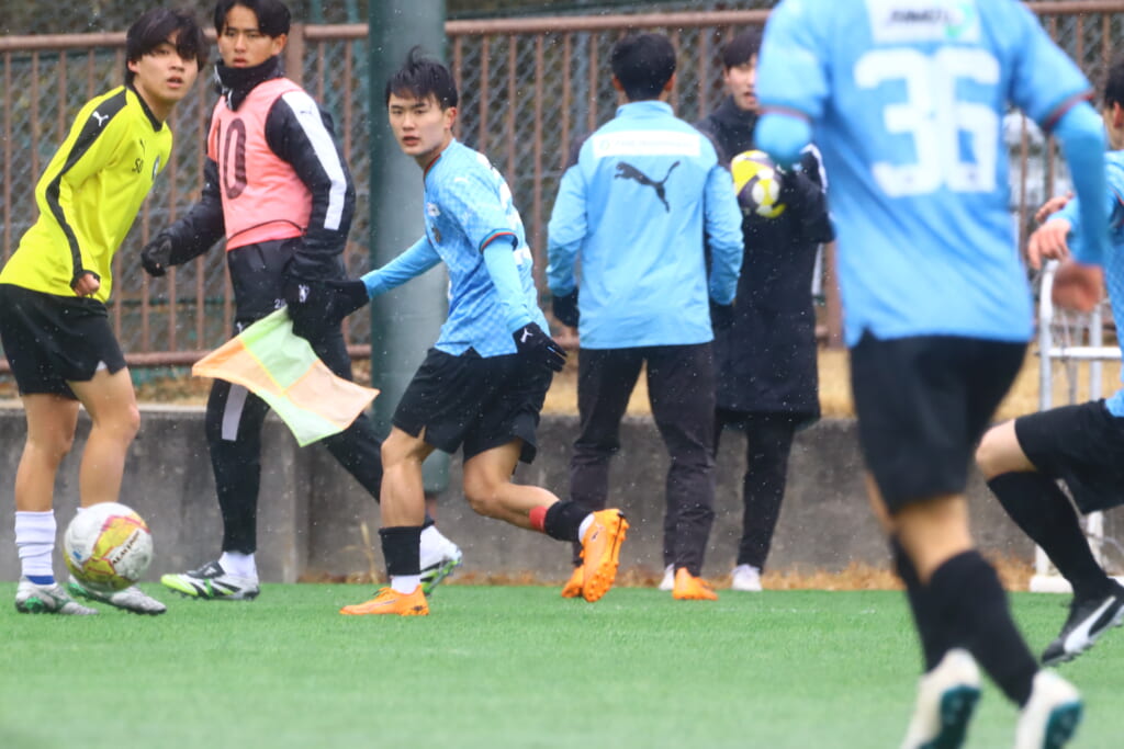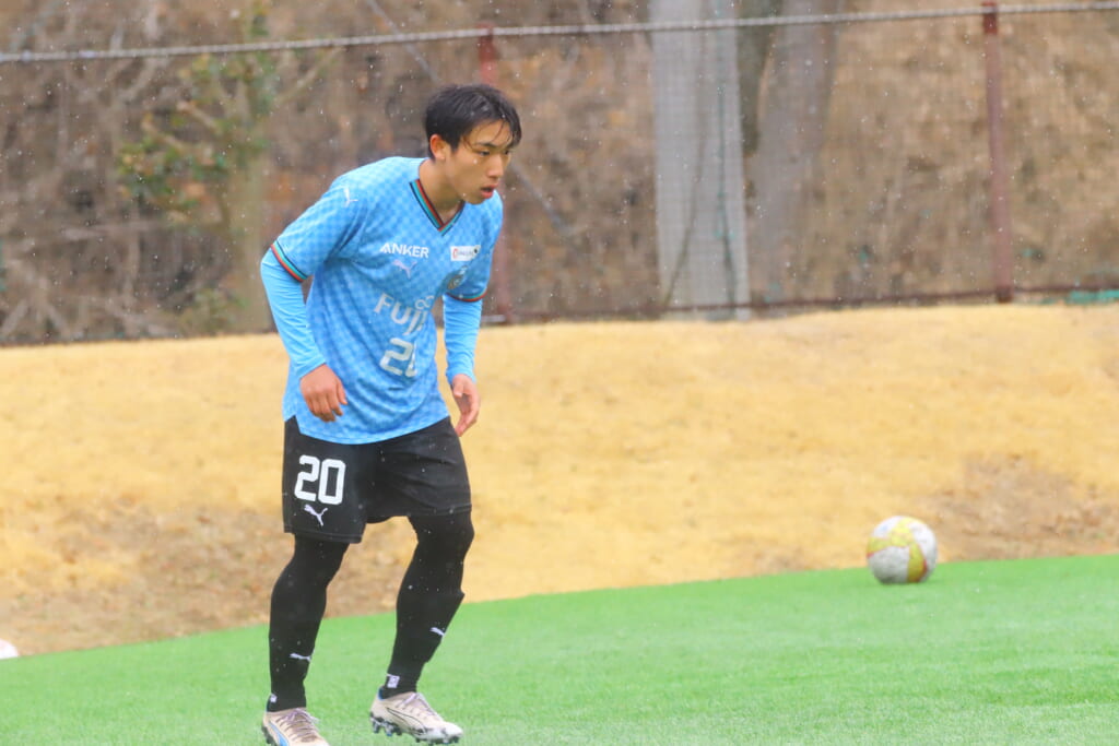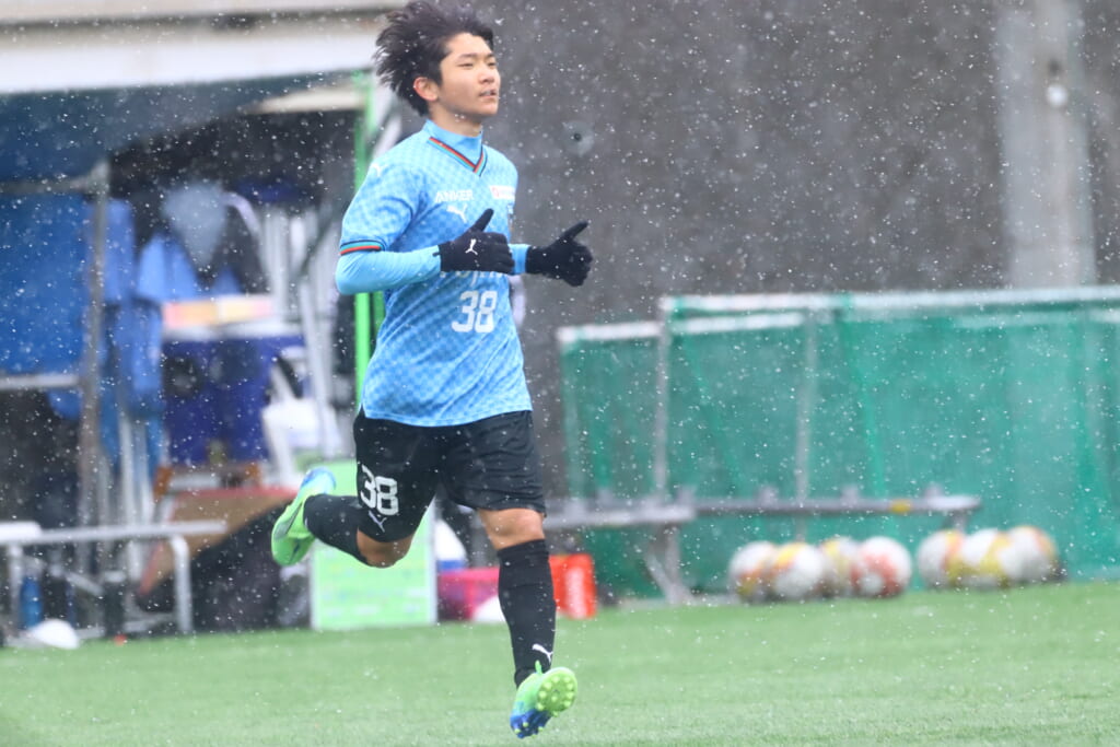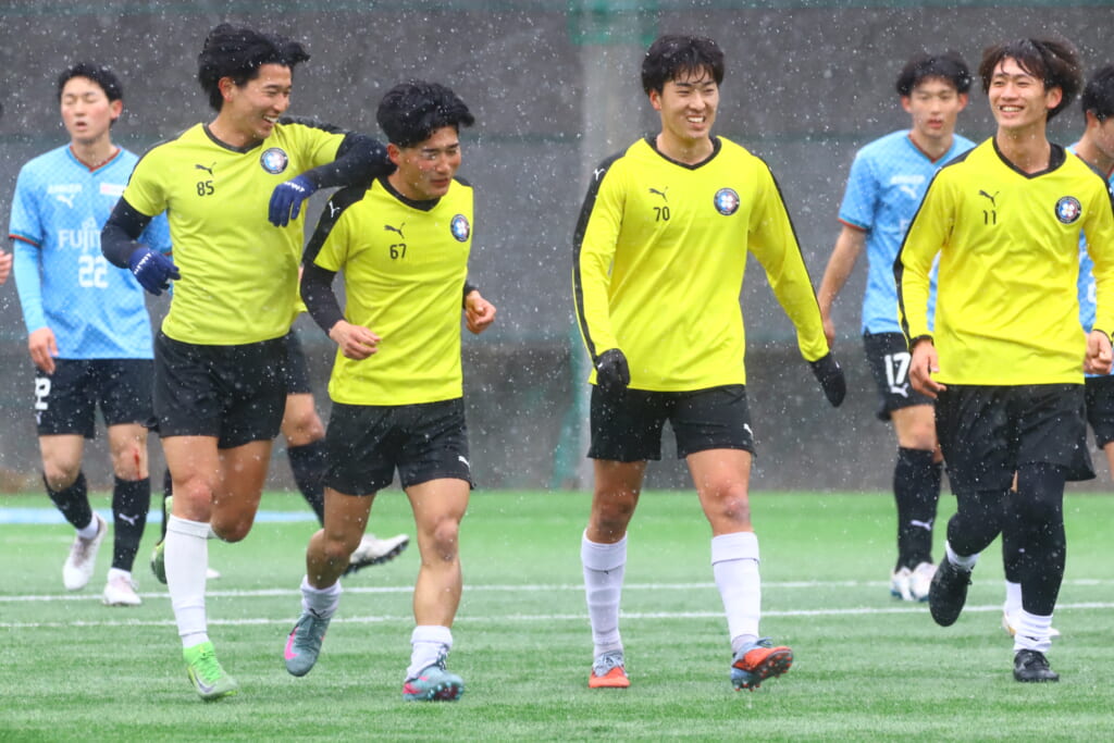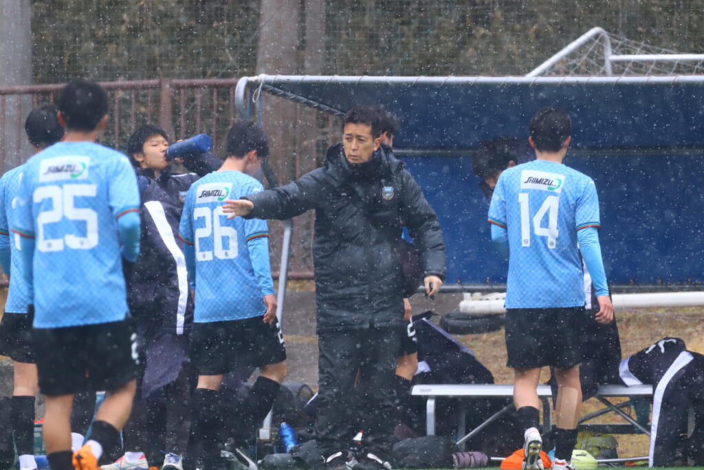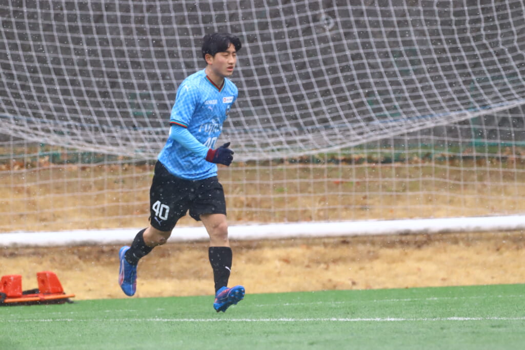 雪が降り続き、ピッチ脇に設けられた観客席の屋根の下にいても、風に乗り雪が舞い込んでくる産業能率大第二グラウンド。それでも、フロンターレの選手の家族らが傘を差し、コートなどに身を包んで見守るなか、練習試合は始まりました。