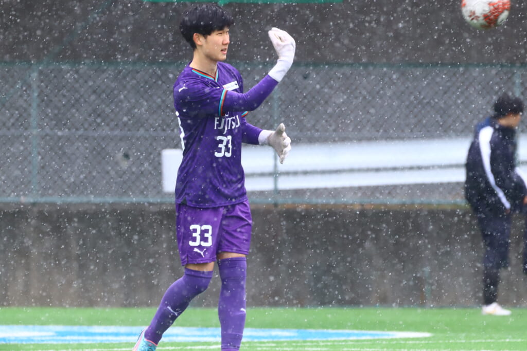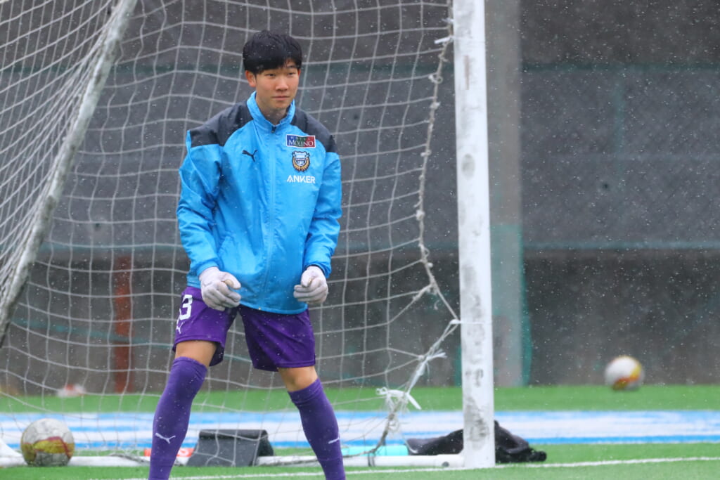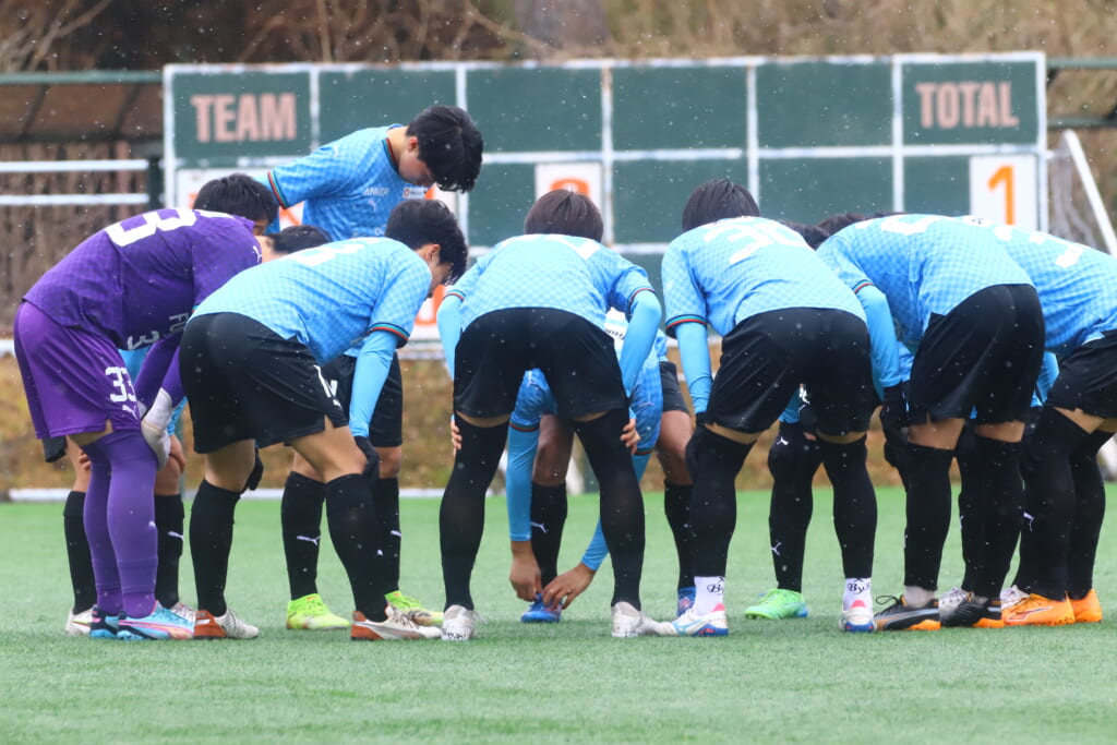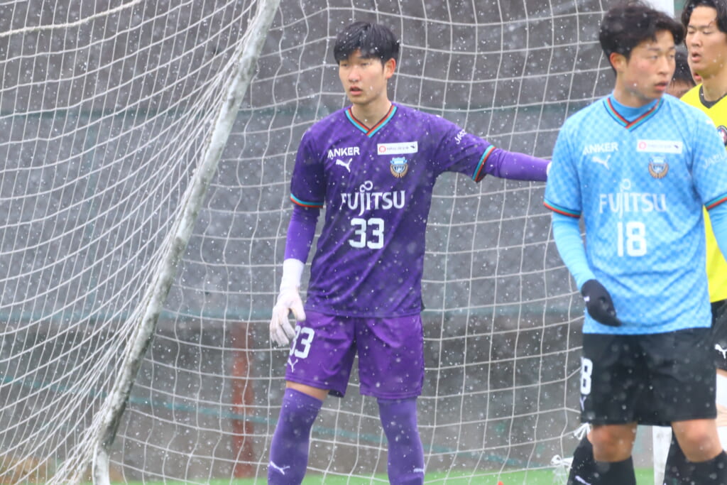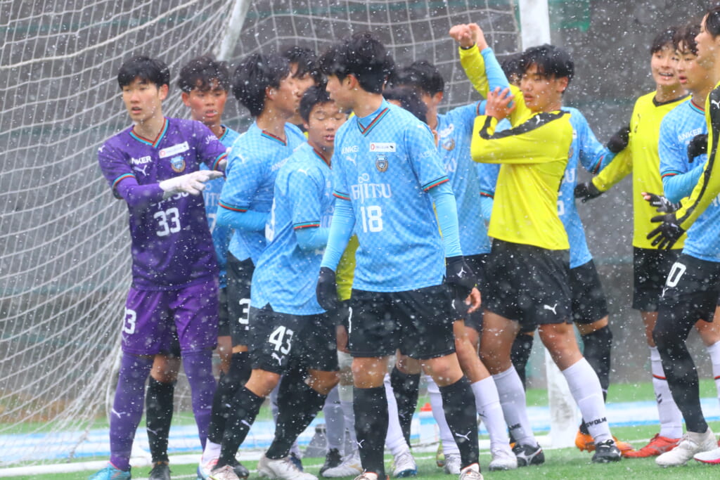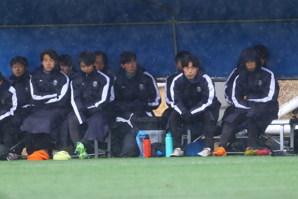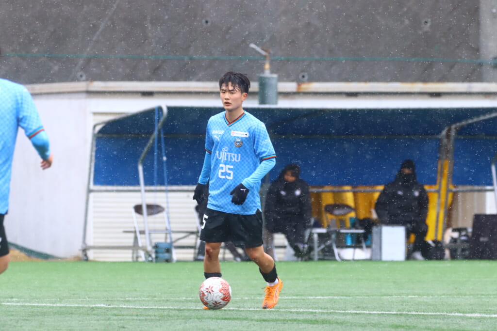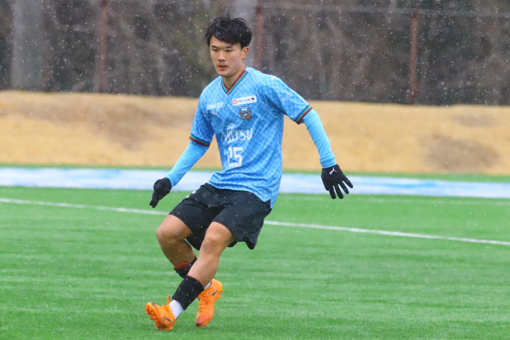 雪が降り続き、ピッチ脇に設けられた観客席の屋根の下にいても、風に乗り雪が舞い込んでくる産業能率大第二グラウンド。それでも、フロンターレの選手の家族らが傘を差し、コートなどに身を包んで見守るなか、練習試合は始まりました。
