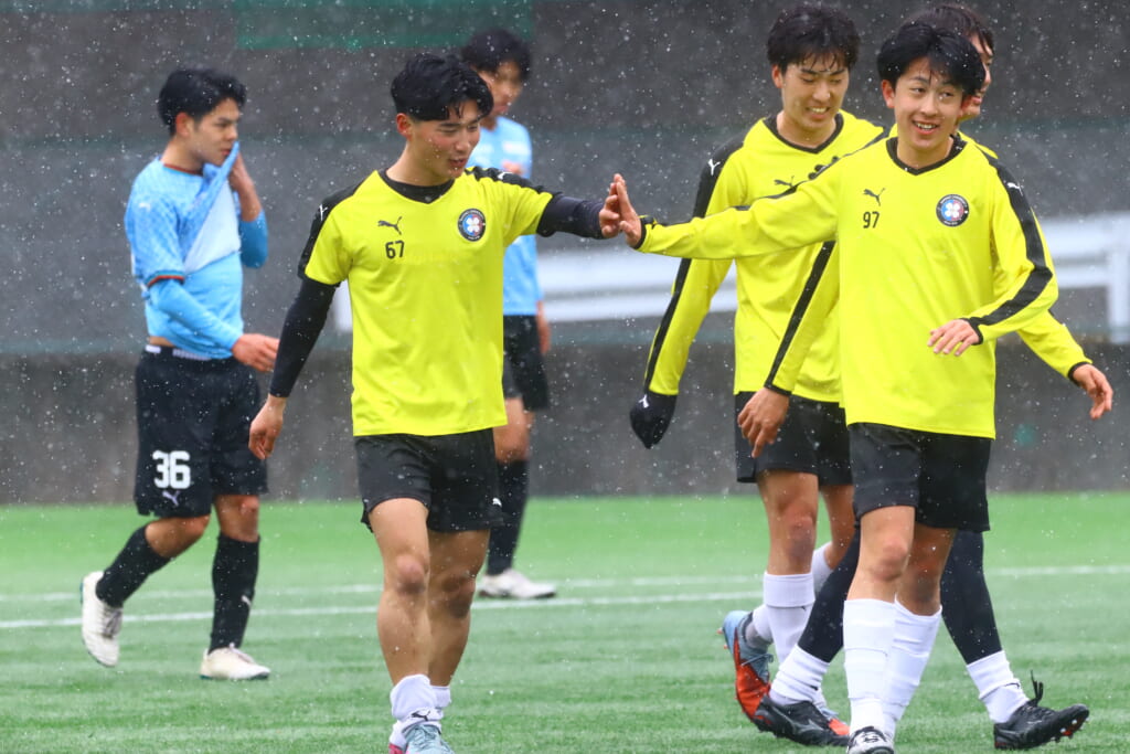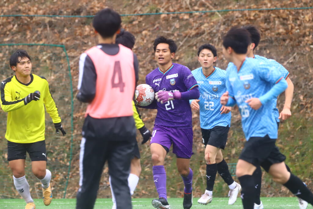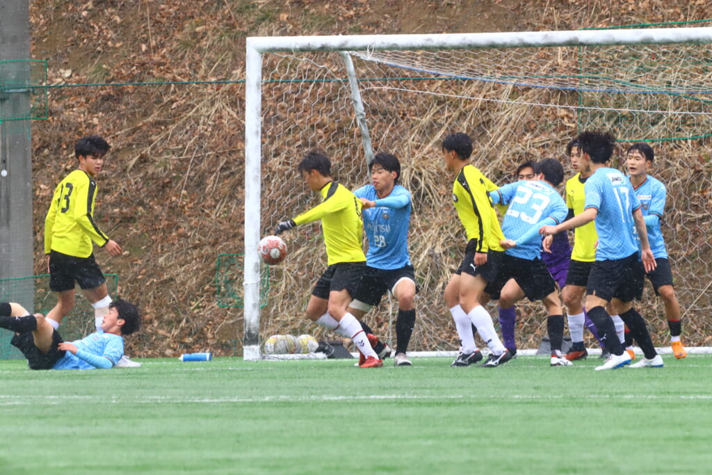 しかし、産業能率大もしっかり最終ラインをコントロール。オフサイドを取り、自分たちのボールにしていきます。