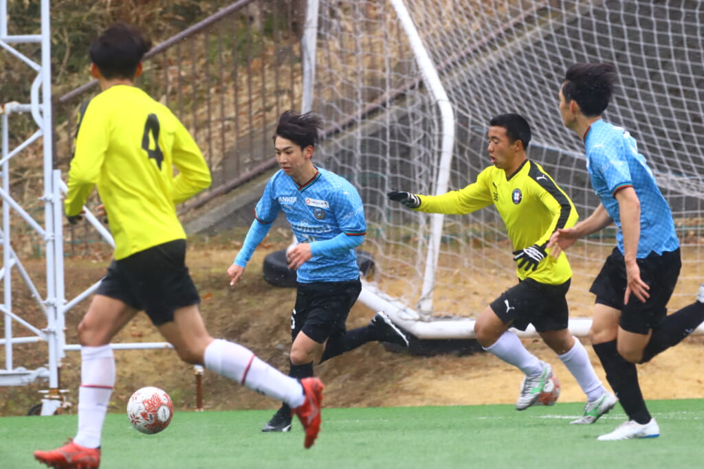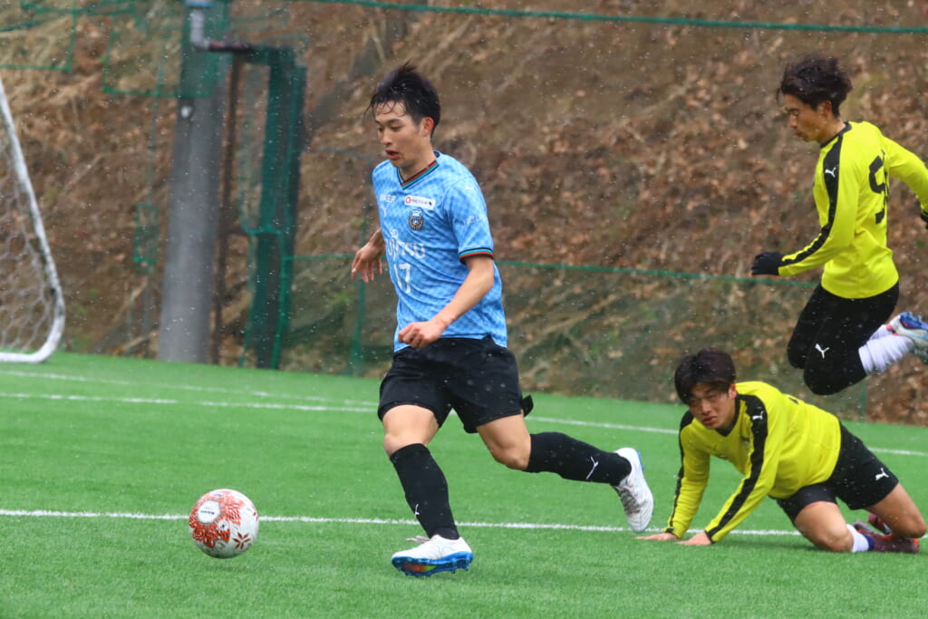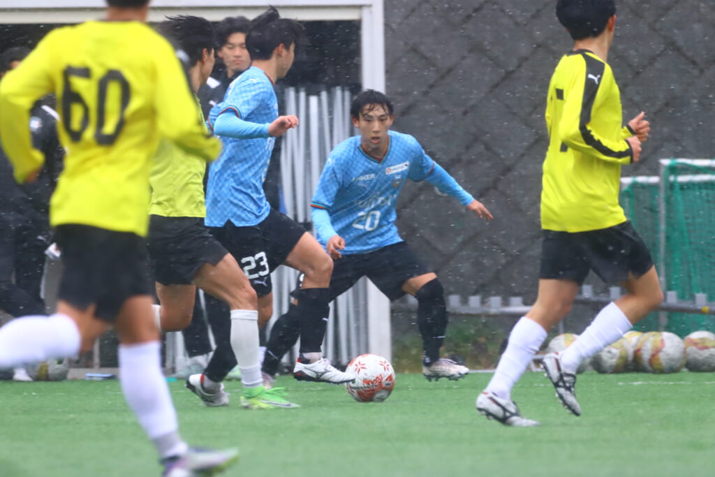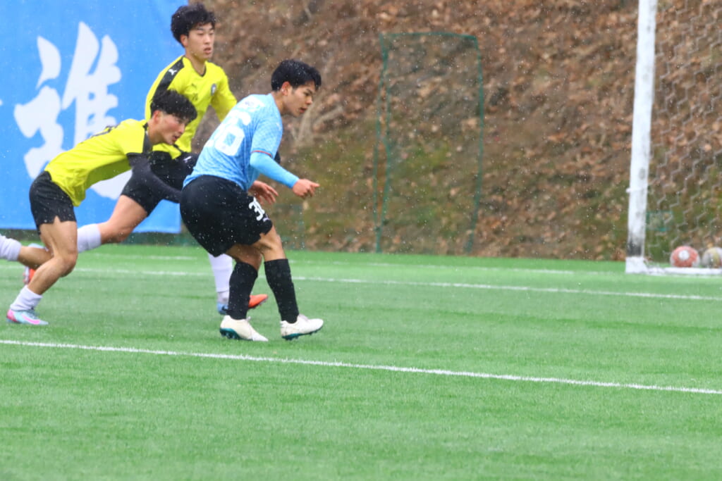 5分には、小川尋斗とのパス交換から木下が正面へ。産業能率大が体を張り阻んだところ、こぼれ球を拾い、間にパスを差し入れながら、つないでいき川村が正面へ。