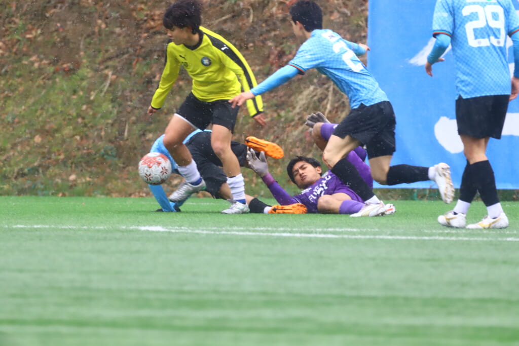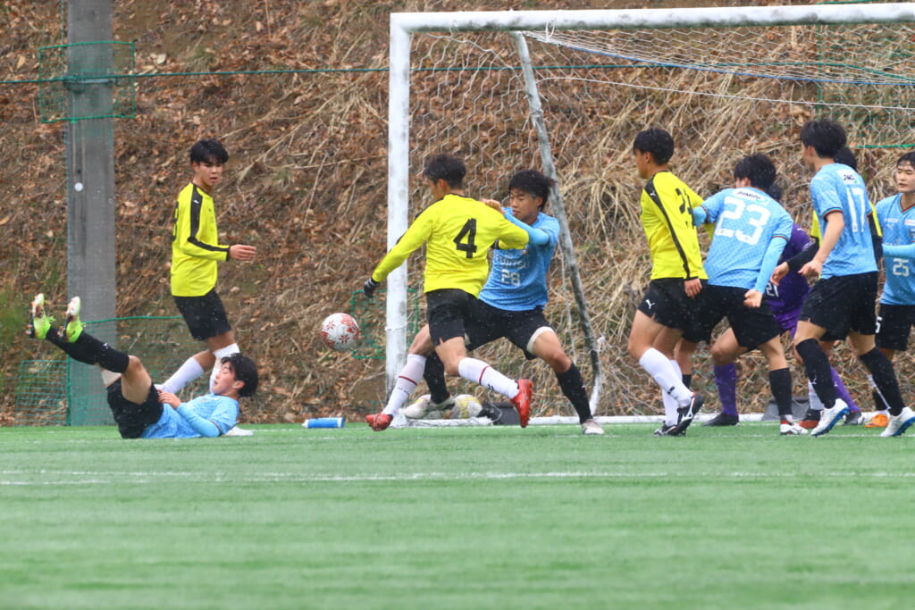 33分には、フロンターレが中央につけてきたところ、カットした産業能率大、左サイドへ展開。56がクロスを入れていきますが、エリア内を小川尋斗がカバー。
