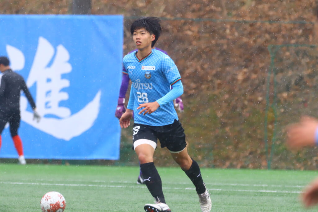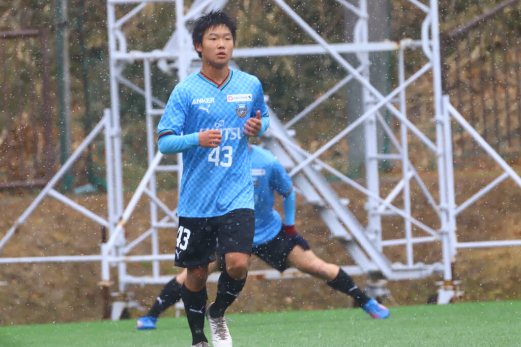 1本目、フロンターレは、GK21岡本栞汰、最終ラインは右から25小川翔太、22山川陽平、28笹倉拓真、23菊池京、ボランチは29今廣遥碧、14小川尋斗、右MF36川村求、左MF20三上瑛大、前線には26木下勝正、17廣瀬寧生。