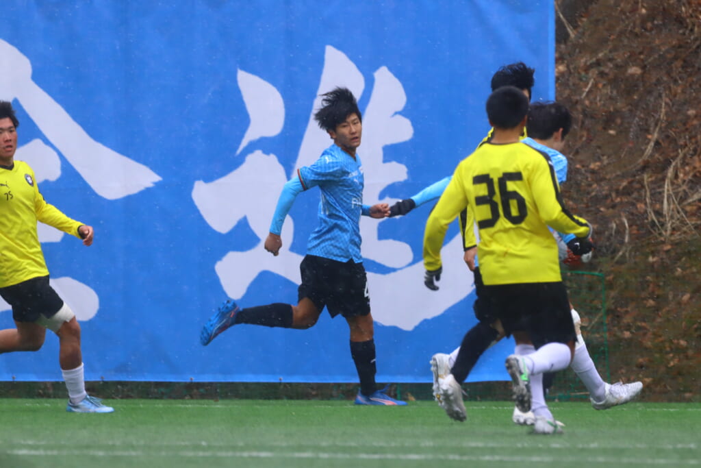 フロンターレは山川の縦パスを、中央下がり目で木下が受けるなどして、そこから産業能率大の陣内でプレーする時間をつくり、35分には、小川尋斗、菊池、三上がかかわって左サイドで動かし、小川尋斗のパスに抜け出した三上が左サイドから折り返し。