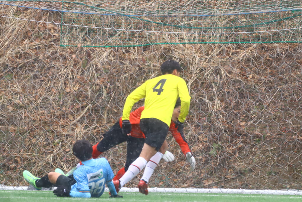 小川翔太はクロスを入れますが、交代で入ったGK28がセーブ。