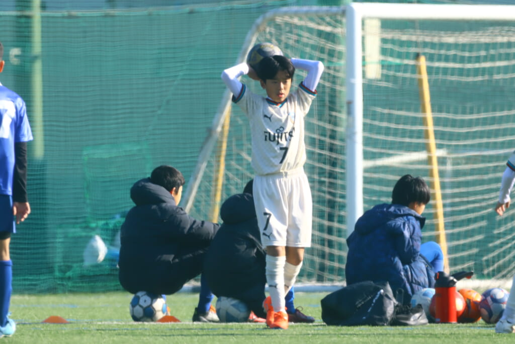 6分には、右サイドでのスローインの流れから43がエリア外右へ。ここはフロンターレが体を張り、ブロック。