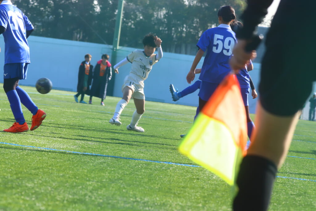 右コーナーキックを得たはるひ野。17が右足で入れると、最後は正面で36がシュート。しかし、フロンターレも体を張り、これをブロック。