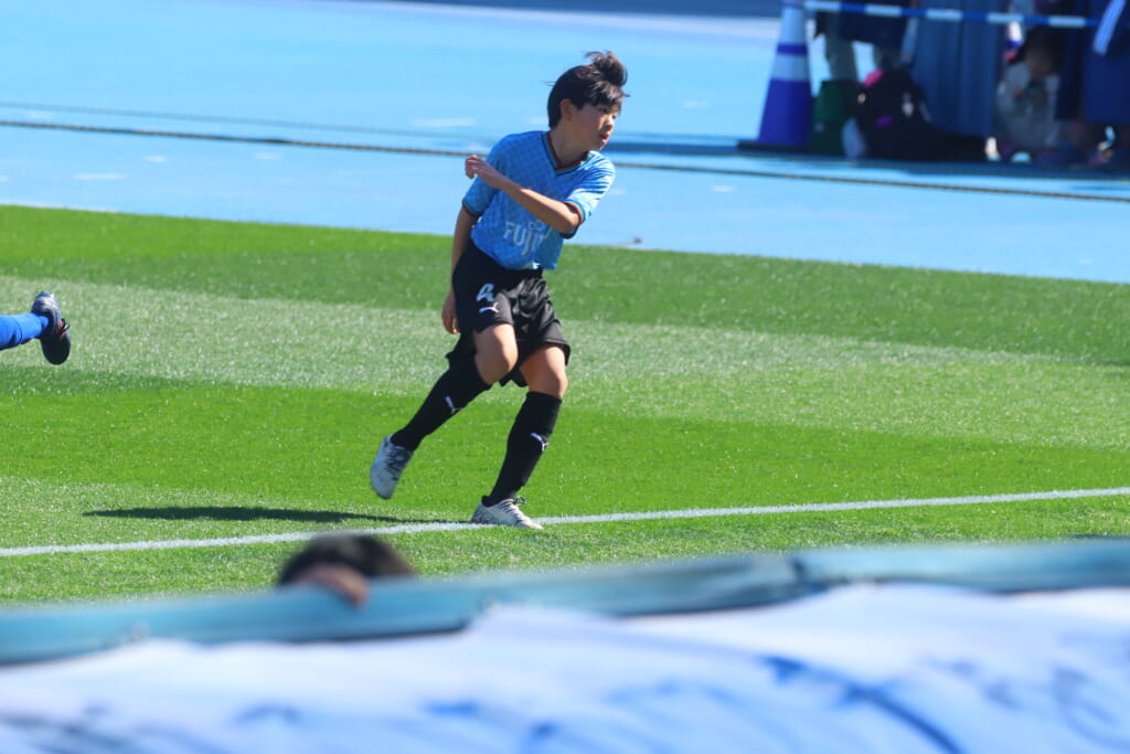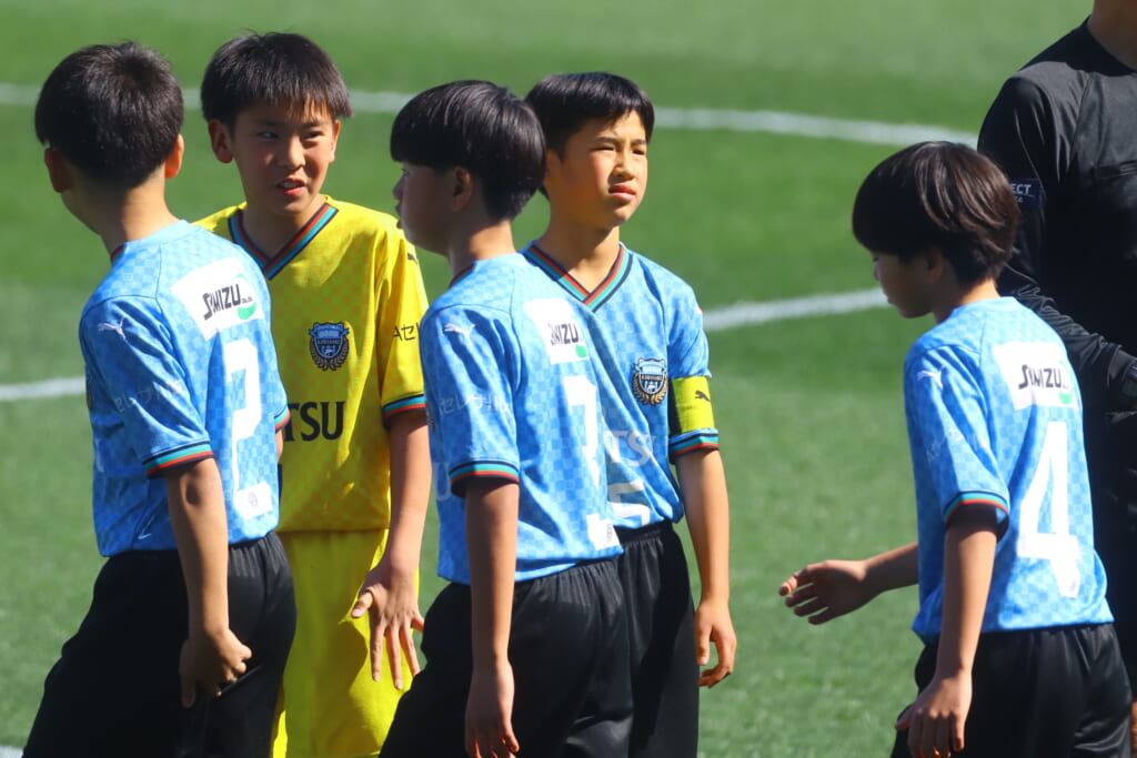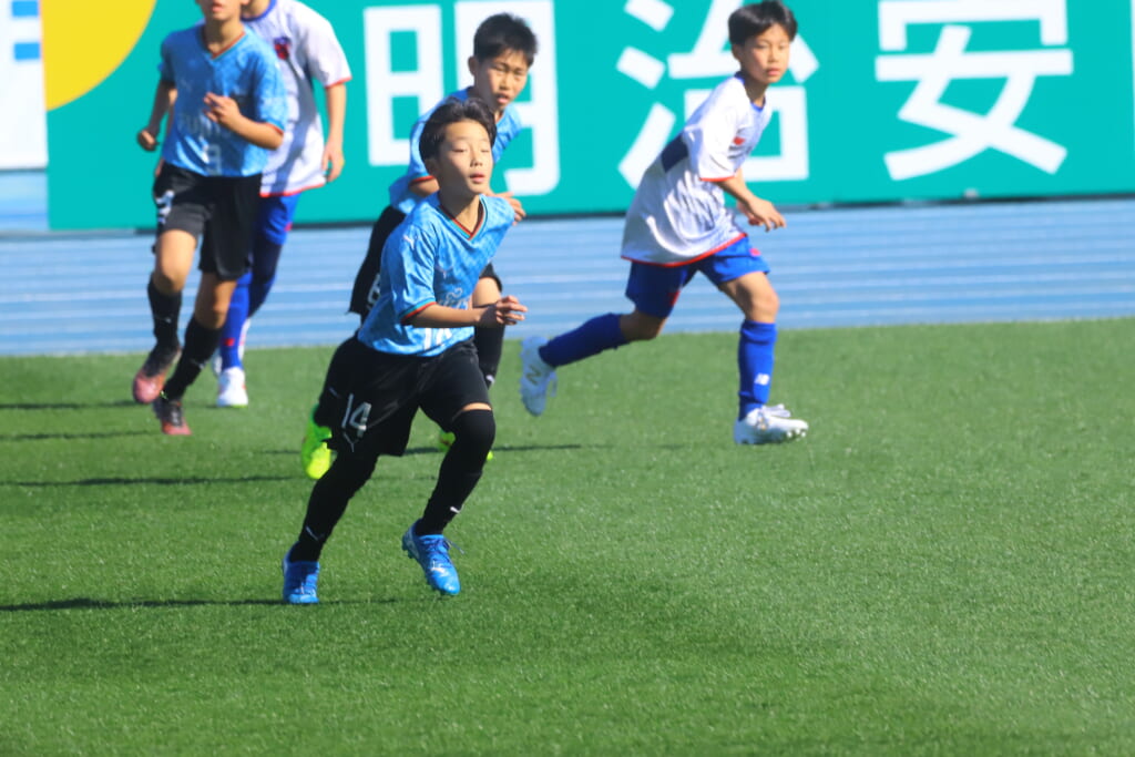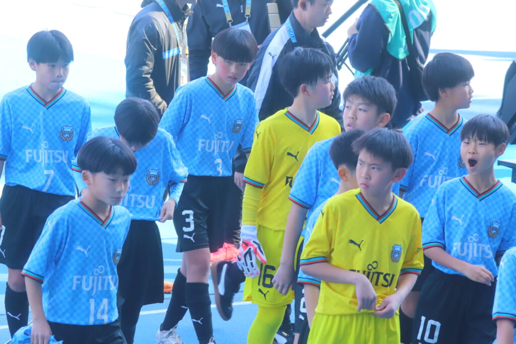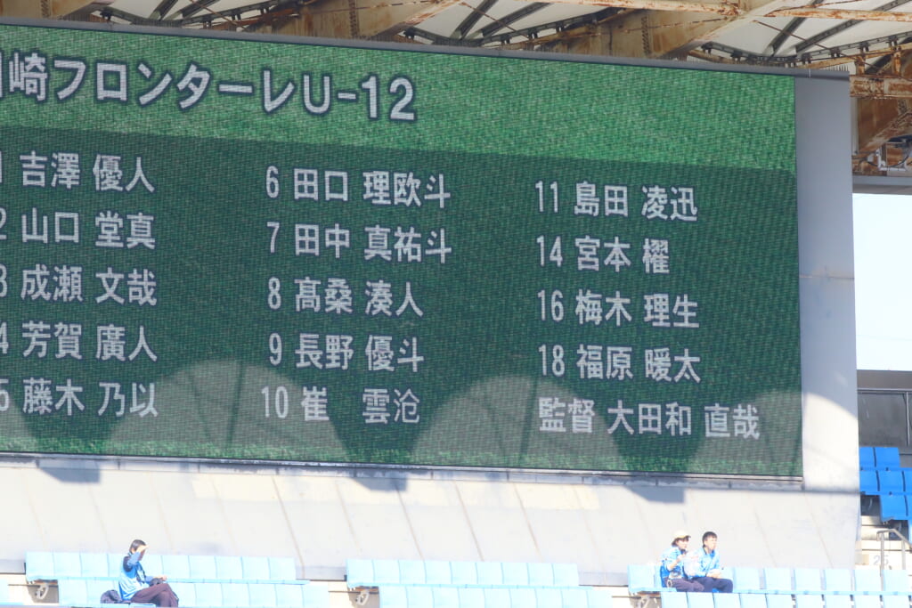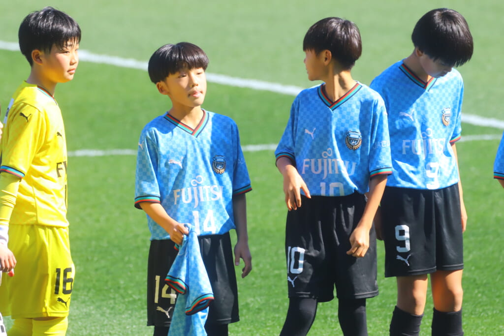 フロンターレの先発は、GK16梅木理生、最終ラインは右からキャプテンの5藤木乃以、新5年の2山口堂真、3成瀬文哉、7田中真祐斗、ボランチは14宮本櫂、8髙桑湊人、右MF4芳賀廣人、左MFは新5年の18福原暖太、前線には9長野優斗、10崔雲沧。