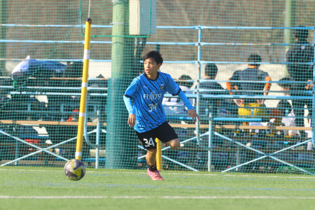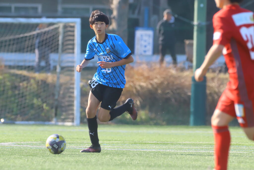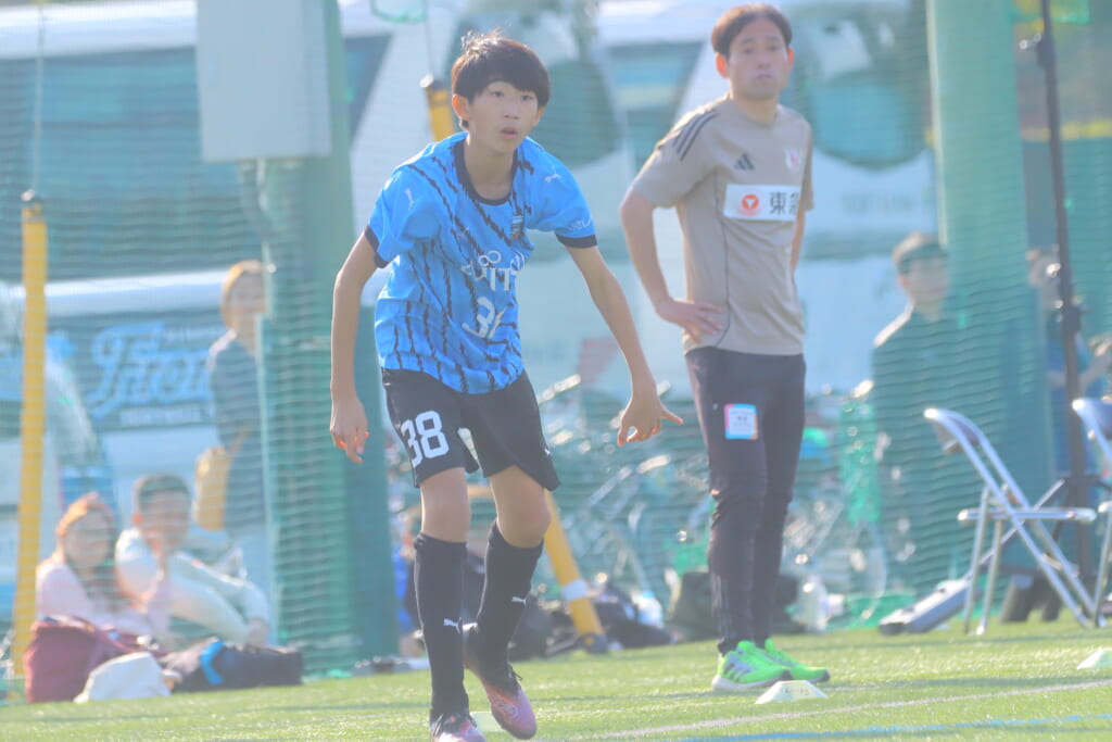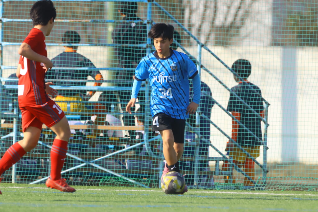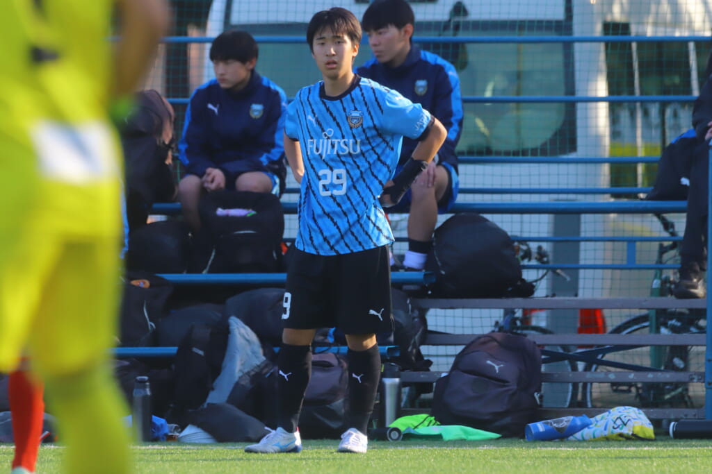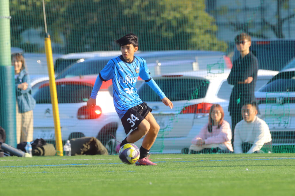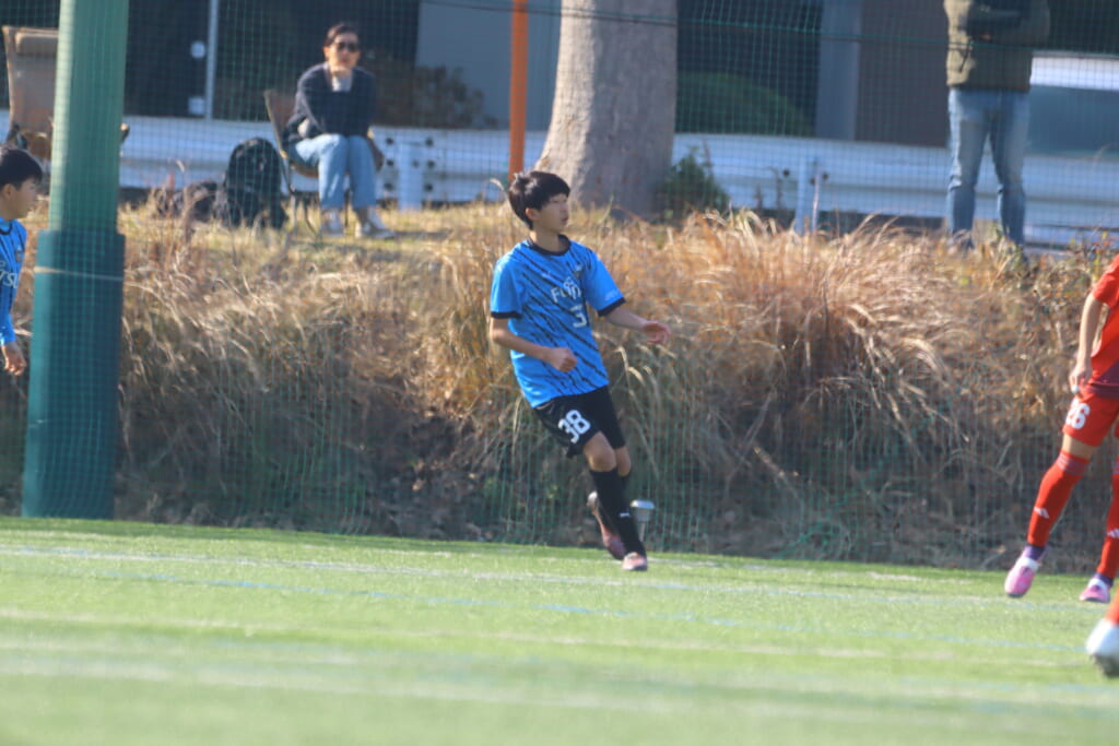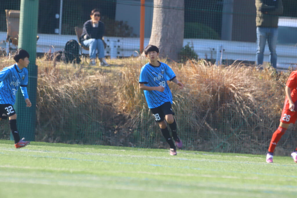 フロンターレ等々力の先発は、GK21山田龍青、最終ラインは右から38羽生吏、24大原颯仁、キャプテンの22小滝悠仁、26上口大遥、ボランチは32大久保晴瑠、29細川惟旭、右MF31相場依空、左MF34穂積樹、トップ下28川埜蒼真、前線には鈴木翔。