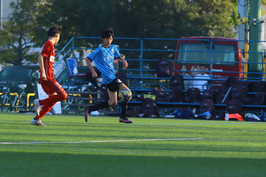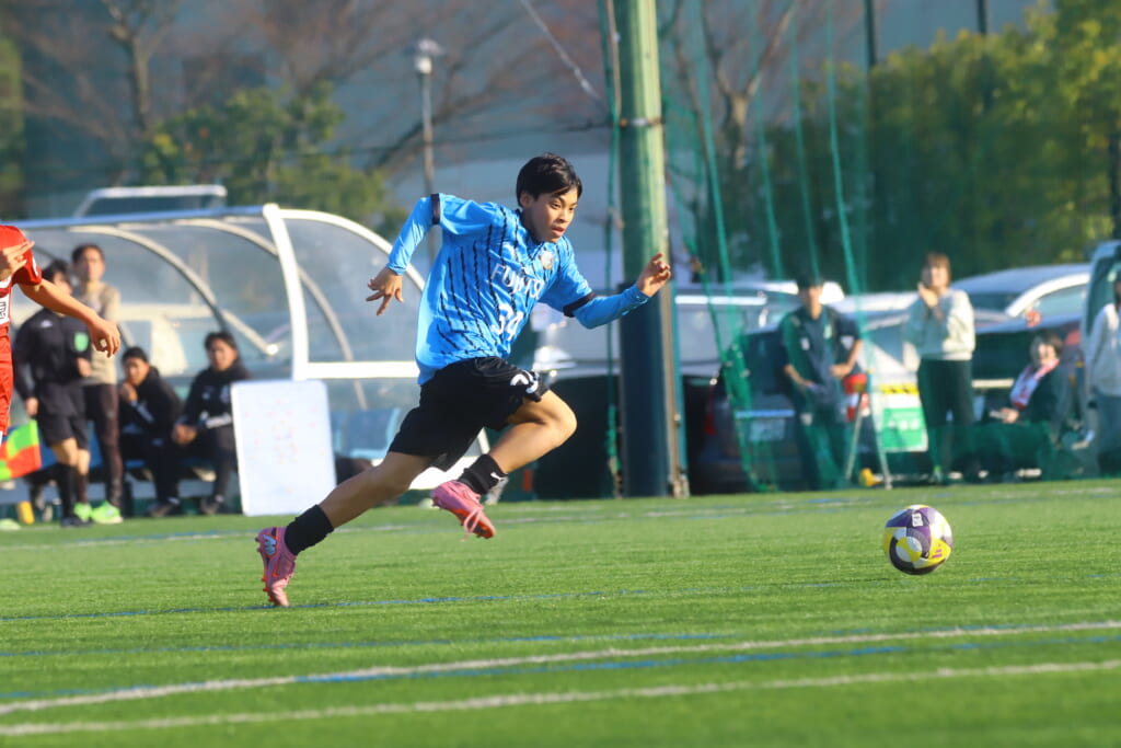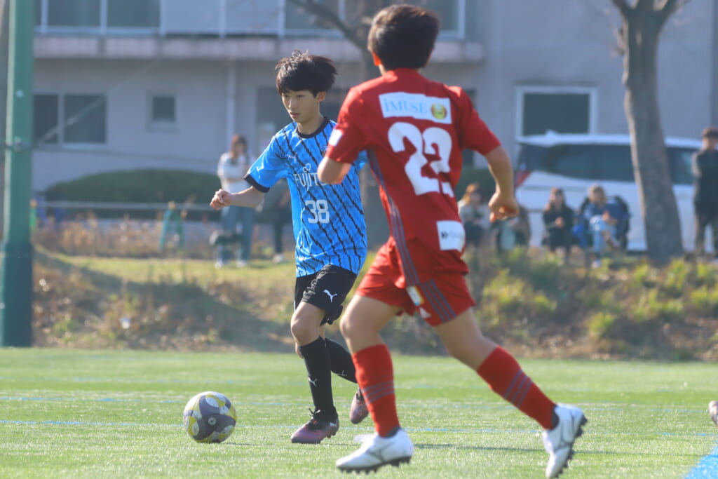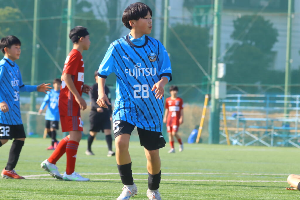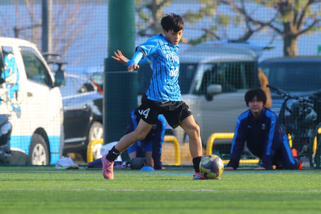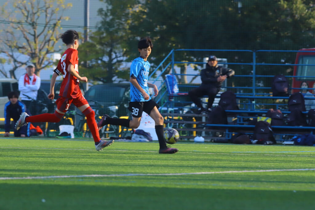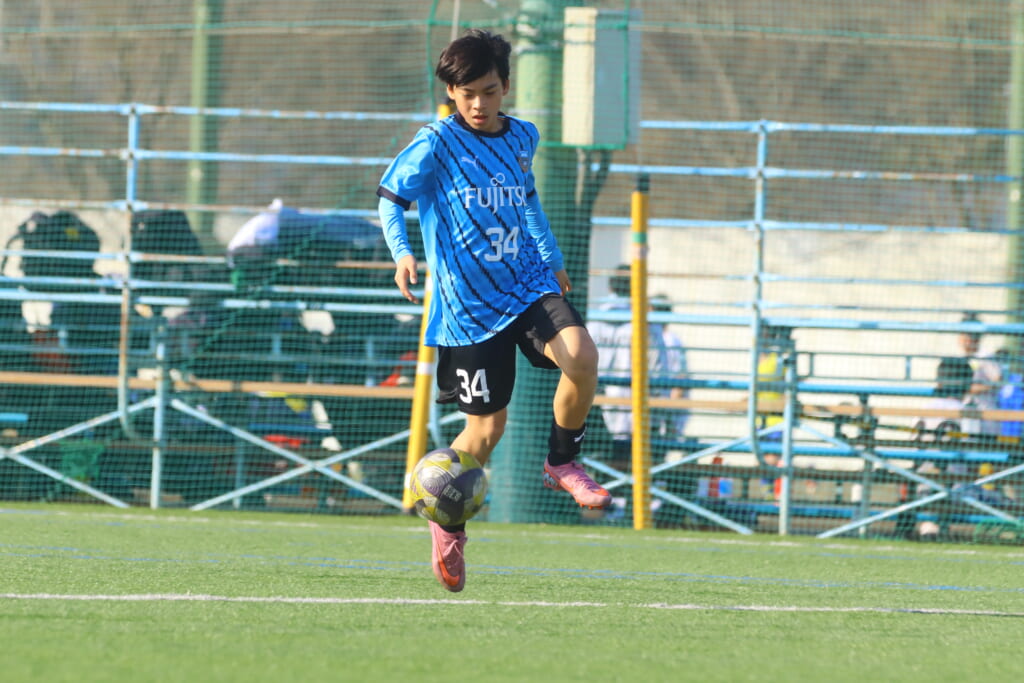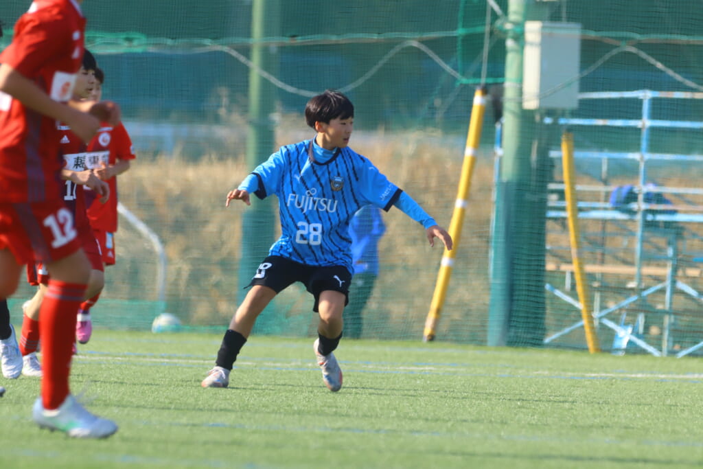 フロンターレ等々力の先発は、GK21山田龍青、最終ラインは右から38羽生吏、24大原颯仁、キャプテンの22小滝悠仁、26上口大遥、ボランチは32大久保晴瑠、29細川惟旭、右MF31相場依空、左MF34穂積樹、トップ下28川埜蒼真、前線には鈴木翔。