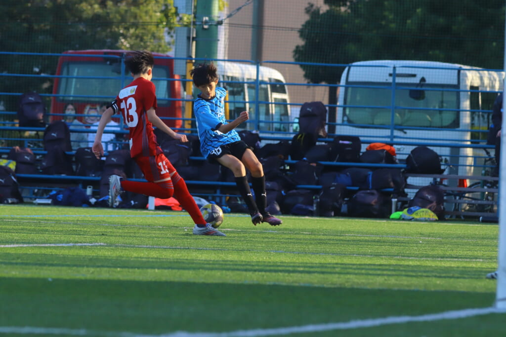 12分にはさらにフロンターレ等々力、右サイド、仕掛けた相場のパスに川埜が抜け出し、エリア右への仕掛け。