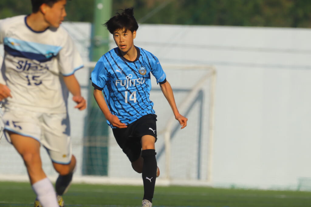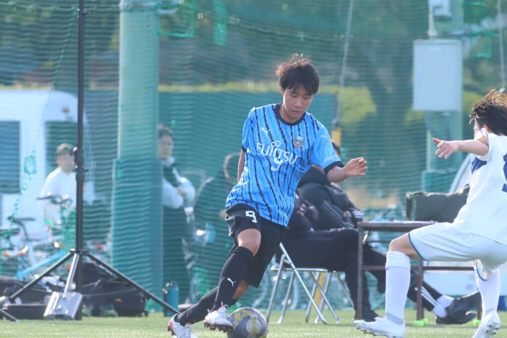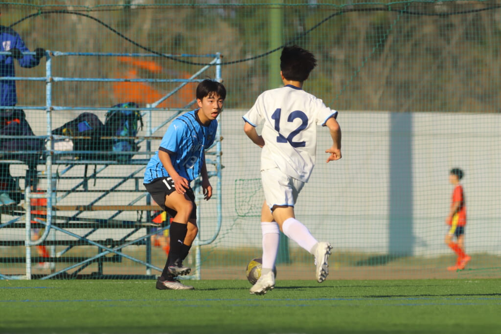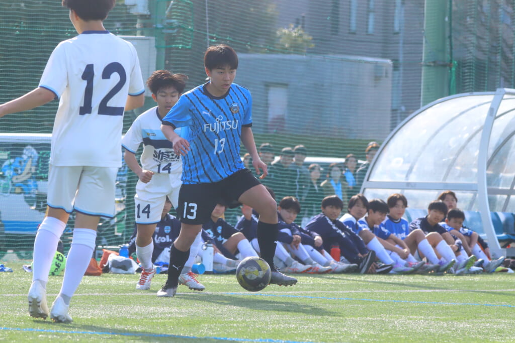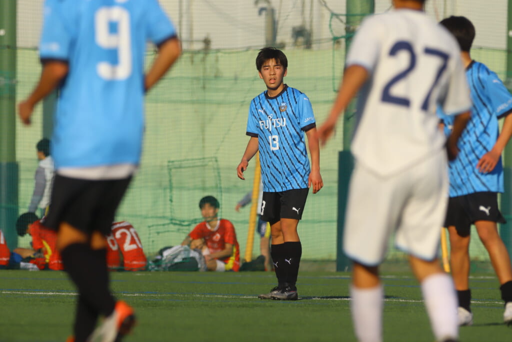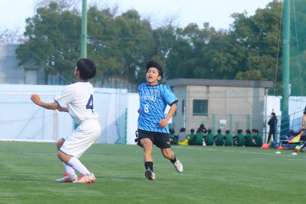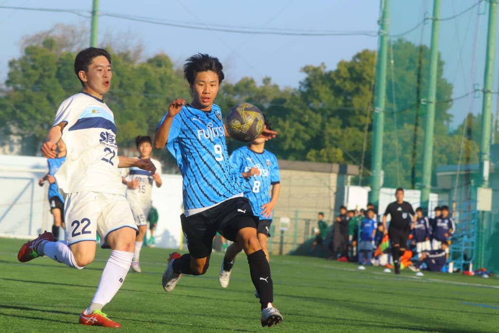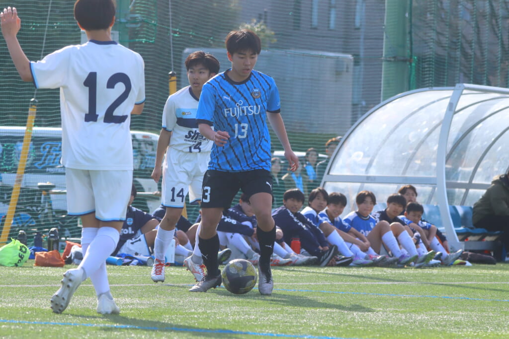 立ち上がり、前に持ち込んでくるシュートJrユースに対しては、西川が対応。間で受けた時松が前に持ち込み、熊谷へ。中央でつなぎ、熊谷は浮き球のパスを入れるなど、前に出る姿勢を見せていくフロンターレ等々力。