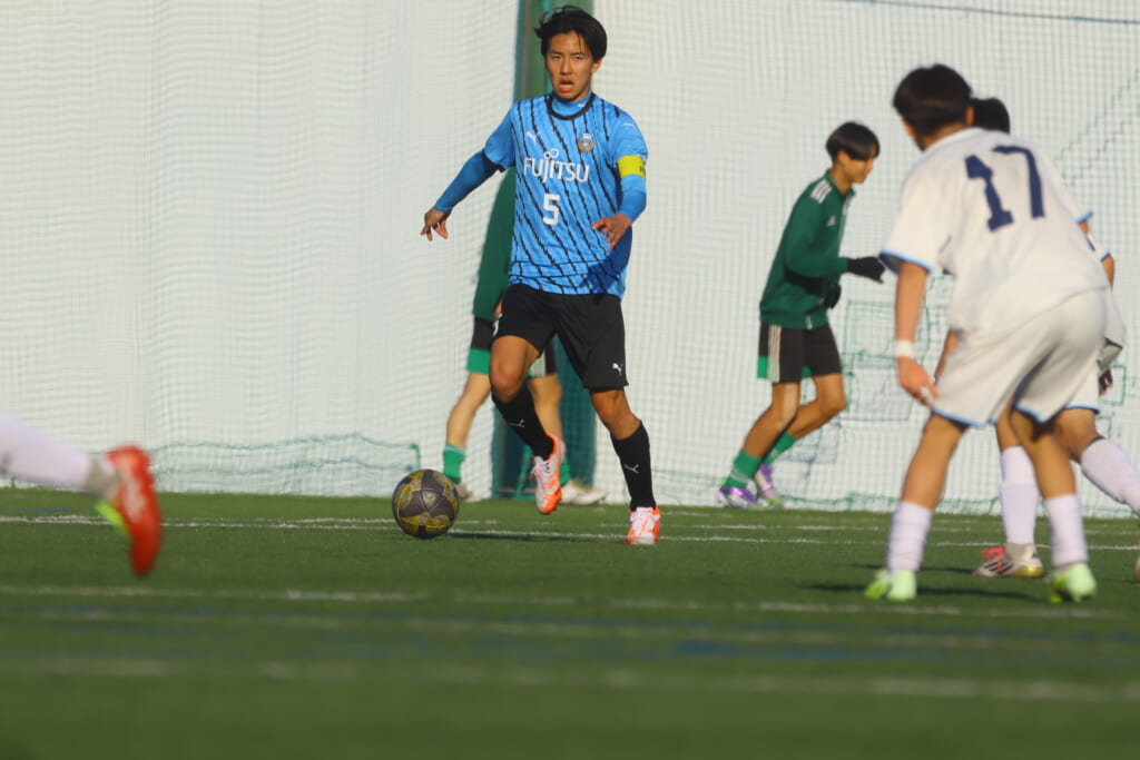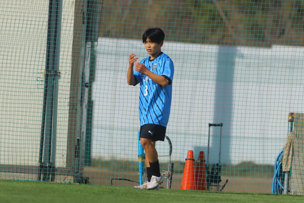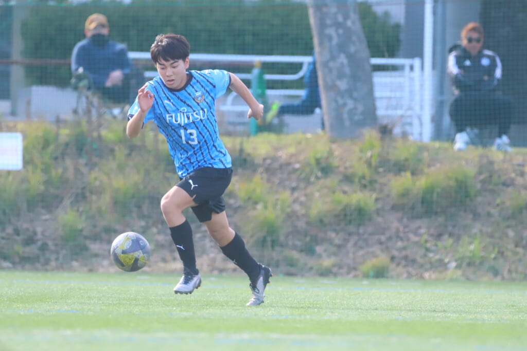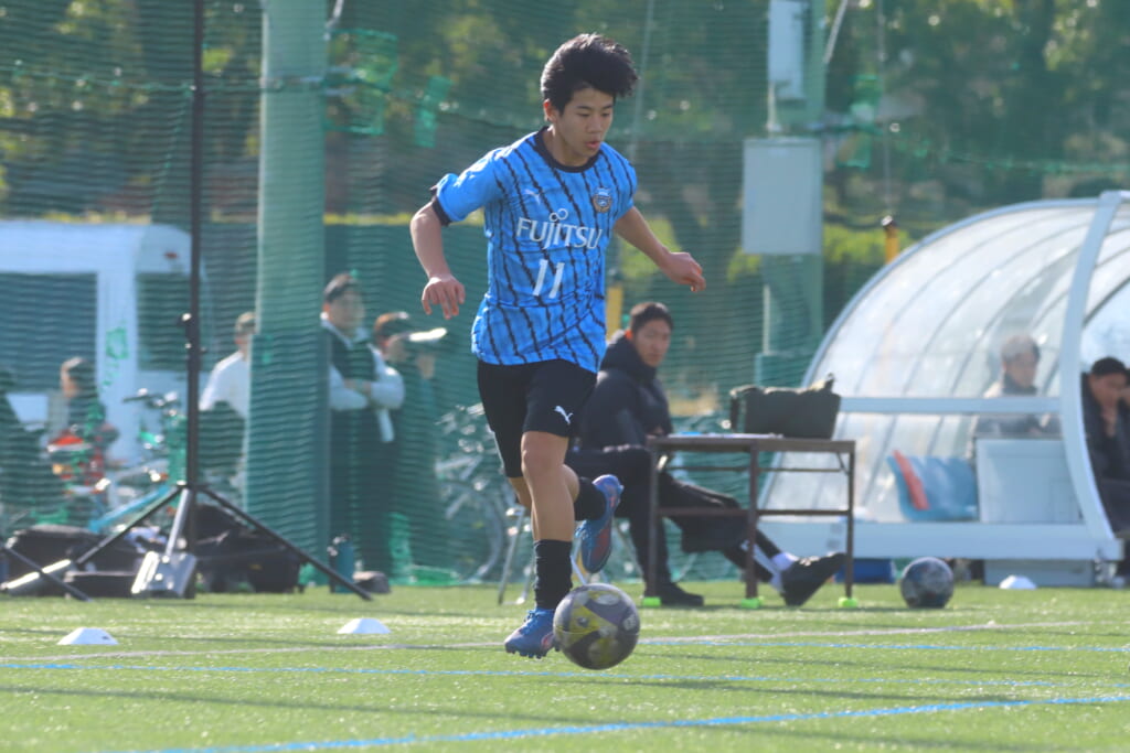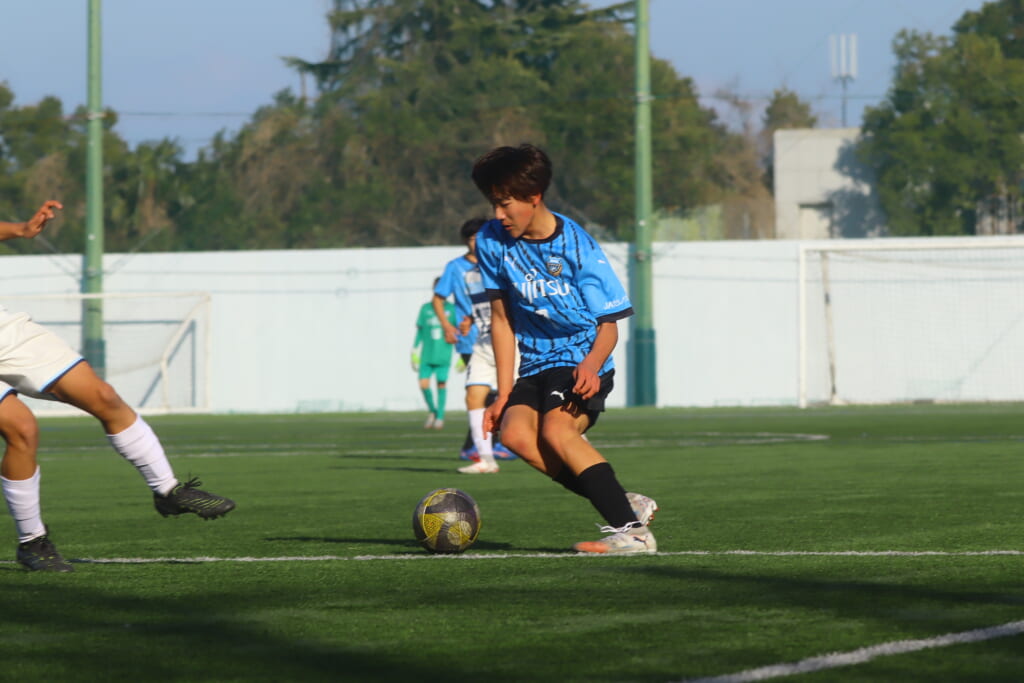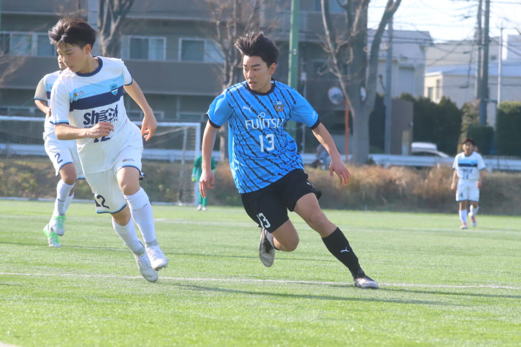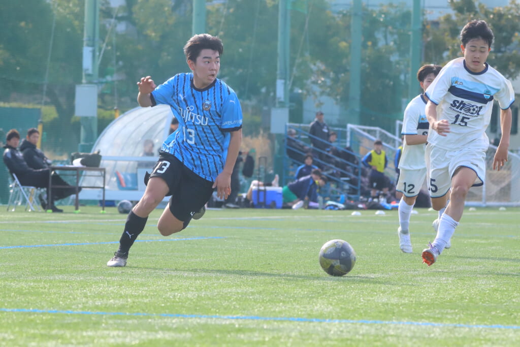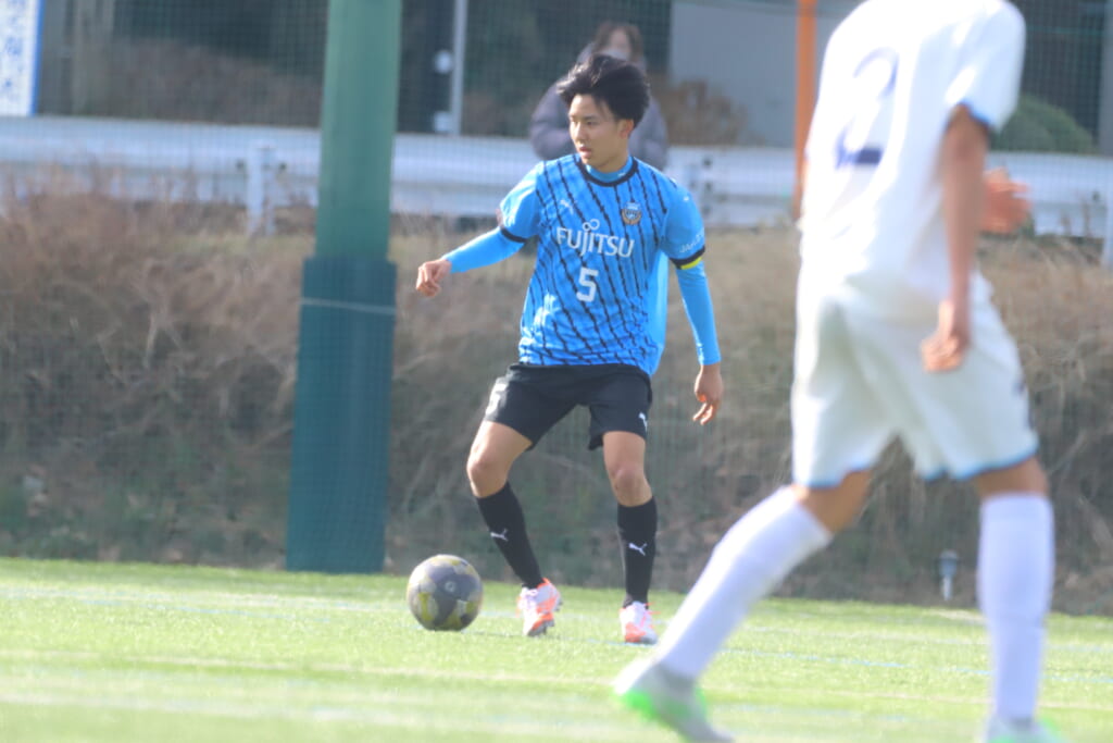 立ち上がり、前に持ち込んでくるシュートJrユースに対しては、西川が対応。間で受けた時松が前に持ち込み、熊谷へ。中央でつなぎ、熊谷は浮き球のパスを入れるなど、前に出る姿勢を見せていくフロンターレ等々力。