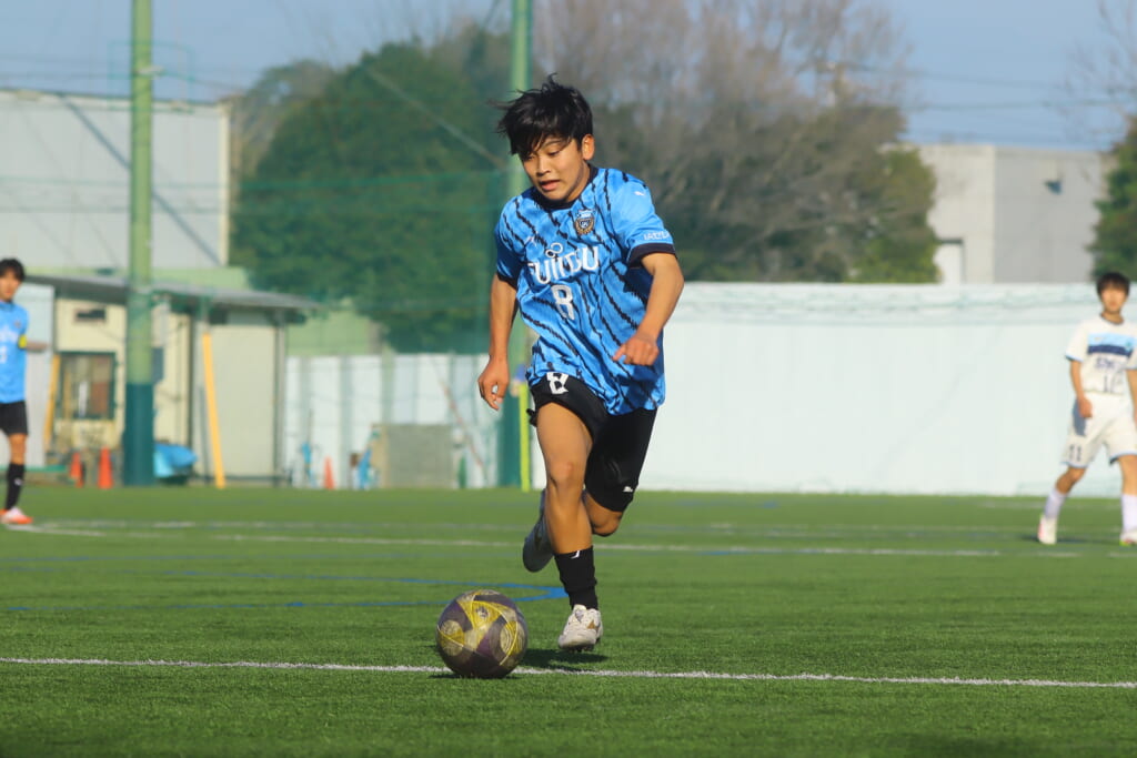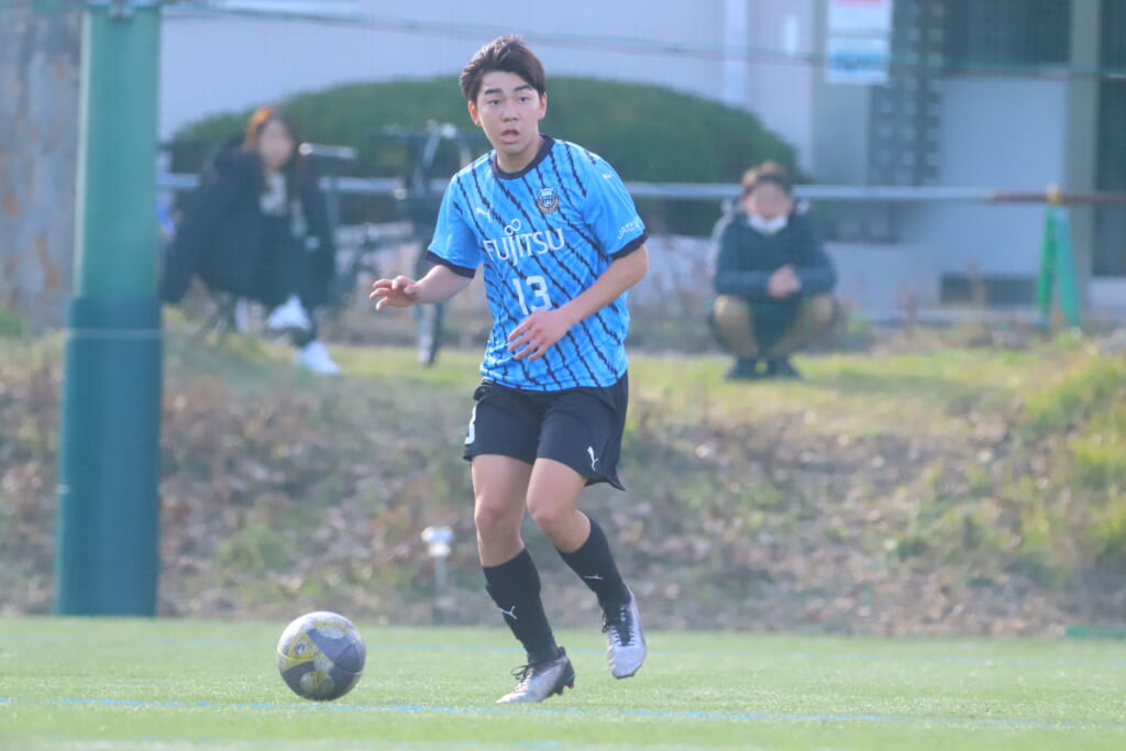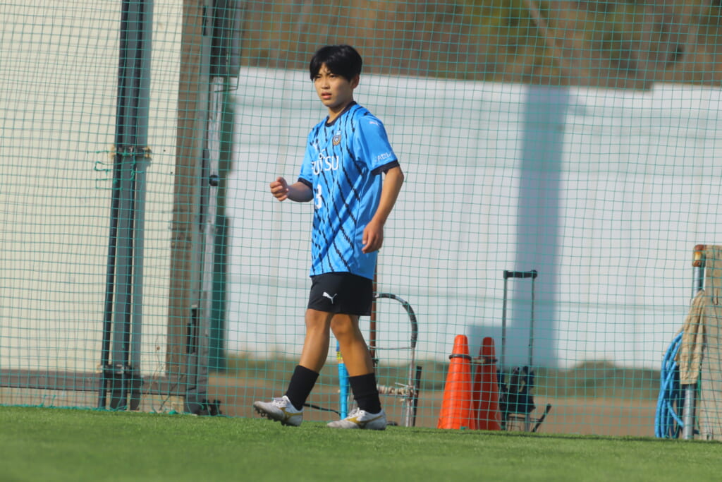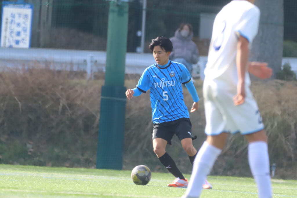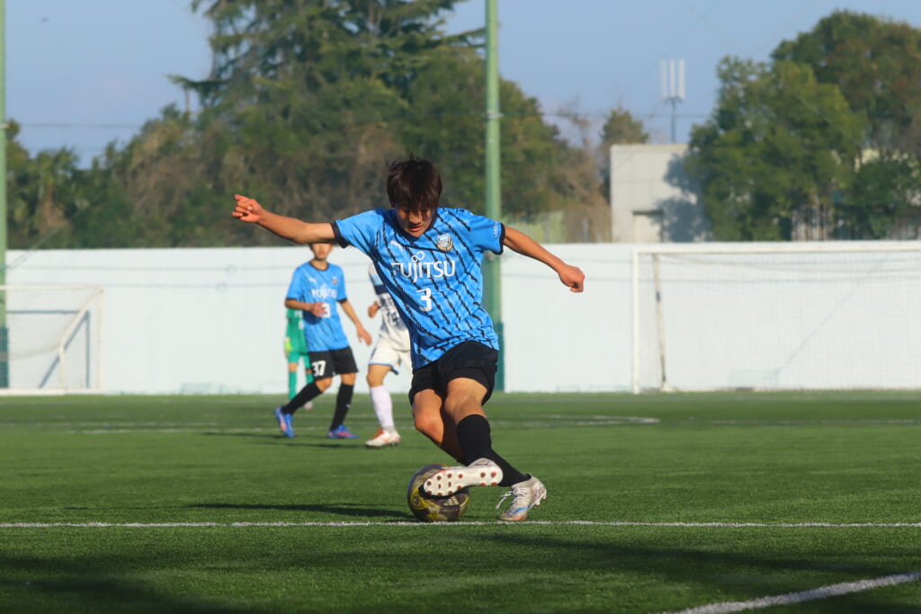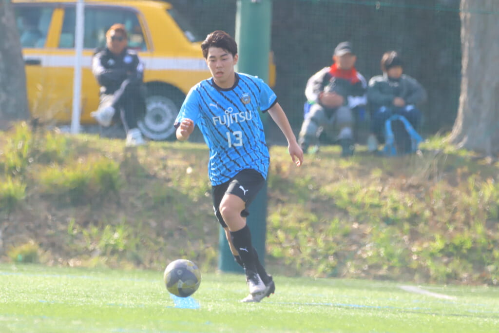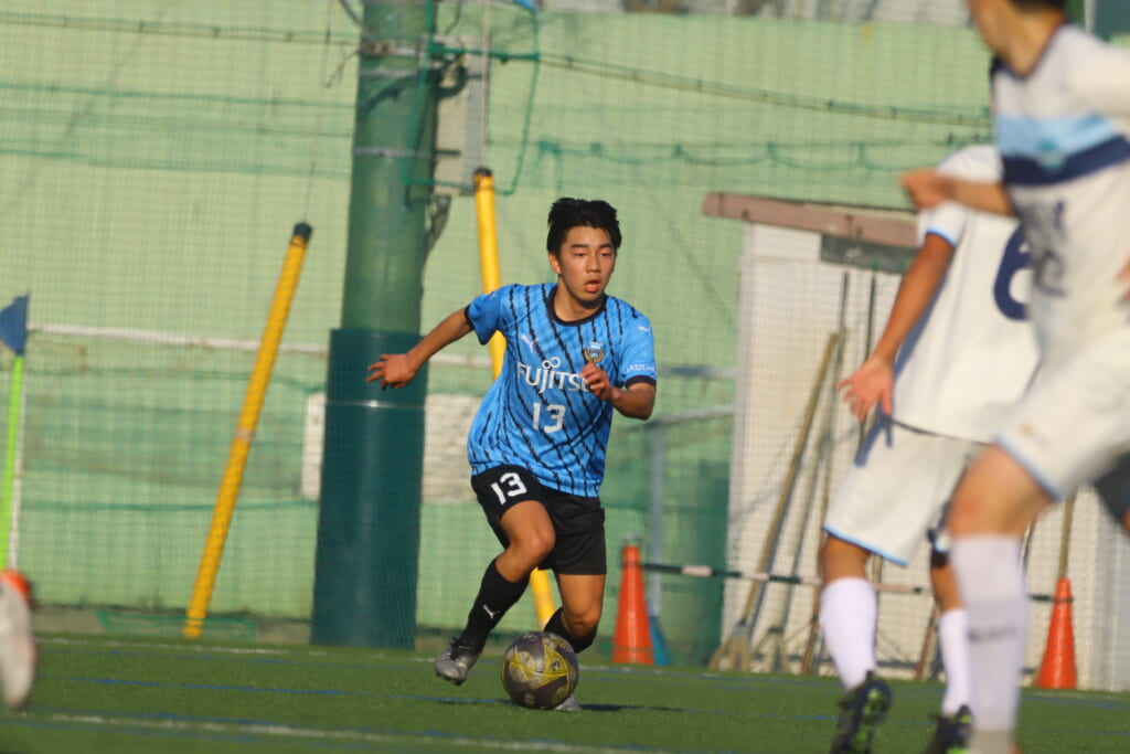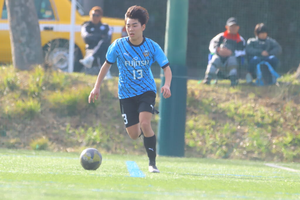 立ち上がり、前に持ち込んでくるシュートJrユースに対しては、西川が対応。間で受けた時松が前に持ち込み、熊谷へ。中央でつなぎ、熊谷は浮き球のパスを入れるなど、前に出る姿勢を見せていくフロンターレ等々力。