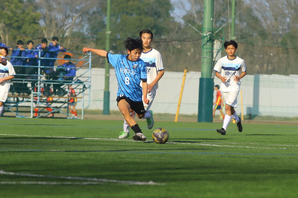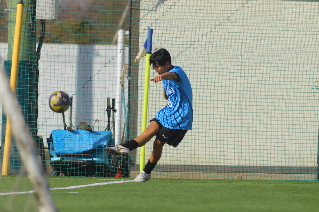 セカンドボールを拾ったシュートJrユースは、狩野がセンターサークル付近からシュート。左にそれ、枠をとらえることはできなかったものの意欲的にゴールを狙っていきます。
