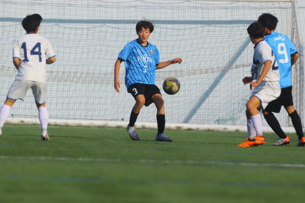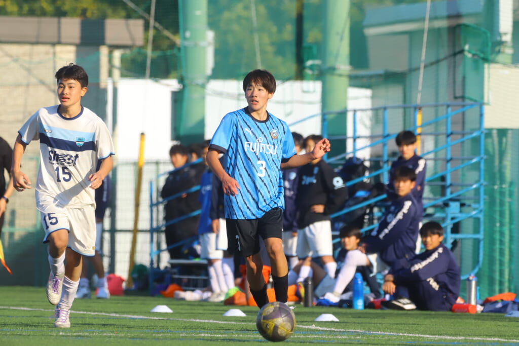 追いかける展開となったシュートJrユースは前に持ち込もうとしていきますが、それをカットしたフロンターレ等々力は、大寺が中央間で受け、右サイド、岩田陸叶へ。前に仕掛けようとした岩田陸叶に対しては、シュートJrユースの対応があり、右サイドでのスローインに。