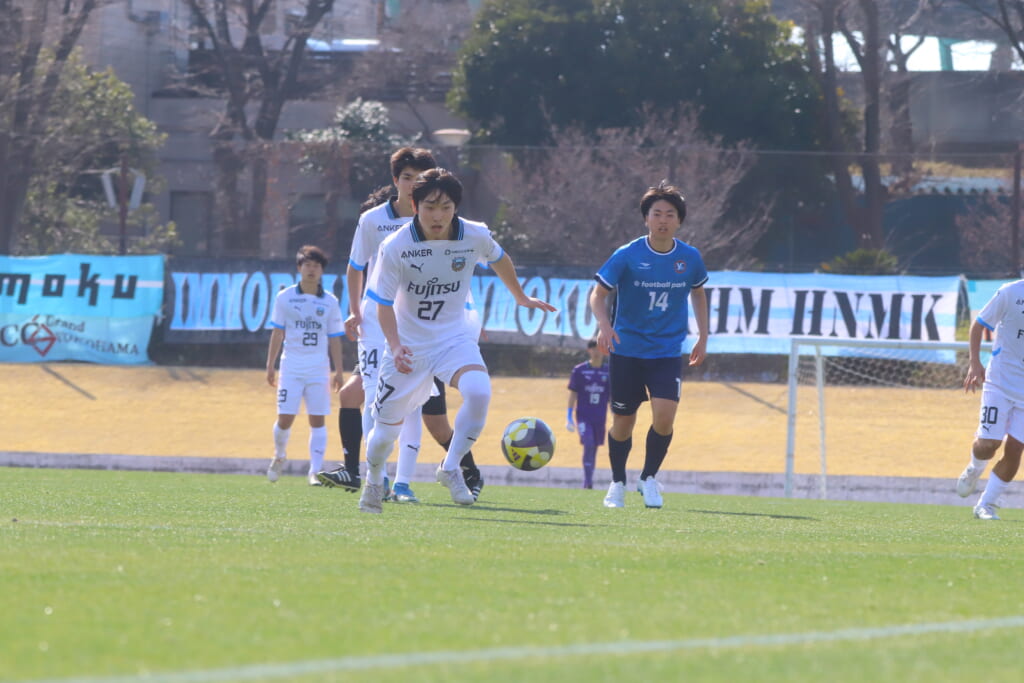 セカンドボールを拾ったフロンターレは、今廣から受けた武内が右サイドから中央へ持ち込むなど、YSCCの陣内でプレーする時間をつくっていくと、24分には、中野から荒井と中央でつながり、左サイドへ展開。小川翔太のパスに全がエリア正面左へ抜け出し、シュート。