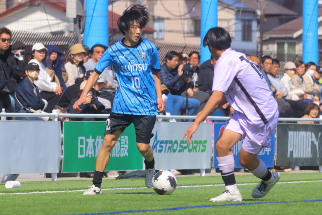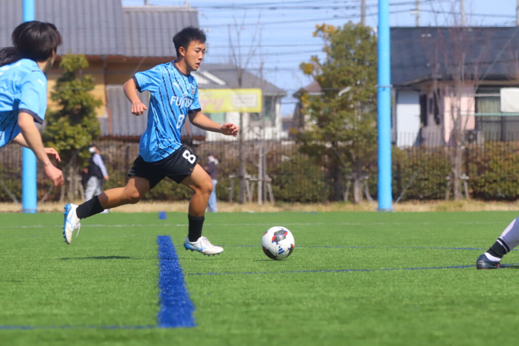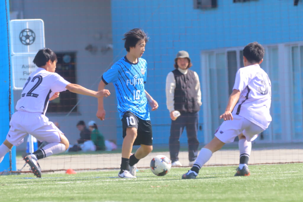 髙橋、徳政が右サイドでかかわり、徳政のパスに中島温が高い位置へ。相手の対応に遭っても粘り強く前からプレスをかけていくフロンターレ生田。